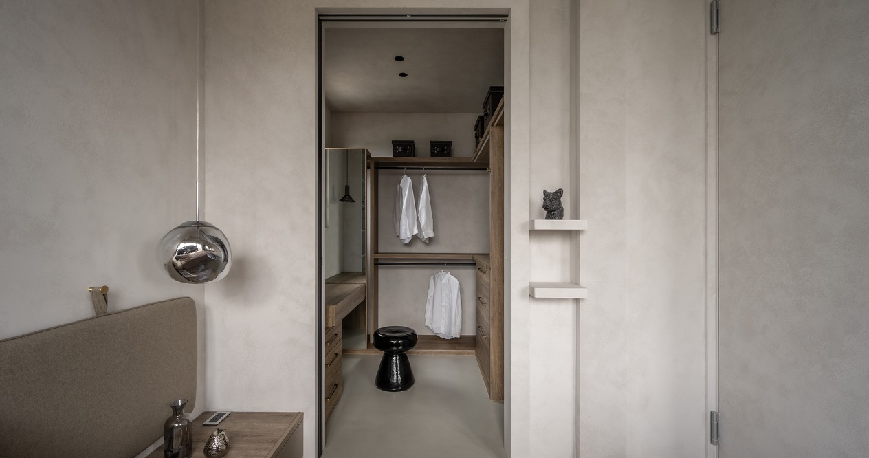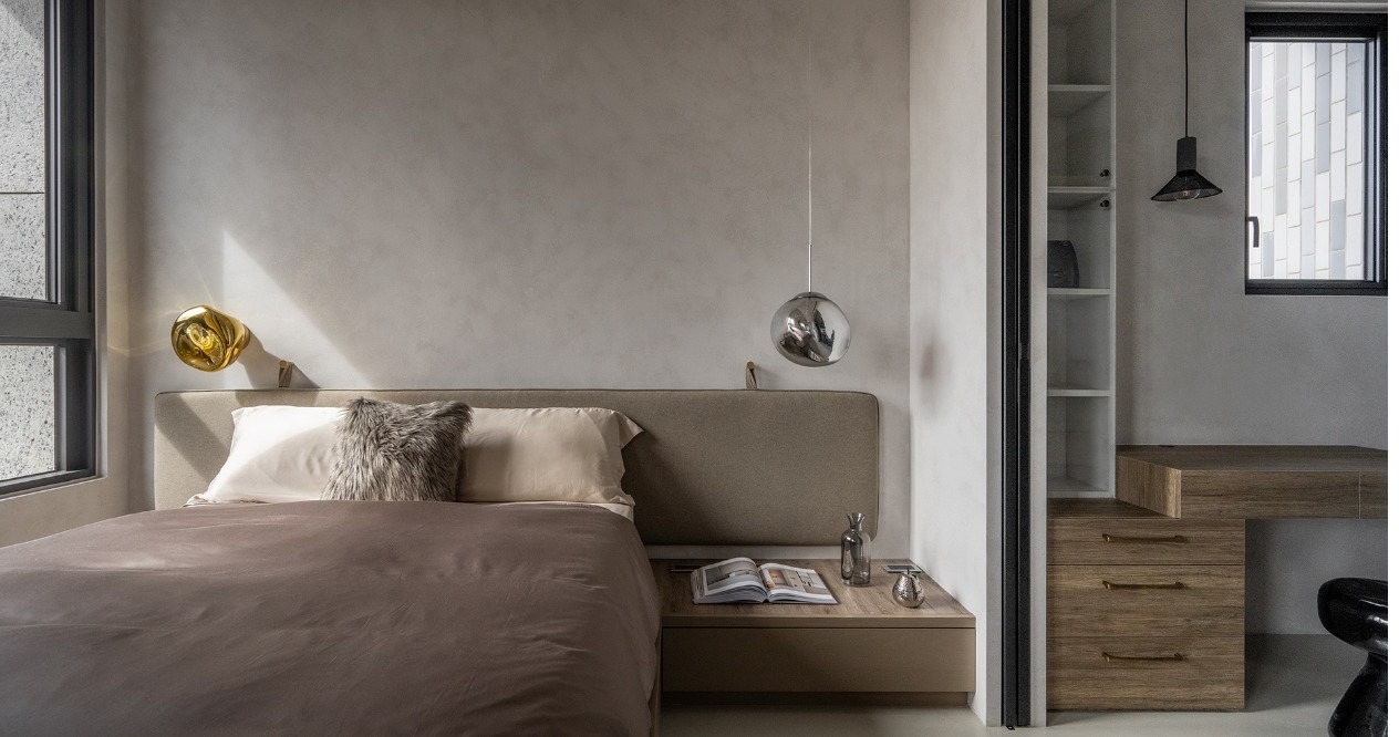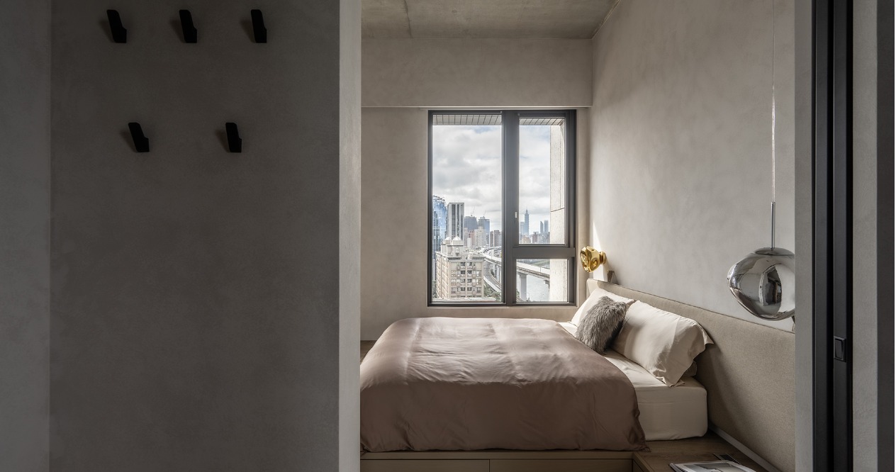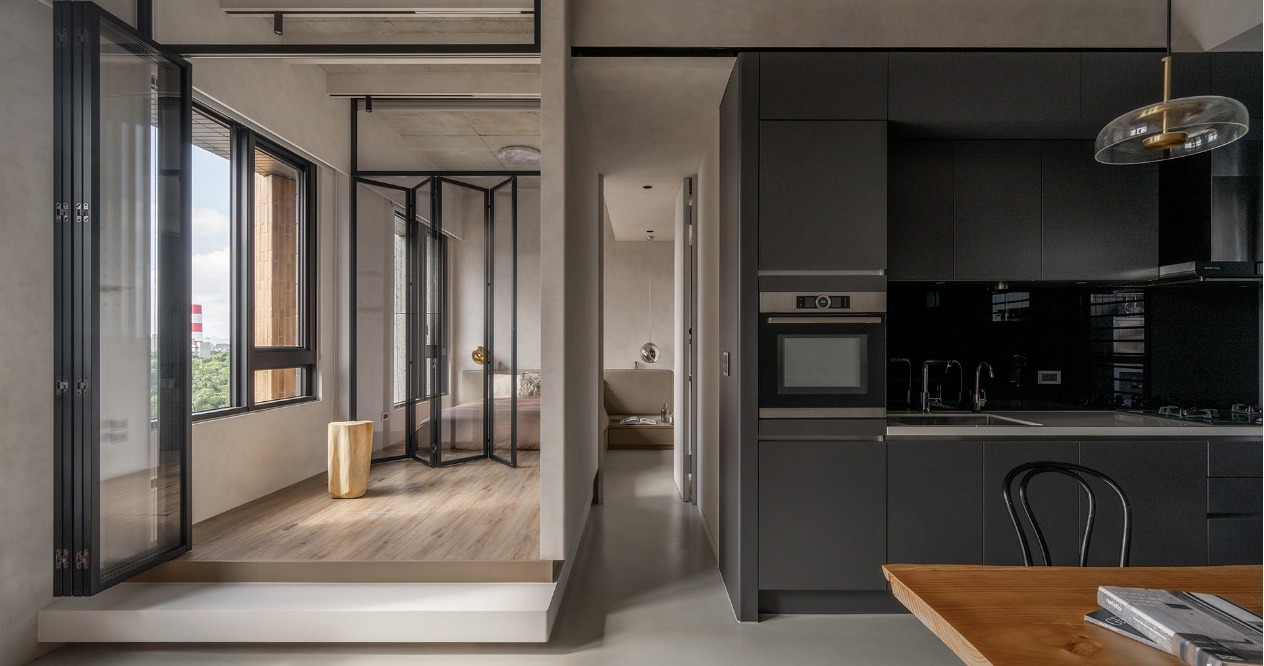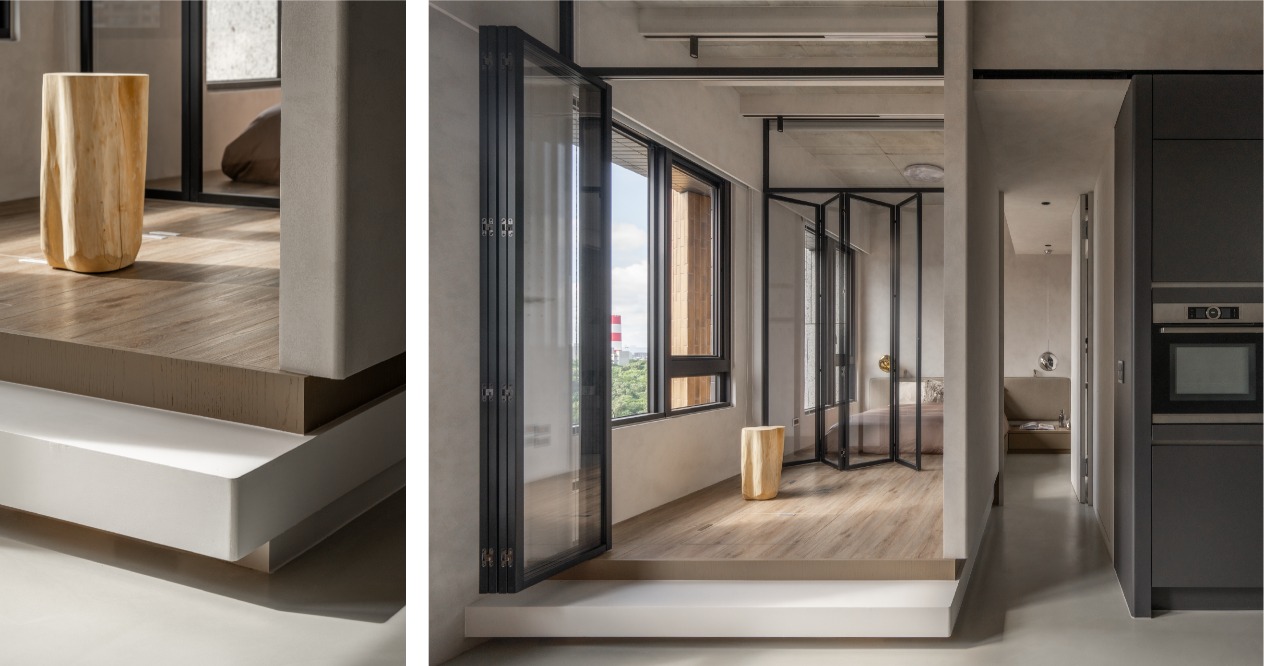 臥式與多功能房採用架高的形式,滿足收納的需求,高低差則以前後進退的踏階設計,利用此手法營造出穿插的視覺效果,從而減少了空間的厚重感,使架高的量感較有趣味性。並以透明拉門作為隔間,使大量採光可以流動於室,享受絕佳的視野和採光。