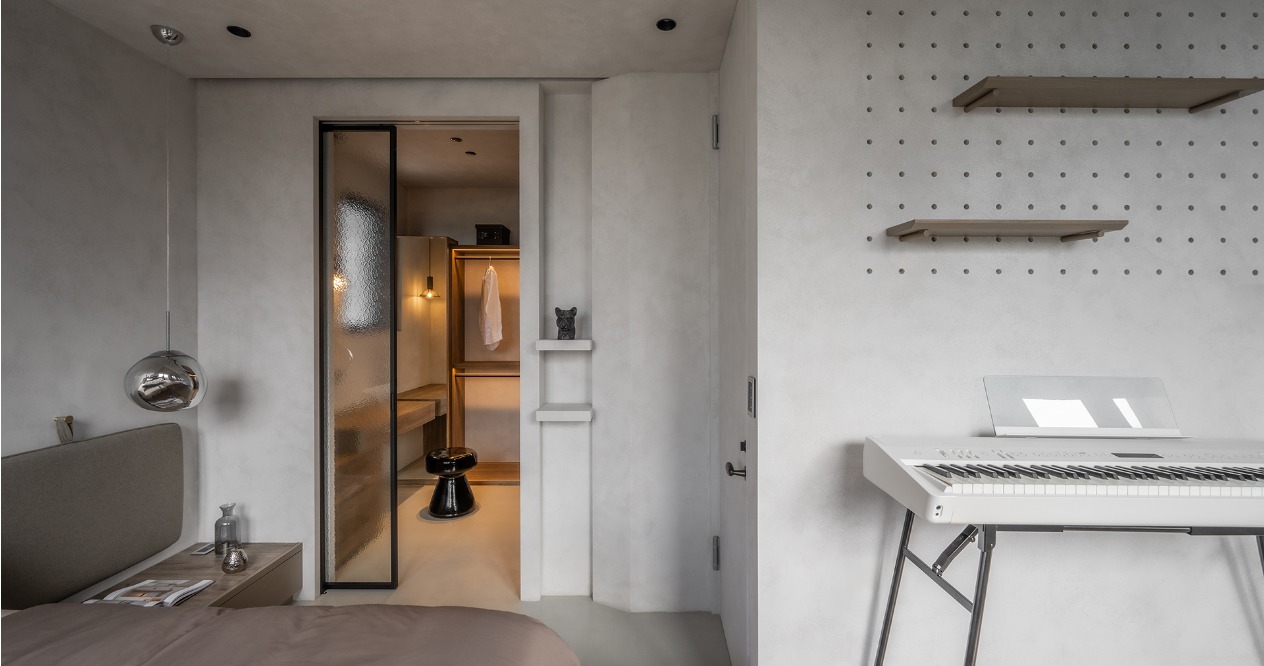 起初業主提出擺放樂器、腳踏車與增設電器櫃的需求,於是在玄關處規劃洞洞板取代實牆,並在後方銜接電器櫃,活化空間坪效,也界定出場域。