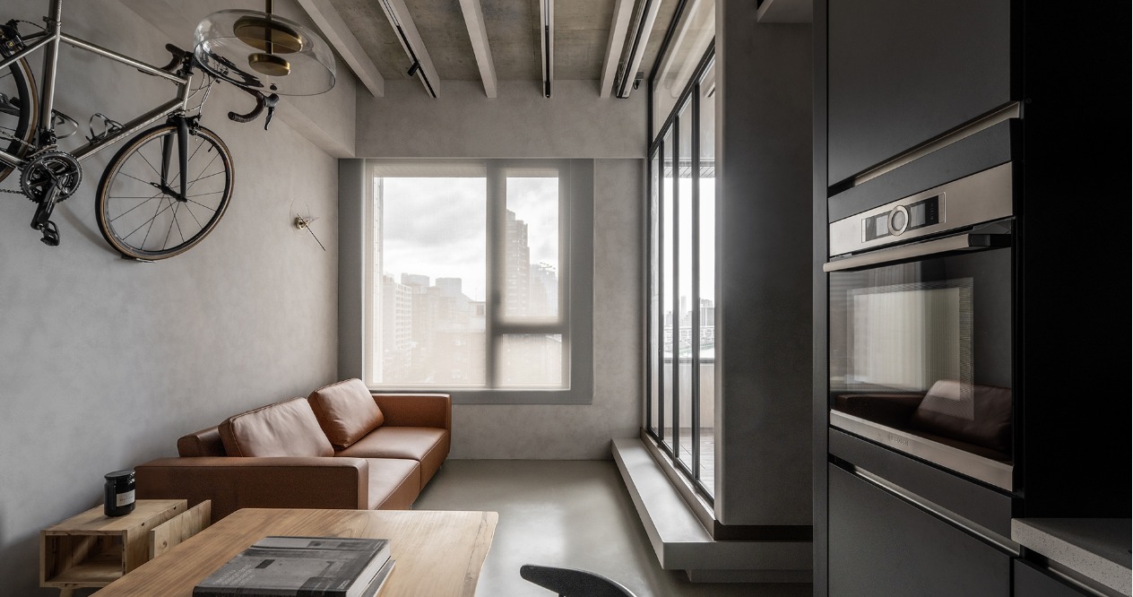 風格上,以屋主喜好的工業風為發想,保留原先的天花板,並刻意在裸露的天花上增設橫梁,藏匿電線外藉此達到延伸效果也成為最醒目的裝飾。