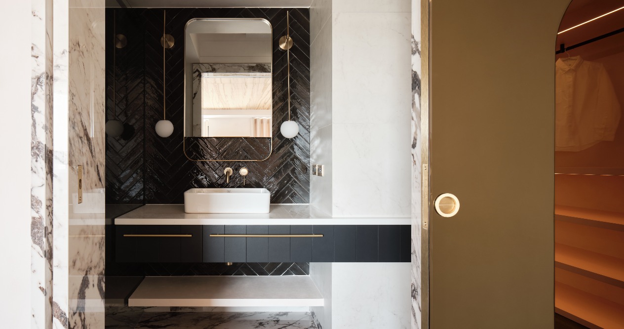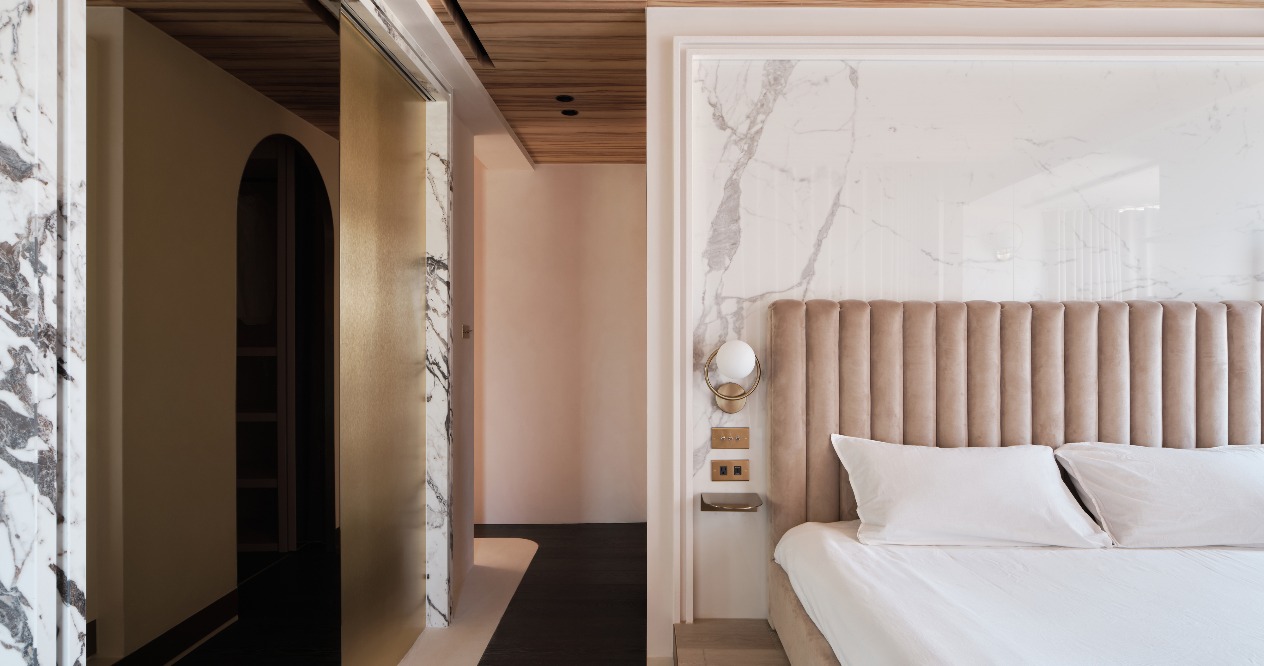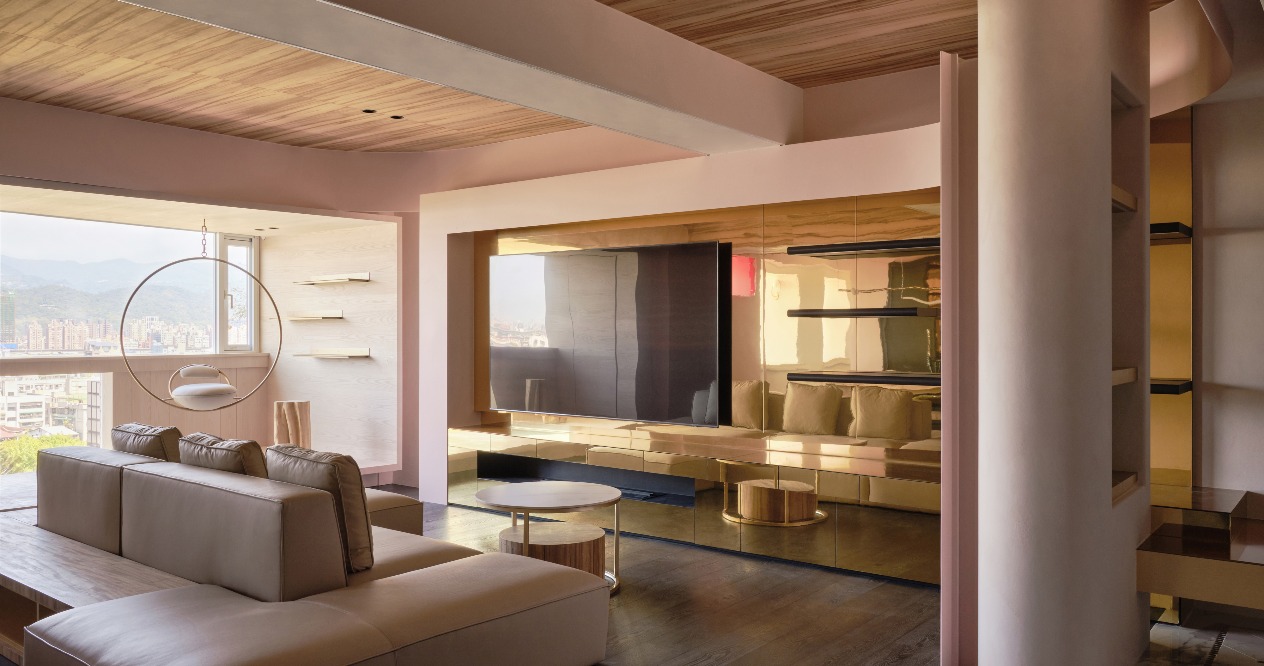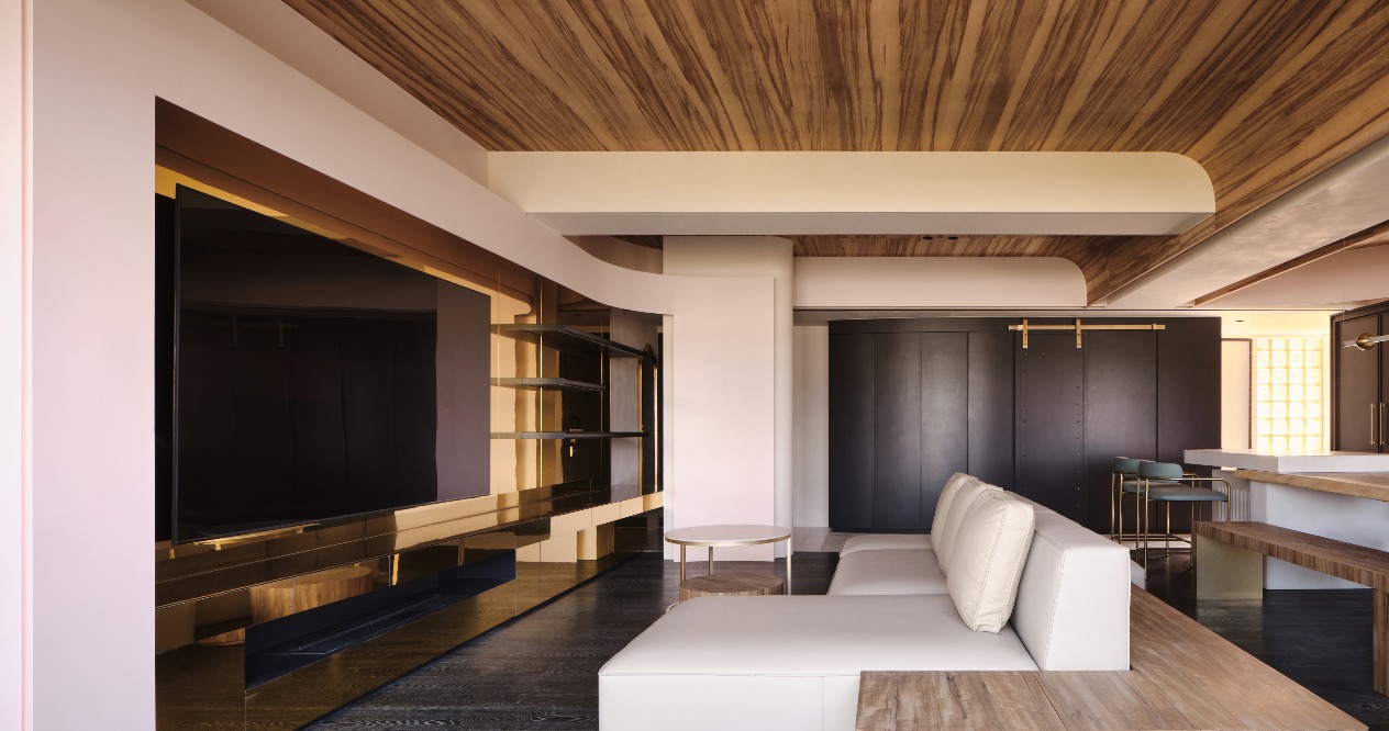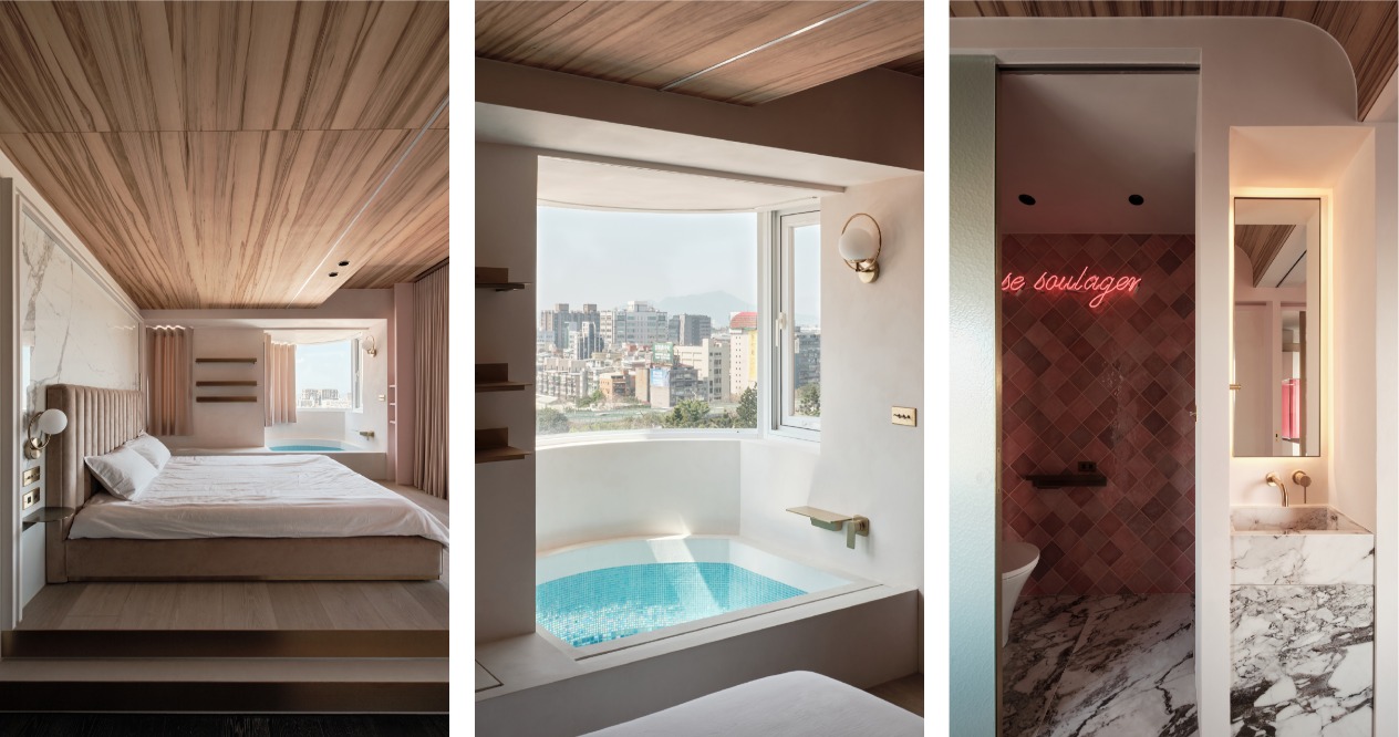The overall space is outlined with the arcs of two different sizes around the ceilings. From the public area to the private space, the pink panels and materials of different saturations are smartly arranged to plan a layered space without losing the division of zones.