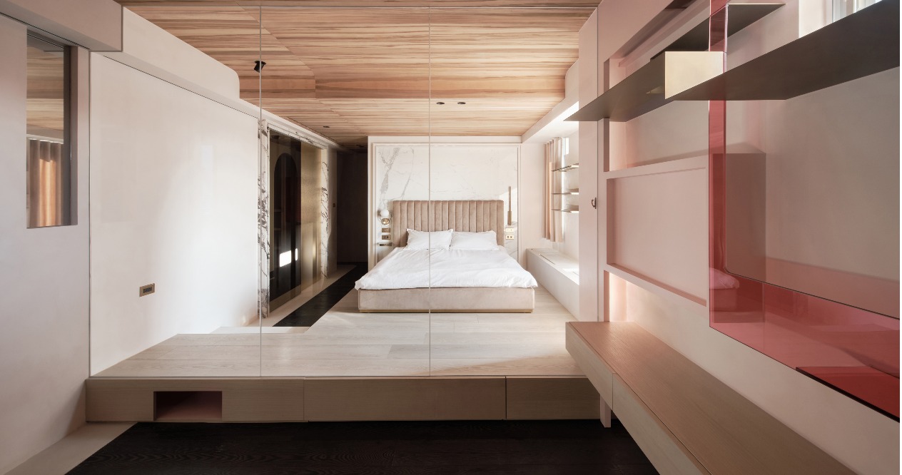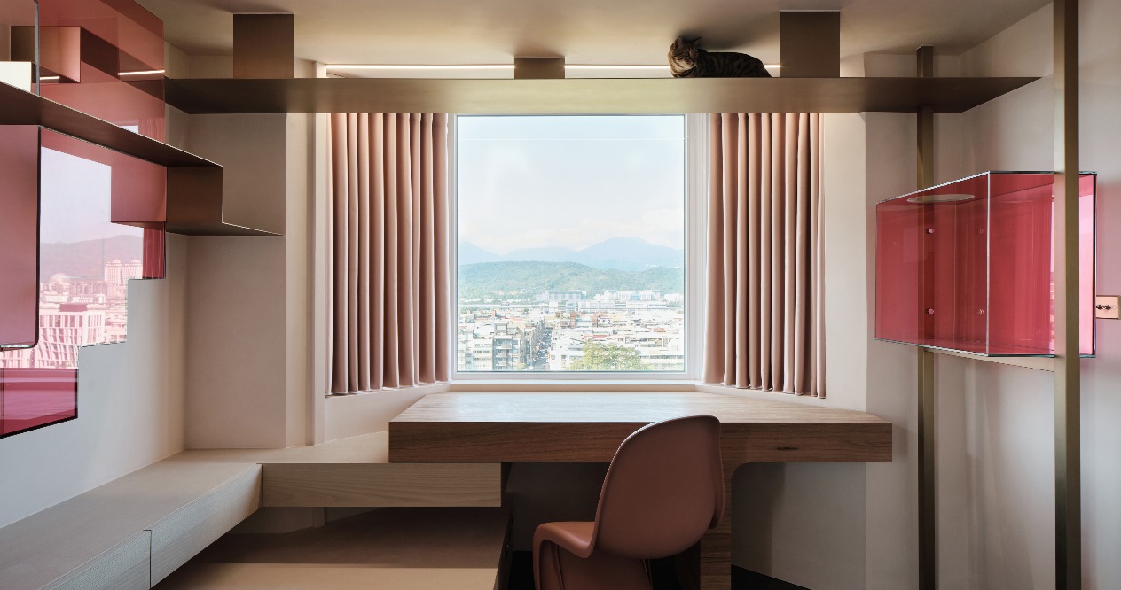 The arcs lead to the private area. We use the transparent glass as the partition between the bedroom and the cat’s room so that the male owner can look at the cat through glass even though he is allergic to cat hair. In the cat’s room, stairs and platforms are built on the walls and ceilings. The original air duct is made into the cat tunnel for the cat to freely move to the living room and the study room. It blocks cat hair and shows the female owner’s love for the cat at the same time. The pink cat tree embellished with metal corresponds to the overall style of the public area and add interest to the space.