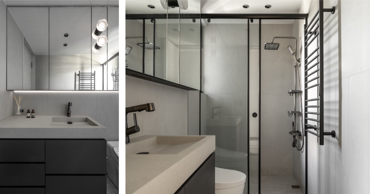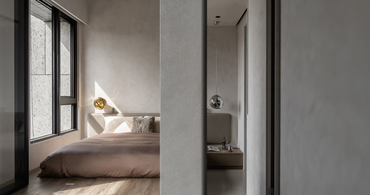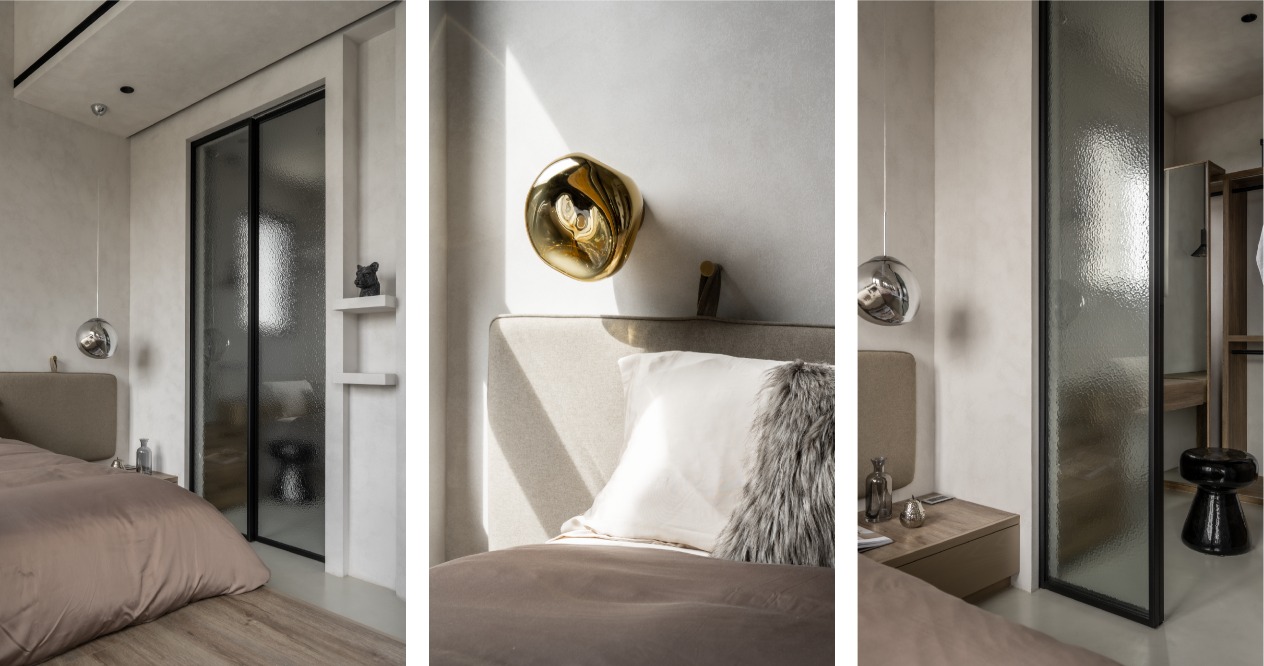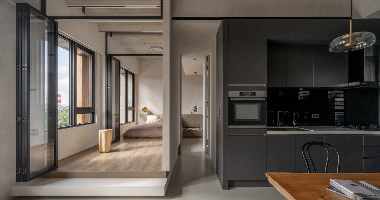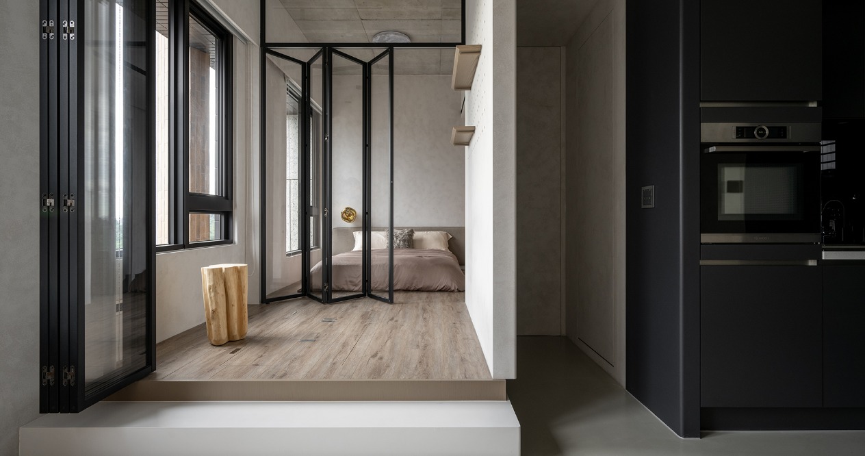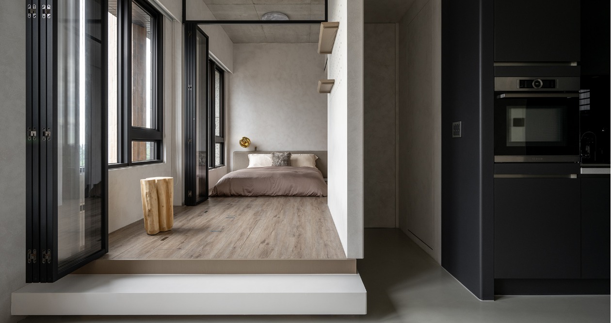 臥式與多功能房採用架高的形式,滿足收納的需求,高低差則以前後進退的踏階設計,利用此手法營造出穿插的視覺效果,從而減少了空間的厚重感,使架高的量感較有趣味性。並以透明拉門作為隔間,使大量採光可以流動於室,享受絕佳的視野和採光。