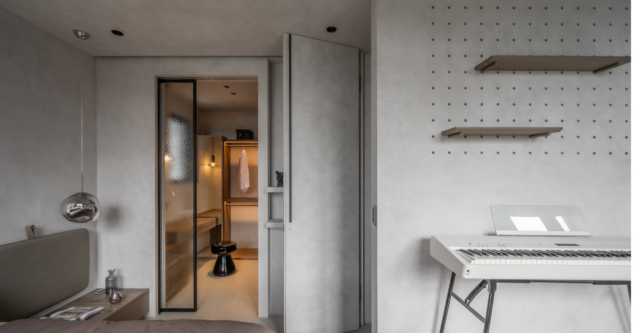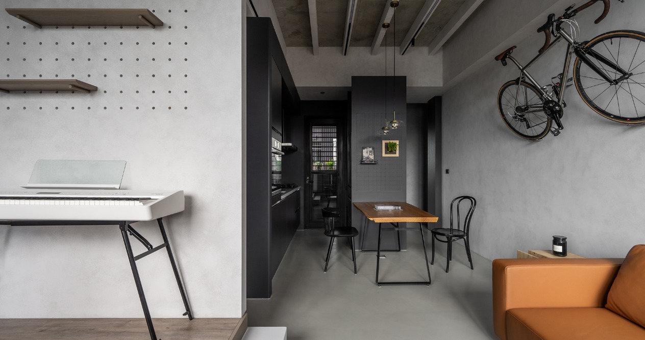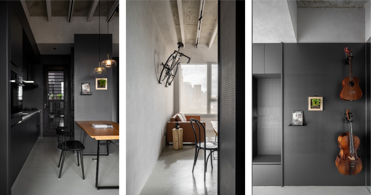 起初業主提出擺放樂器、腳踏車與增設電器櫃的需求,於是在玄關處規劃洞洞板取代實牆,並在後方銜接電器櫃,活化空間坪效,也界定出場域。