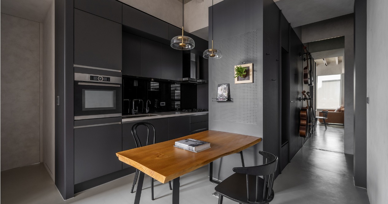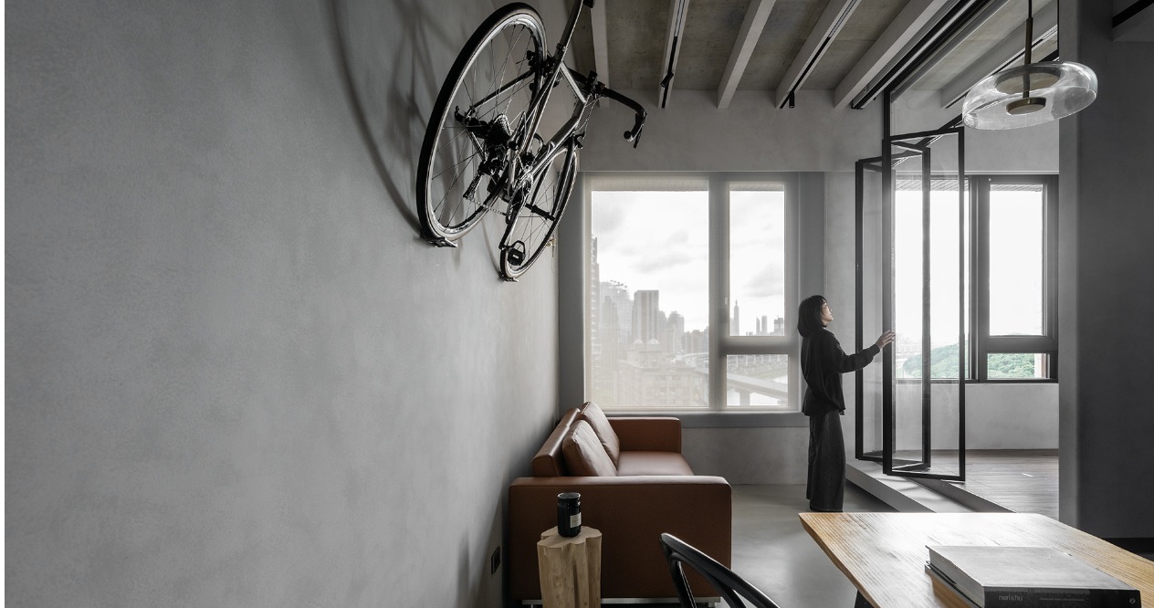 風格上,以屋主喜好的工業風為發想,保留原先的天花板,並刻意在裸露的天花上增設橫梁,藏匿電線外藉此達到延伸效果也成為最醒目的裝飾。