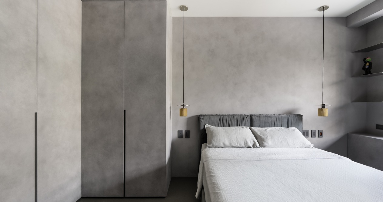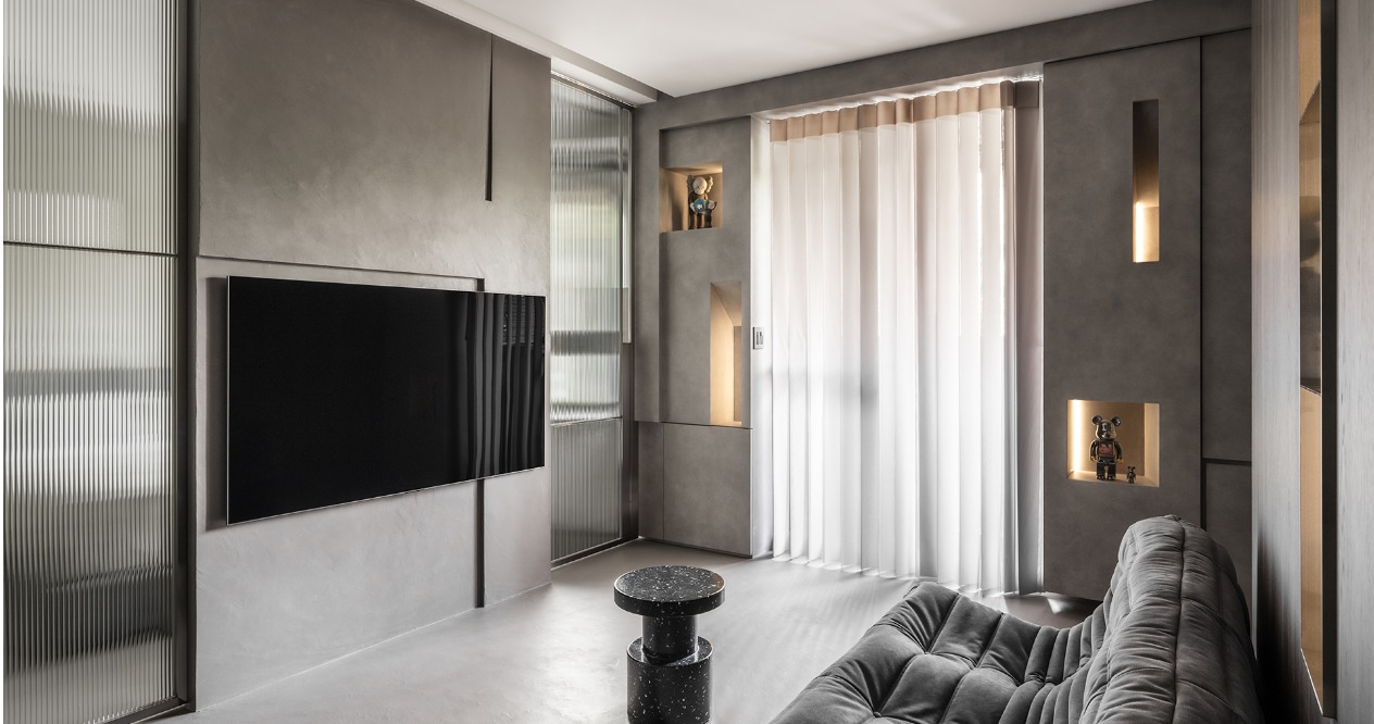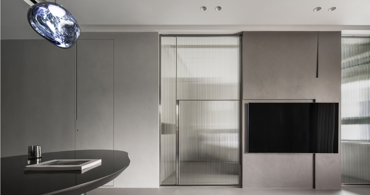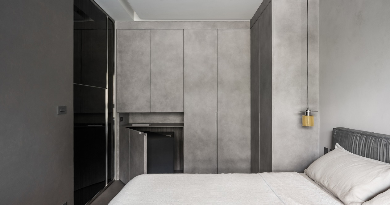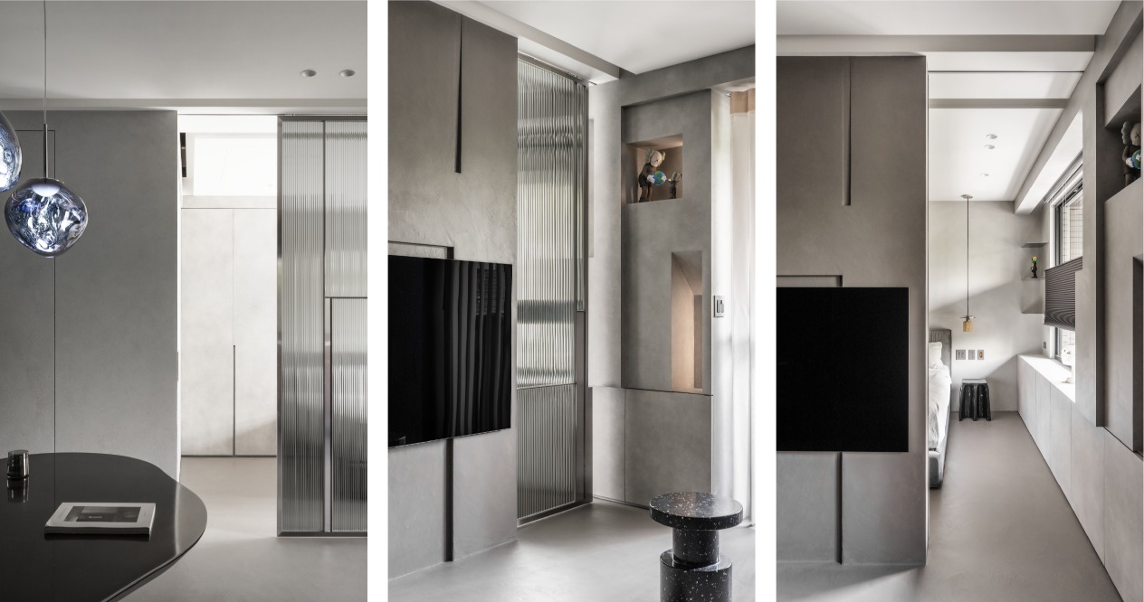 The partition wall of the master bedroom is the same width as the TV. The hidden sliding doors are arranged on both sides to form a circular flow allowing free movement, breaking the limitation of doors, and enhancing the connection between space. The gray striped glass on the sliding door allows privacy and light transmission at the same time. A hidden rotating dressing table is set up under the cabinet to keep the space spacious and tidy.