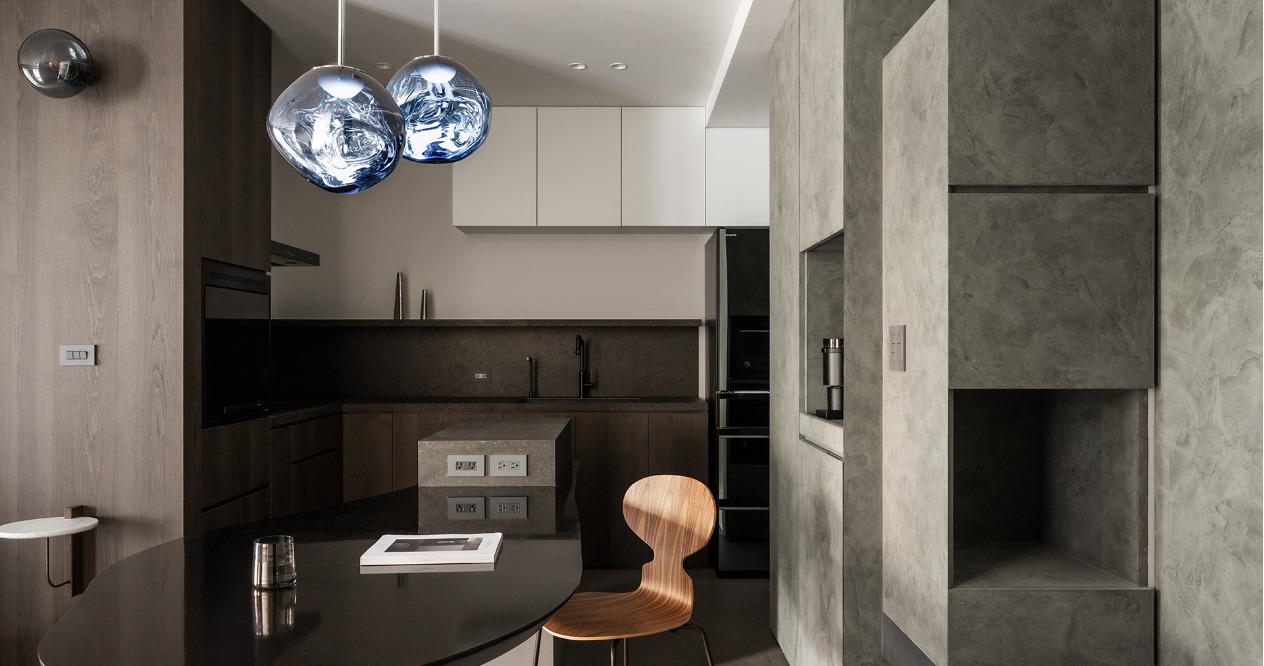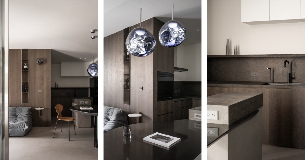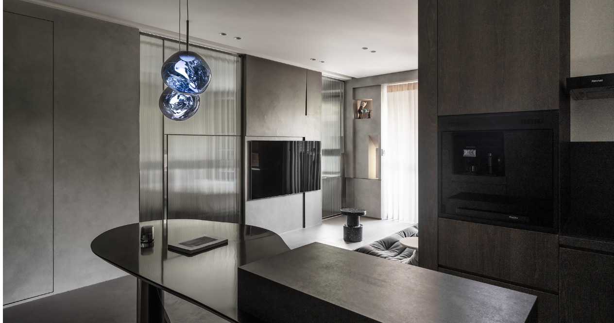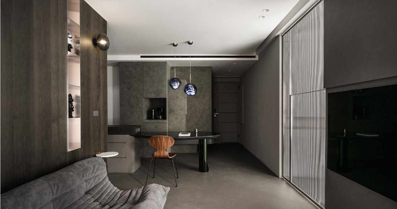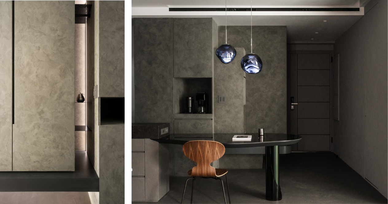 整體調性以屋主嚮往的深色系為基底,從入門玄關處即以大面積的深綠色櫃體作為風格營造的開端,地坪與立面透過不同彩度的灰階堆疊,為空間營造沈穩內斂的氛圍,並善用帶有透光、反射效果的材料放大整體空間。