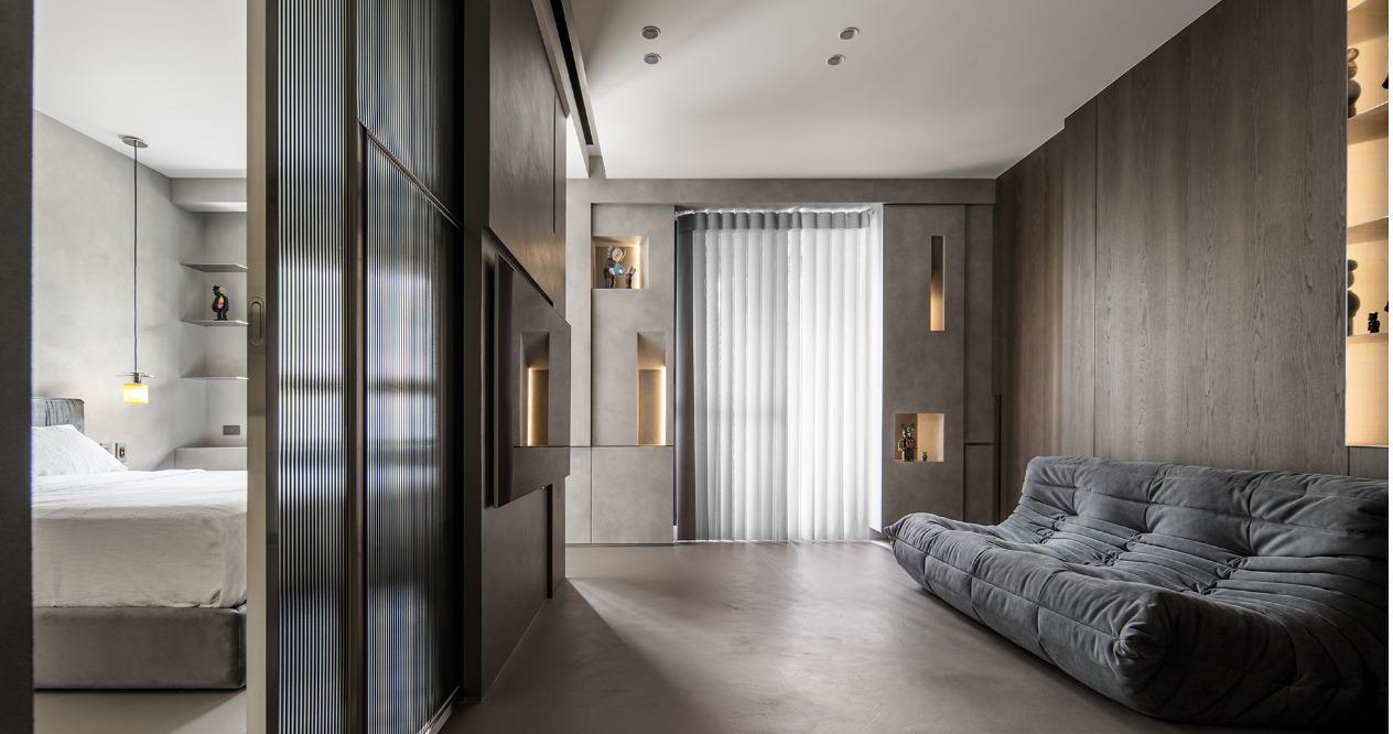 主臥房以電視的寬度作為隔間牆,並在左右兩側規劃隱藏式拉門,形成環繞動線,不拘限行走的動線,打破以往對於房門的局限,提升空間的串連性。拉門則選擇灰色條紋玻璃,保有隱私的前提下,同時享有透光的特性。並於櫃體下方設置隱藏式旋轉化妝桌,保持空間的寬敞和整潔。