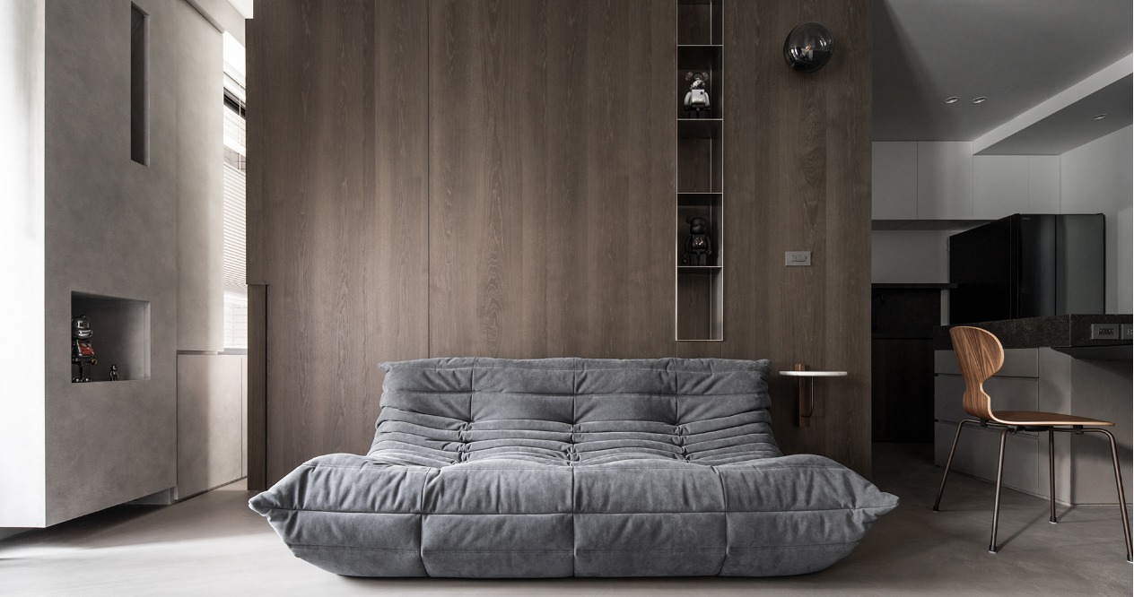 In the 17-ping (56 square meters) space, there is the problem of insufficient natural light because the apartment only has one side facing outdoors. We decide to adopt an open space design by placing the necessary storage cabinets against the walls and replacing the partition walls with hidden sliding doors to maximize the space.