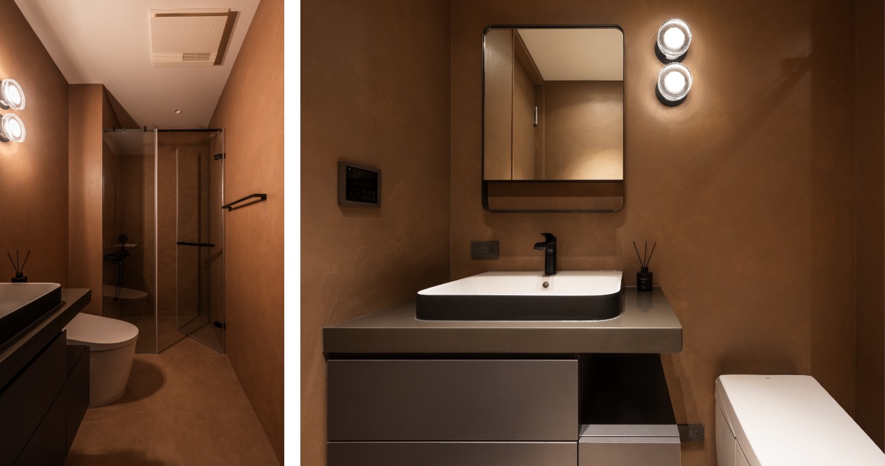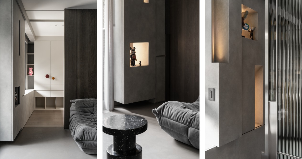 將斜角融入到生活中的小細節,從櫃體的結構到拉門扶手,甚至櫃體燈光的反射,都巧妙地運用斜角元素,形成獨特的光影效果,豐富視覺上的變化與趣味。