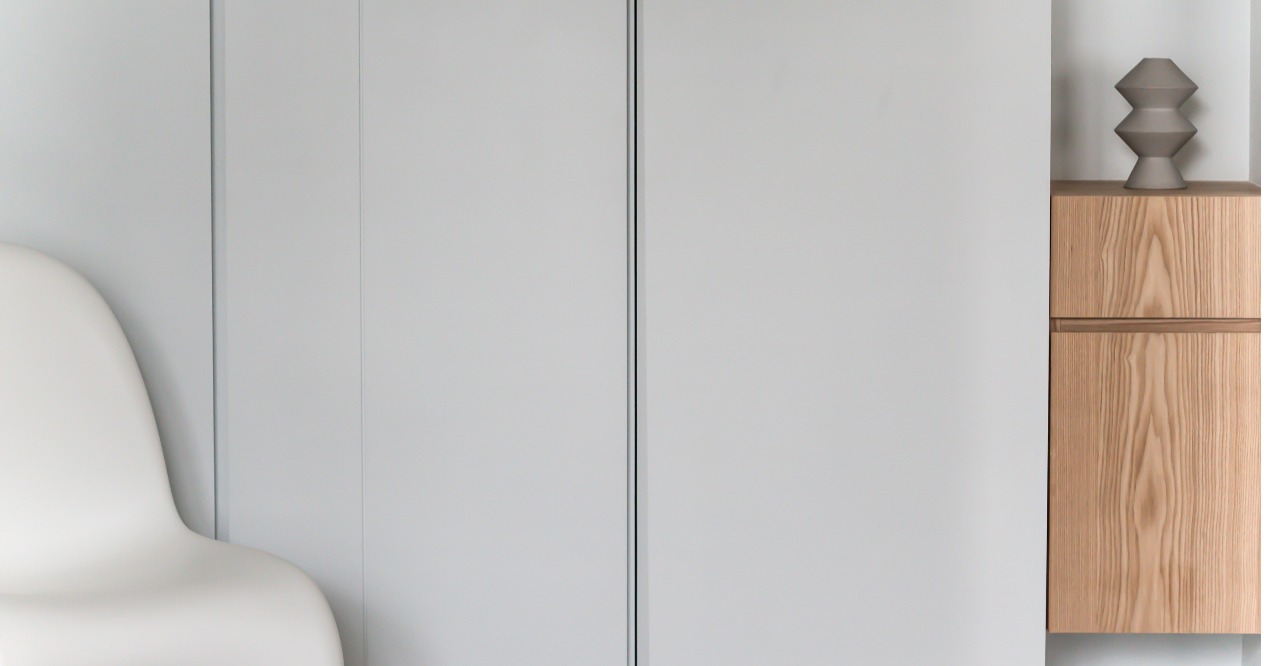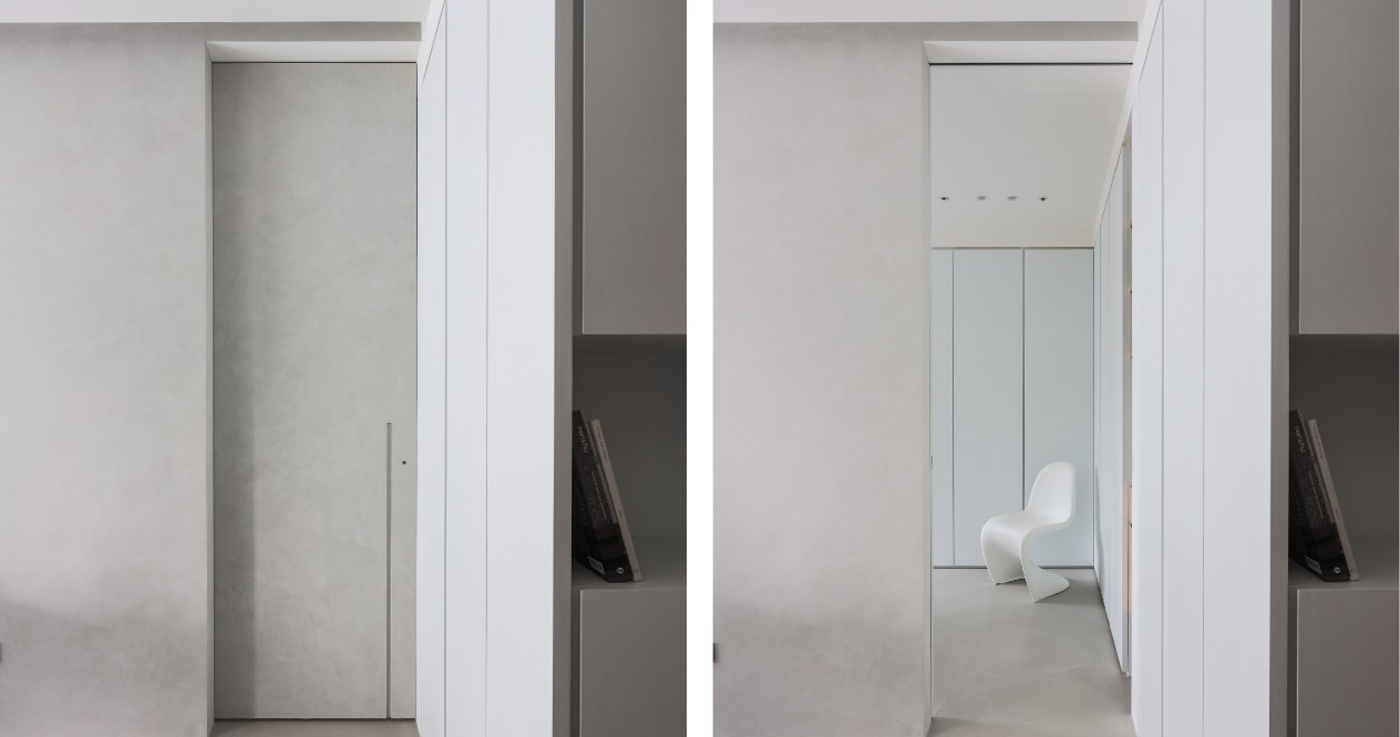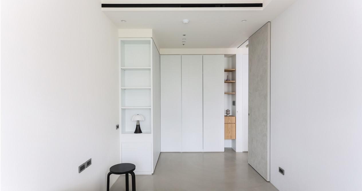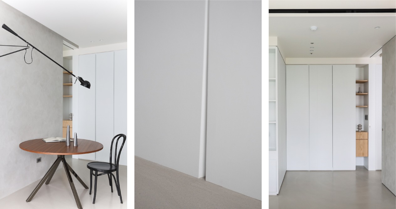 空間操作上,劃分為公共區域及臥室區,收納則區分為封閉式櫃體及展示需求的壁龕式層架,在櫃體門片上倒入斜角,透過不對稱的線條和角度,營造出立面的層次感,增加不同視角的變化和趣味性。