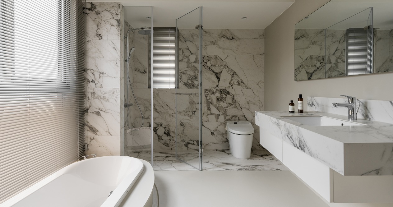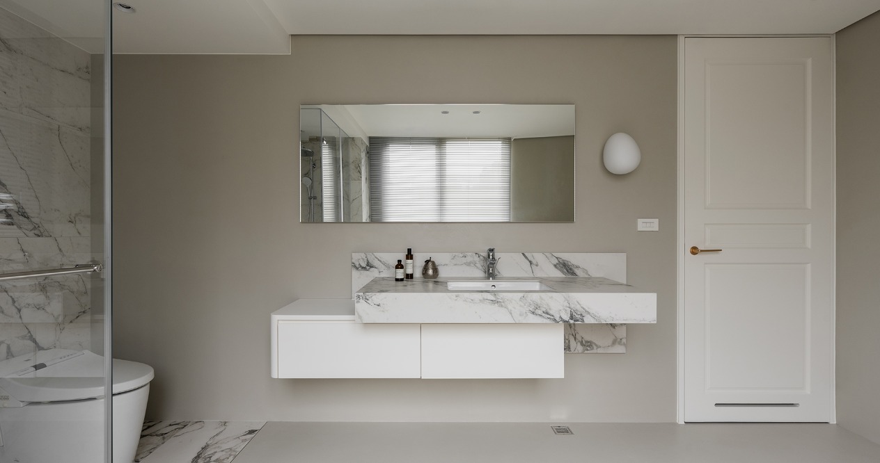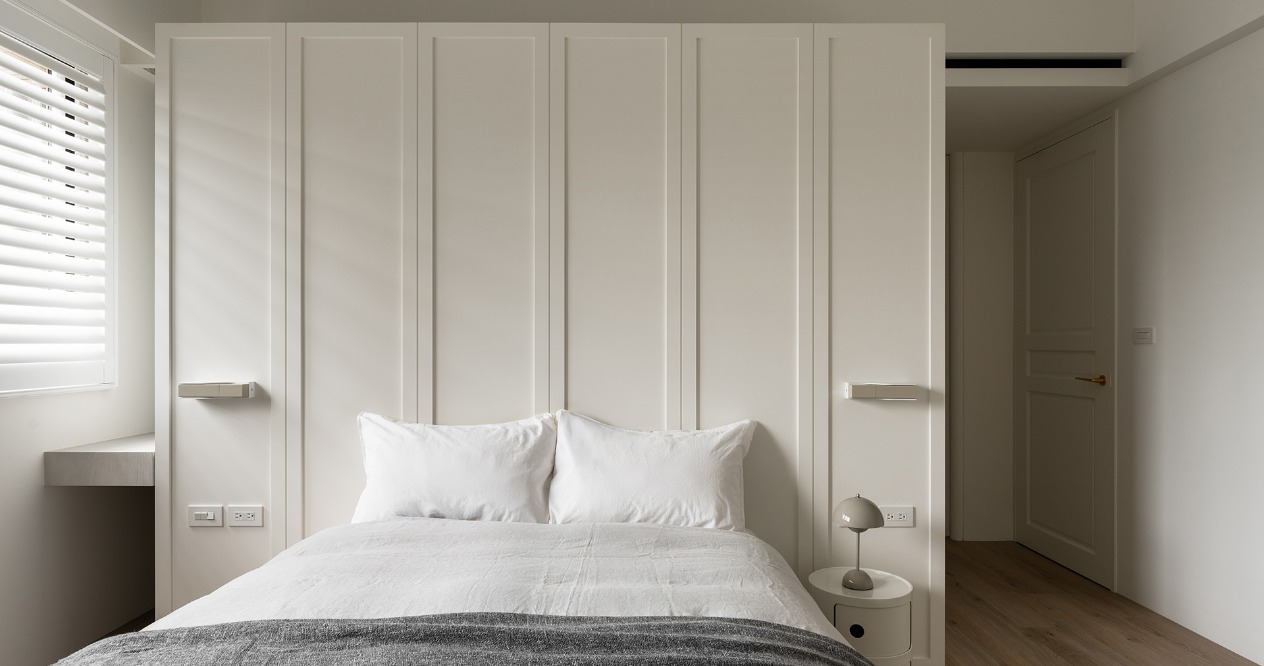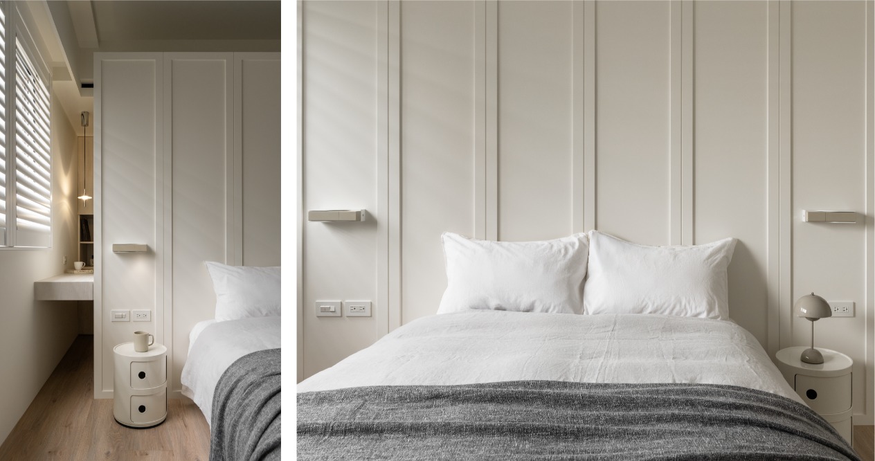 主臥空間中,我們利用衣櫃劃分睡眠區與更衣區,並將公共空間的線板元素延續至臥室,浴室的大阪磚則以餐桌檯面互相呼應,創造一致的整體感。
