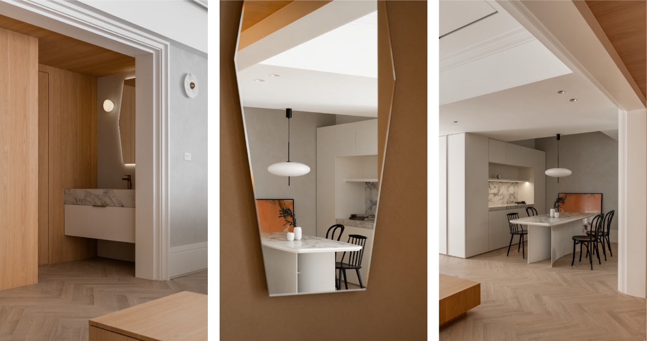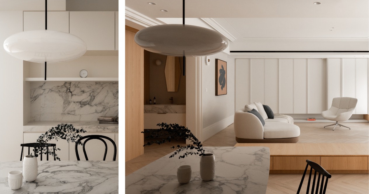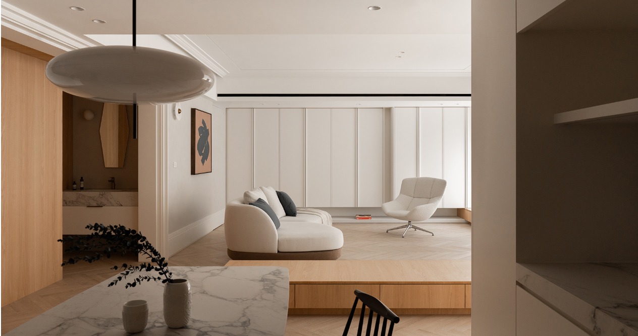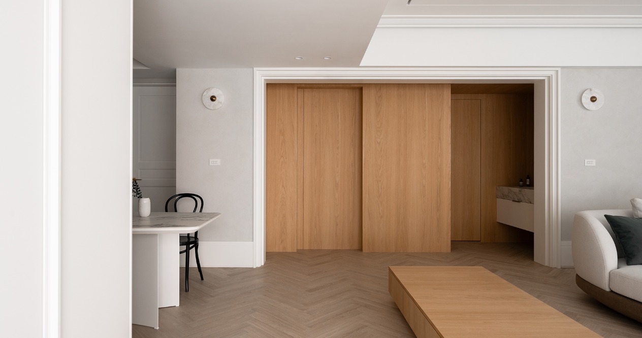 風格以屋主偏好溫暖且略帶古典氣息與現代感的元素為出發點,透過線板、踢腳板等細節,以進退的變化在牆面與櫃體上堆疊出層次感。餐桌選用較薄的桌面並搭配曲線的桌腳,餐椅則以纖細的線條,降低整體的厚重感,提升空間的流動性與輕盈感,創造溫馨寬敞的生活領域。
