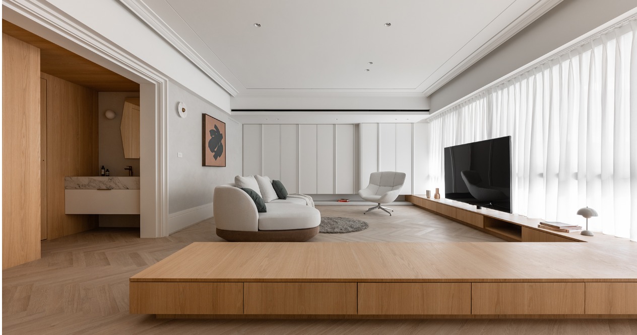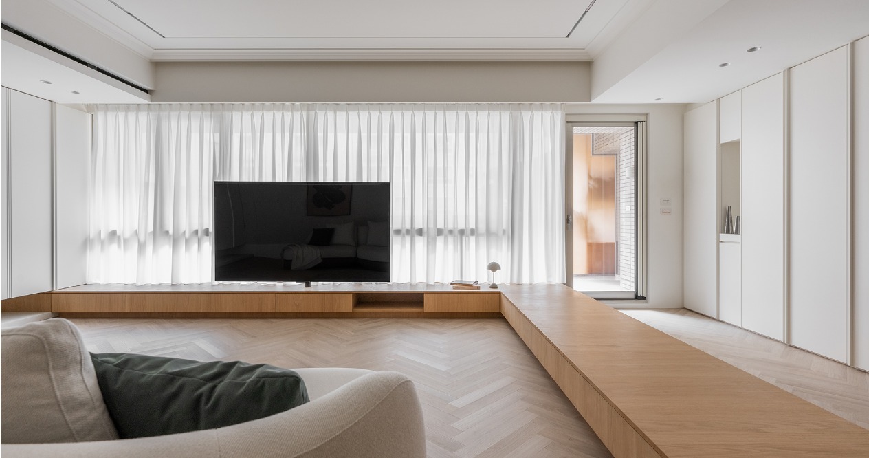 在設計20坪的公共空間時,我們的目標是讓空間充分展現其尺度,同時滿足客人對收納的需求。在不更動原始格局的基礎上,我們首先考慮到電視在大面採光的空間中可能產生反光問題,並且傳統電視牆通常附著於空間中的一面牆,容易造成視覺上的阻隔,削弱整體空間的開放感。因此,我們將電視配至於靠窗處,不僅能避免陽光反射,也使戶外景色自然延伸進室內,增強空間的穿透性與開闊感,並結合低矮的L型臥榻,從窗邊延伸至玄關,作為整體營造的開端。