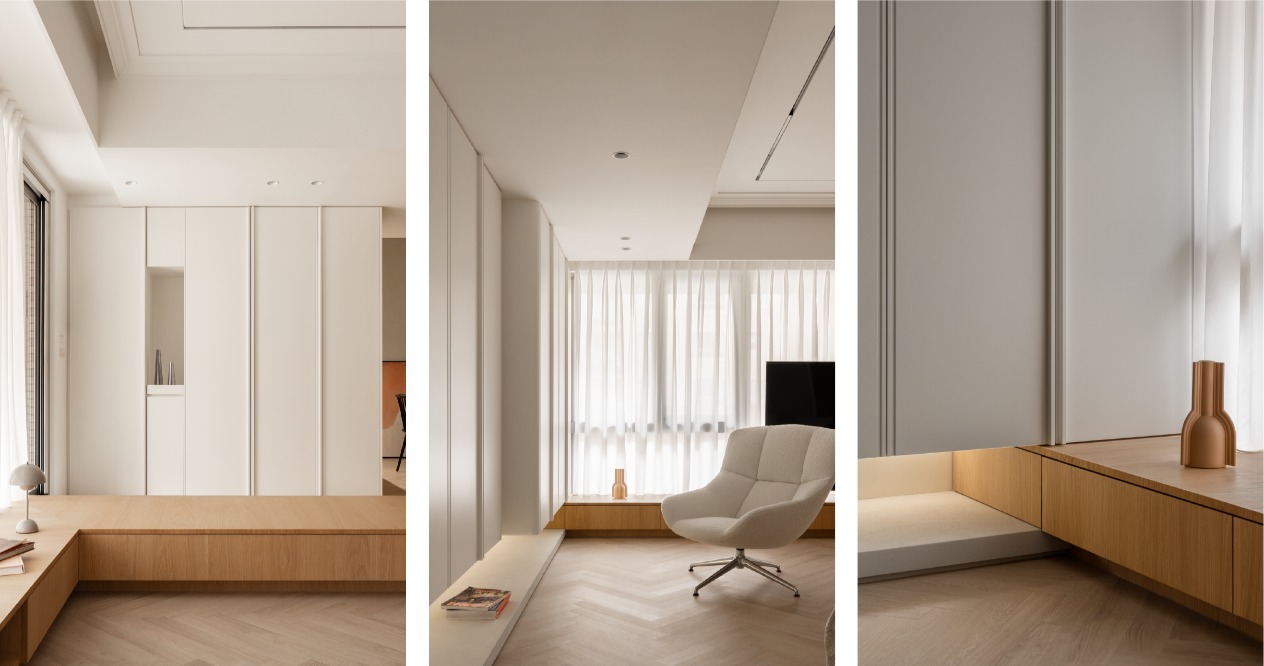 公共區域在配置上不作明確的分區,而是以臥榻扮演著場域劃分與視覺引導的角色,在高度僅約30公分,並不阻隔視線,卻能巧妙改變移動方式,達到空間劃分的效果。作為電視櫃的同時,它也是聚會時的座位區,並在玄關處充當穿鞋凳,還擁有大量的收納櫃體,讓空間既靈活又實用。