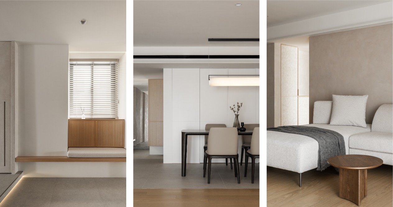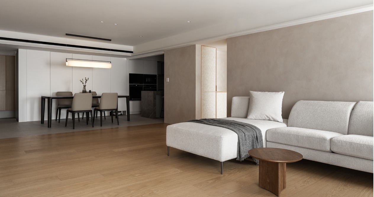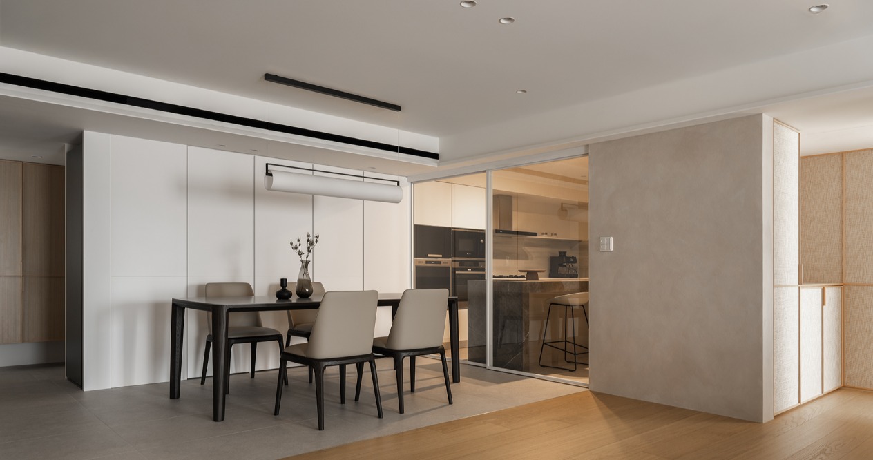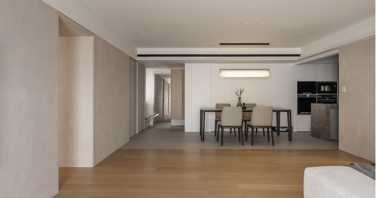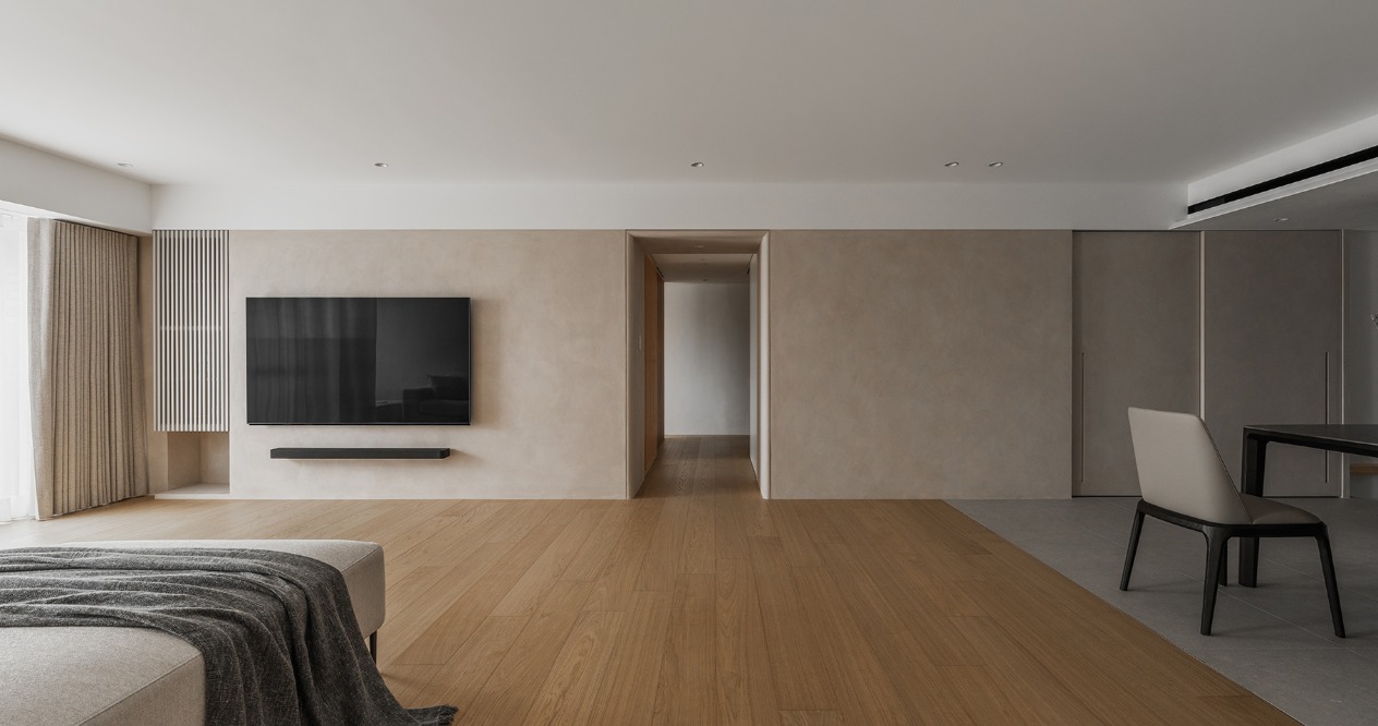 在方正的格局中,我們將公共區域配置於空間的中心,主臥房及其他私人領域分別規劃於客廳的左右兩側,以客廳做為區隔,自然地將主臥室和其他空間分隔開來,保有各個空間的隱私性與獨立性。同時以建材來定義不同的場域,從玄關落塵區一路延伸至廚房與餐廳,選用磁磚作為過渡,營造乾淨俐落的視覺效果,也便於日常清潔與維護。接著以木頭地板作為銜接,將公共區域與私人領域連結起來,讓空間在上更具層次與延伸性。