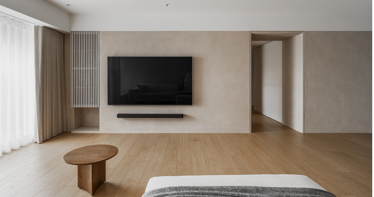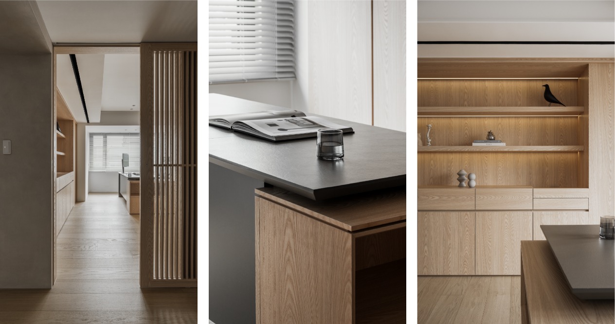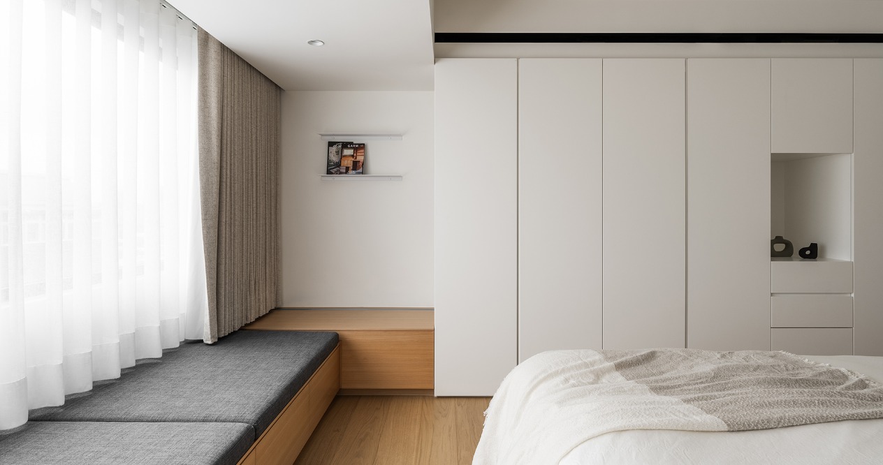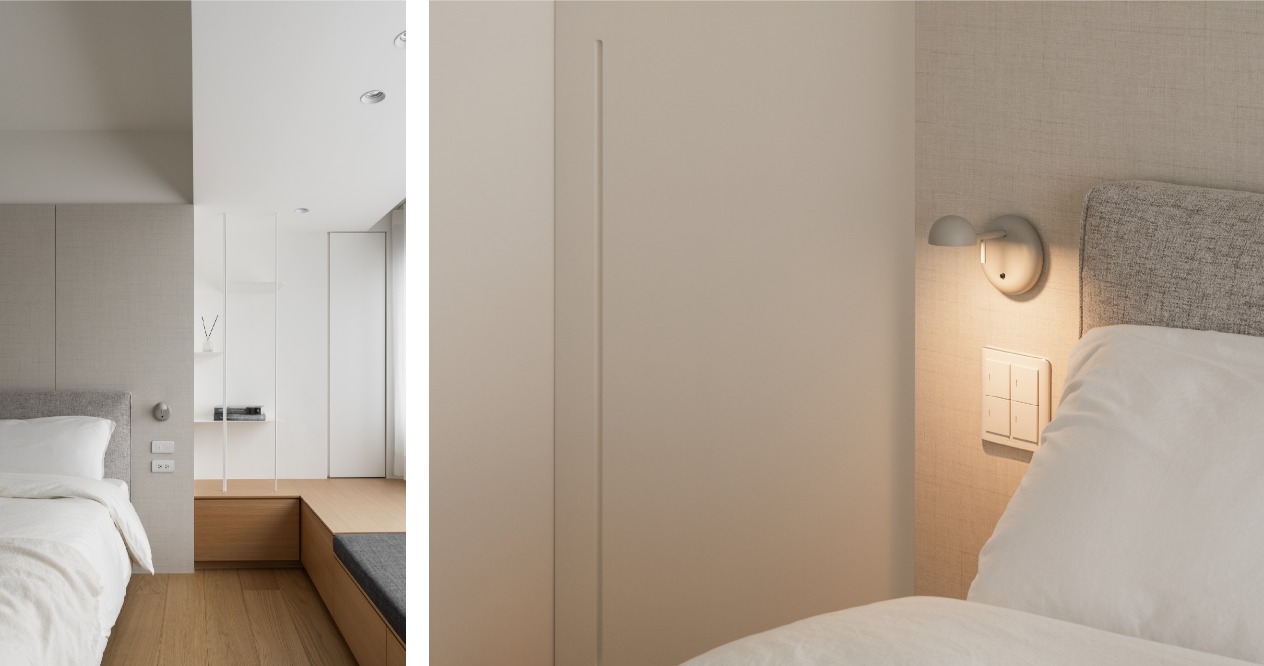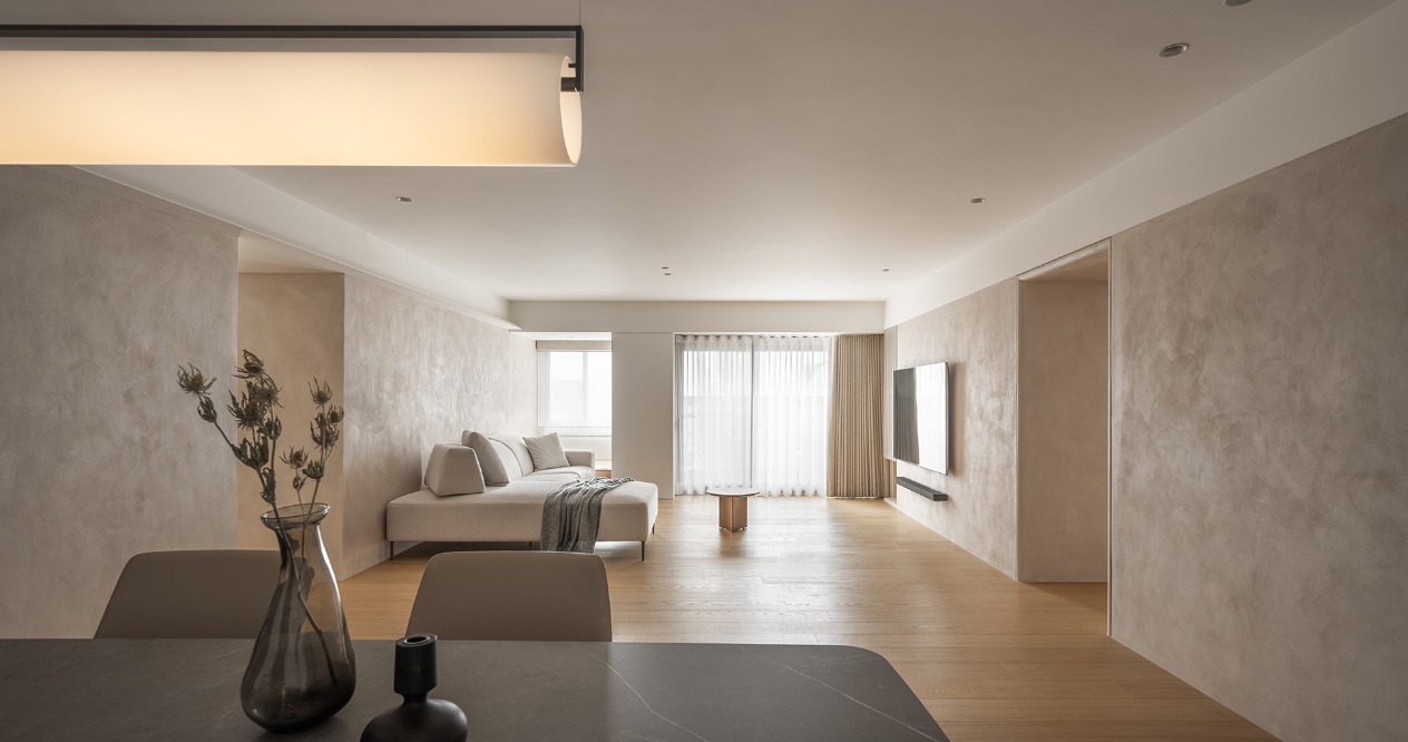 在方正的格局中,我們將公共區域配置於空間的中心,主臥房及其他私人領域分別規劃於客廳的左右兩側,以客廳做為區隔,自然地將主臥室和其他空間分隔開來,保有各個空間的隱私性與獨立性。同時以建材來定義不同的場域,從玄關落塵區一路延伸至廚房與餐廳,選用磁磚作為過渡,營造乾淨俐落的視覺效果,也便於日常清潔與維護。接著以木頭地板作為銜接,將公共區域與私人領域連結起來,讓空間在上更具層次與延伸性。