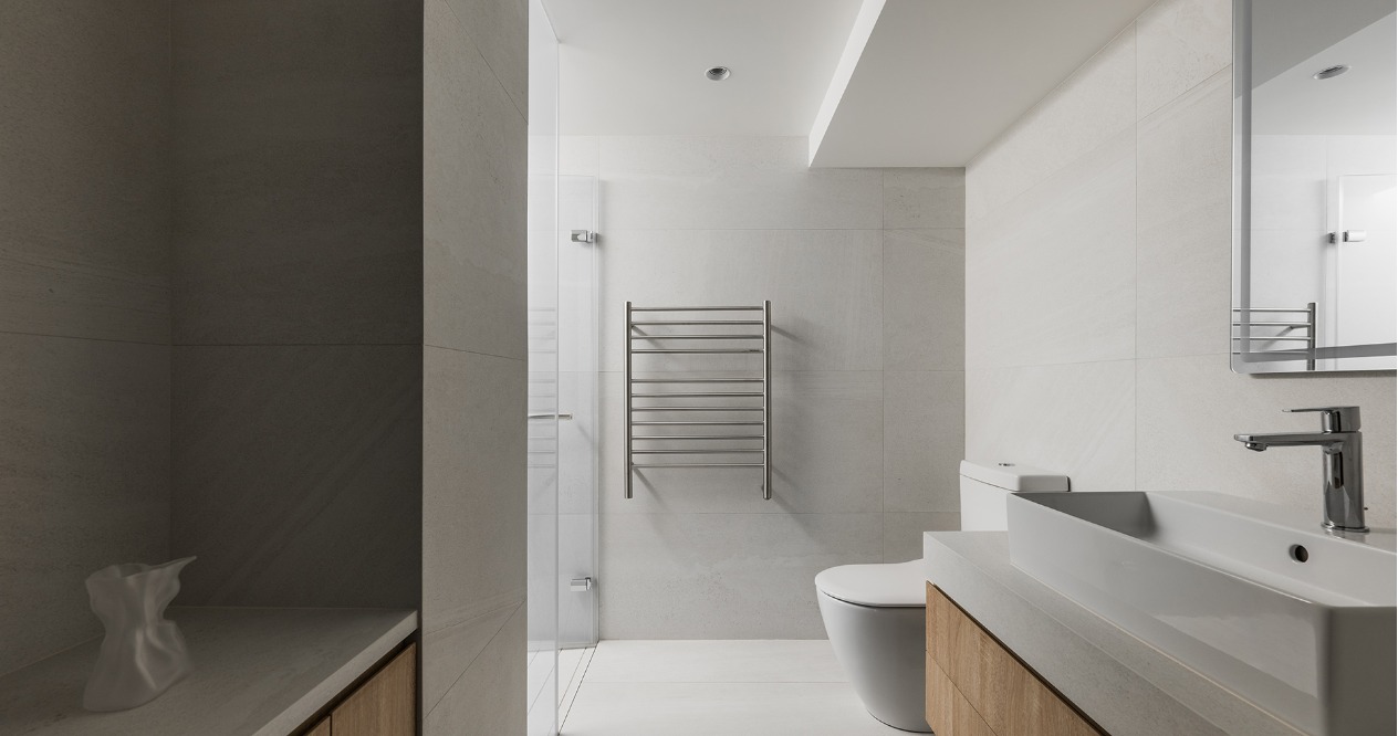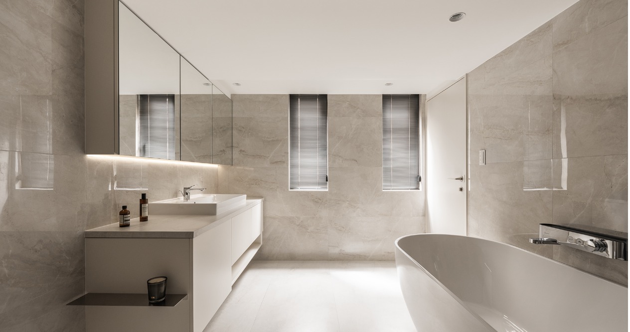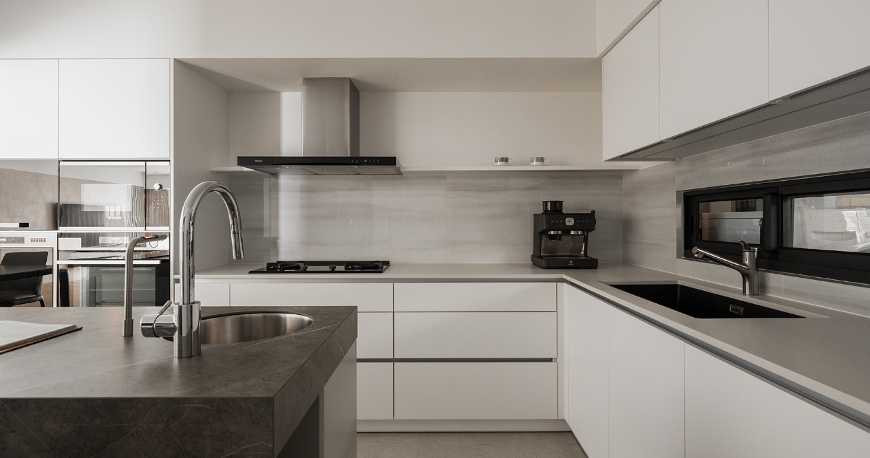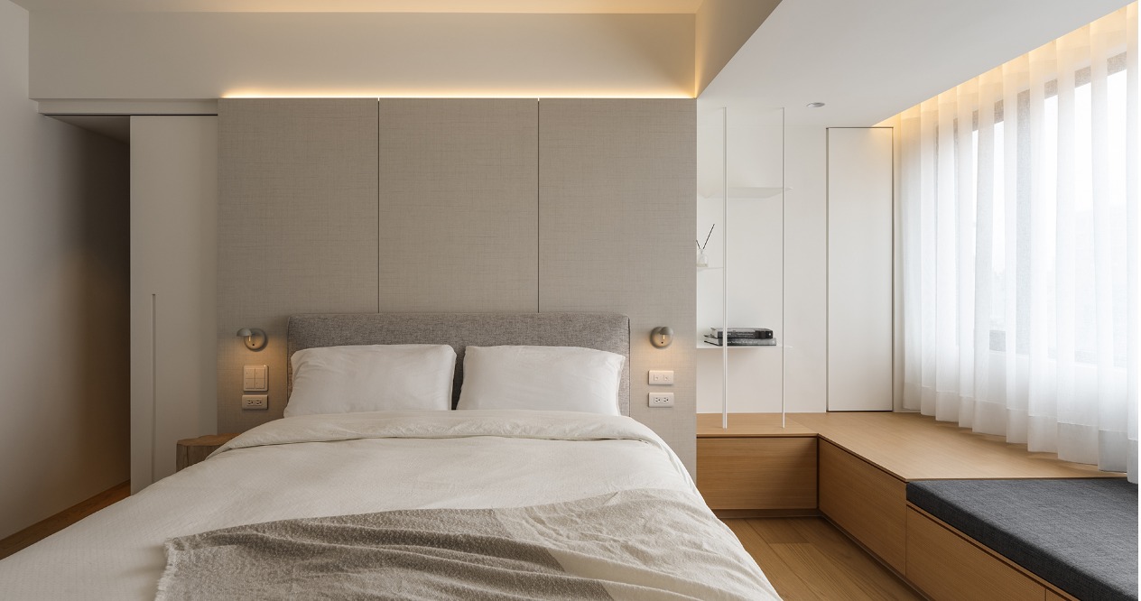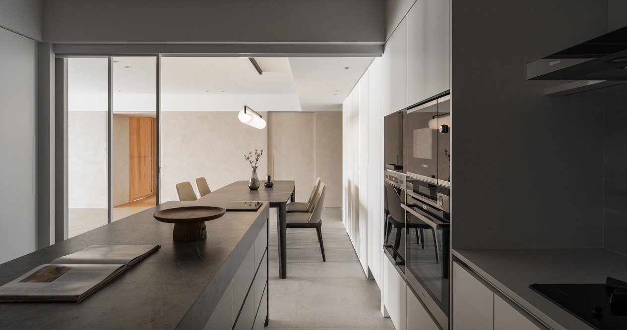 在方正的格局中,我們將公共區域配置於空間的中心,主臥房及其他私人領域分別規劃於客廳的左右兩側,以客廳做為區隔,自然地將主臥室和其他空間分隔開來,保有各個空間的隱私性與獨立性。同時以建材來定義不同的場域,從玄關落塵區一路延伸至廚房與餐廳,選用磁磚作為過渡,營造乾淨俐落的視覺效果,也便於日常清潔與維護。接著以木頭地板作為銜接,將公共區域與私人領域連結起來,讓空間在上更具層次與延伸性。