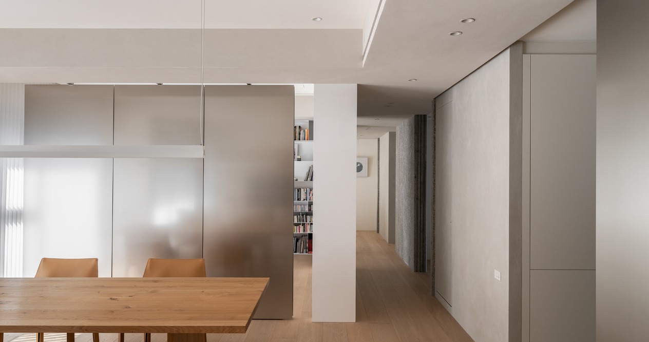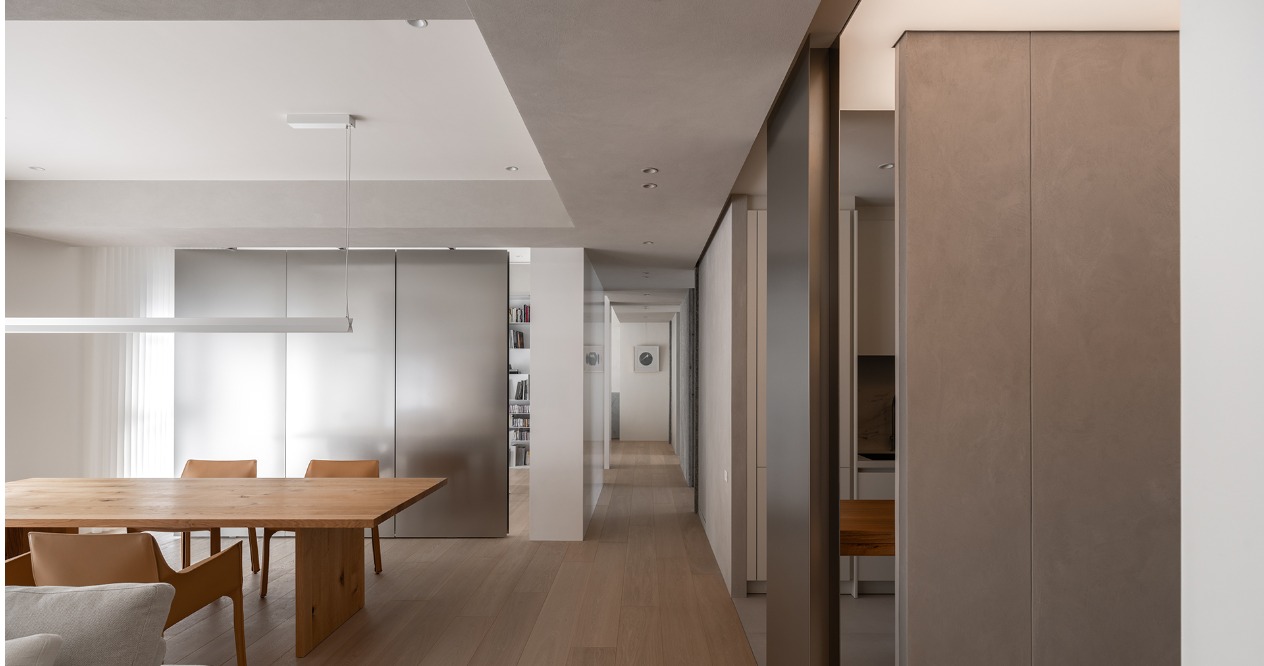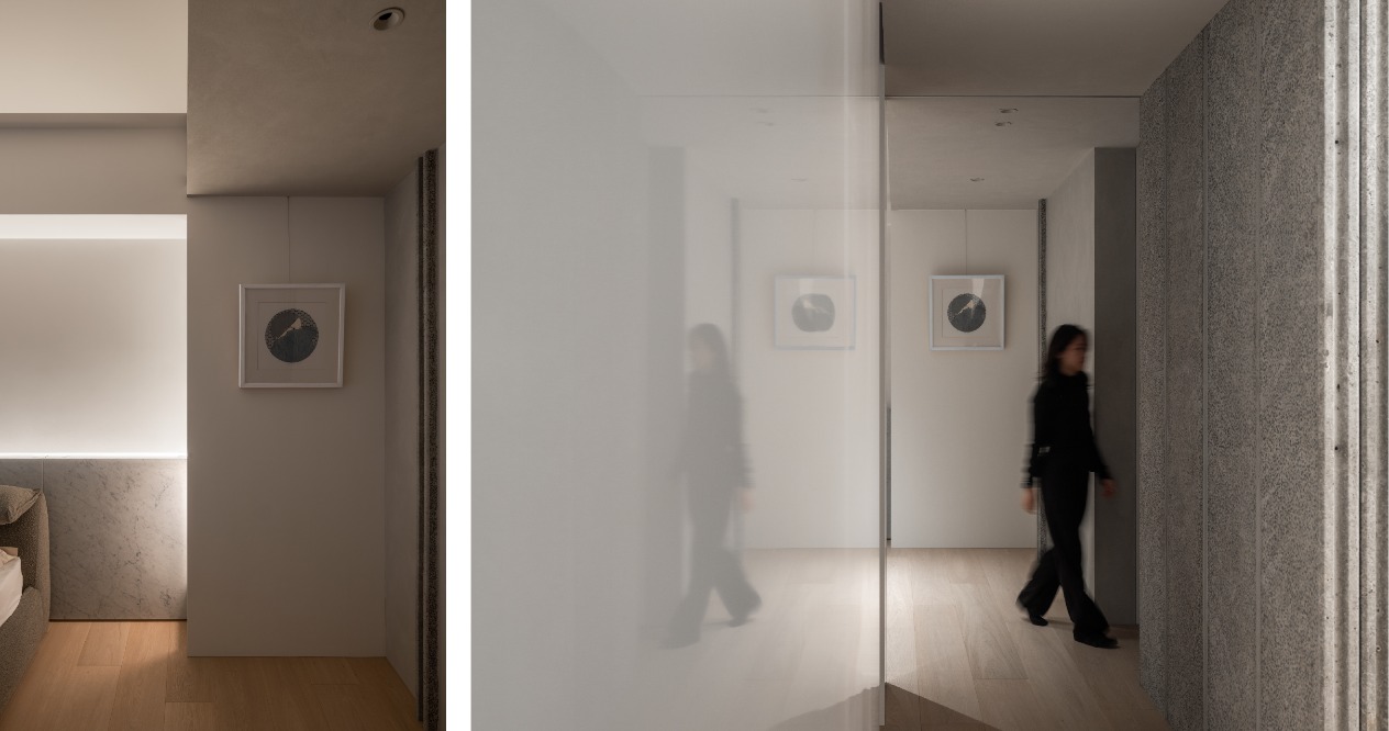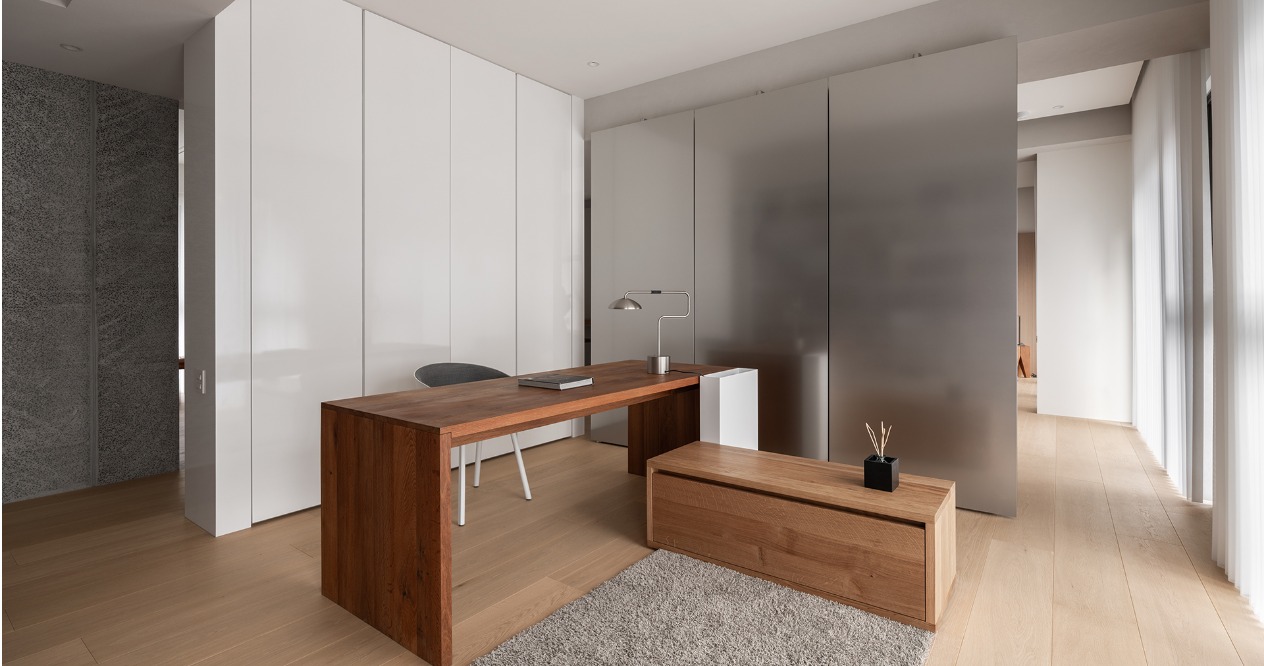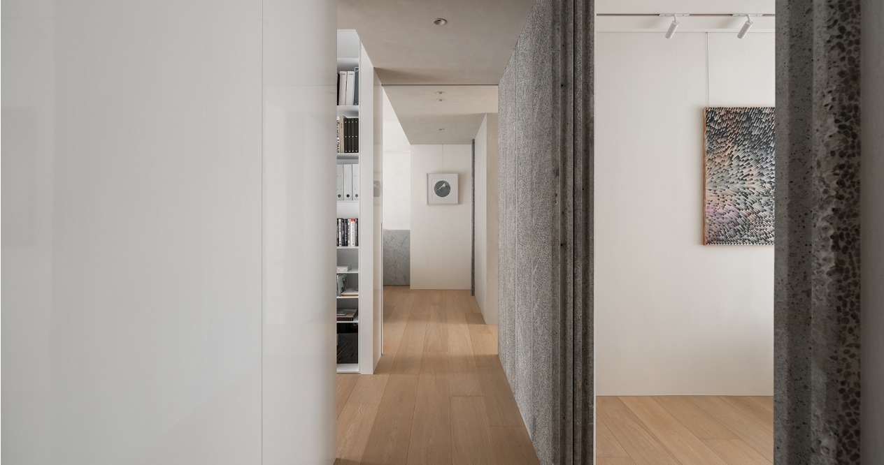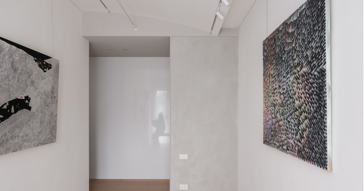 簡約的輪廓與量體中,透過材料的堆疊勾勒出空間軌跡。廊道以鋼琴烤漆從書房延伸至主臥的主牆,材質延續使軸線無形擴展,增強流動感。畫廊大面積留白襯托擺飾或藝術品,來定調空間的氛圍。