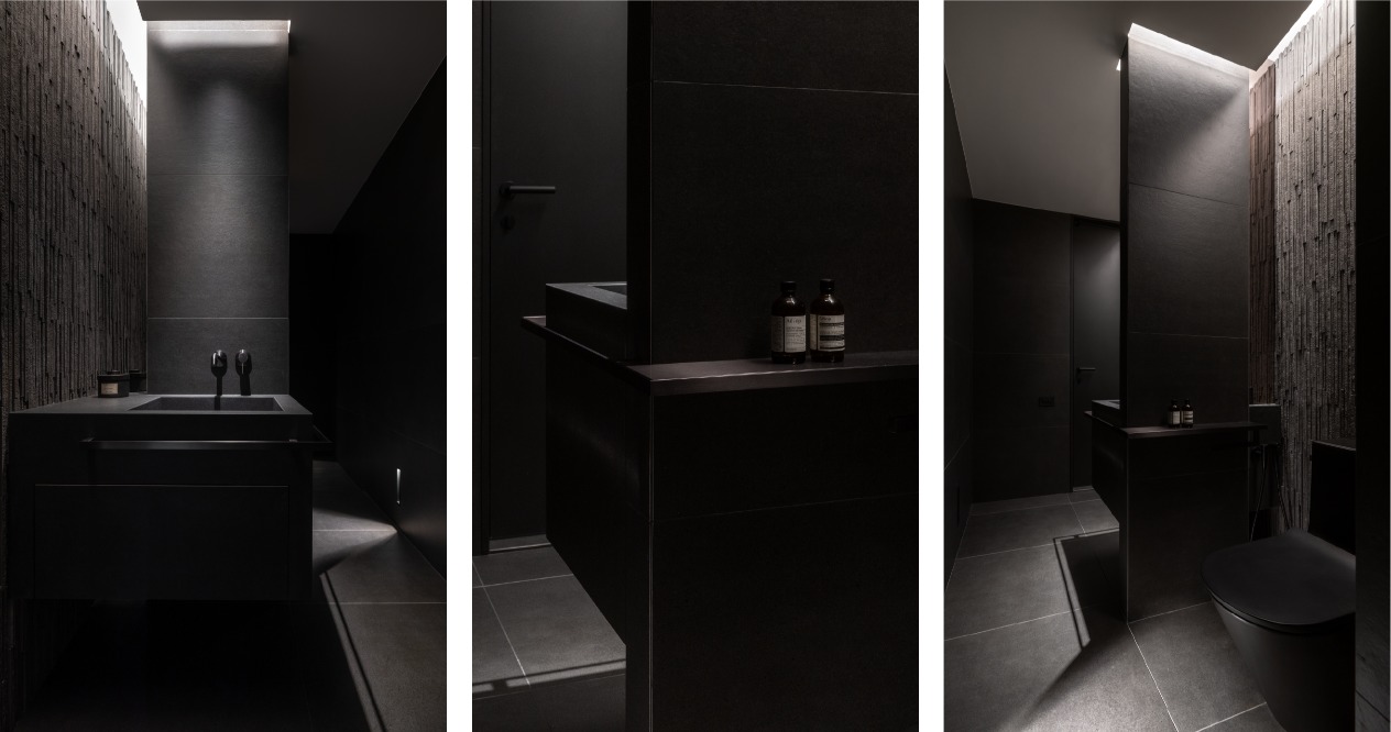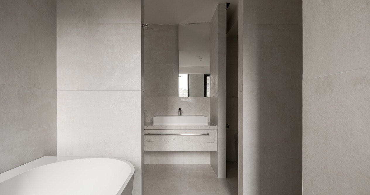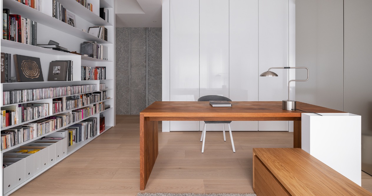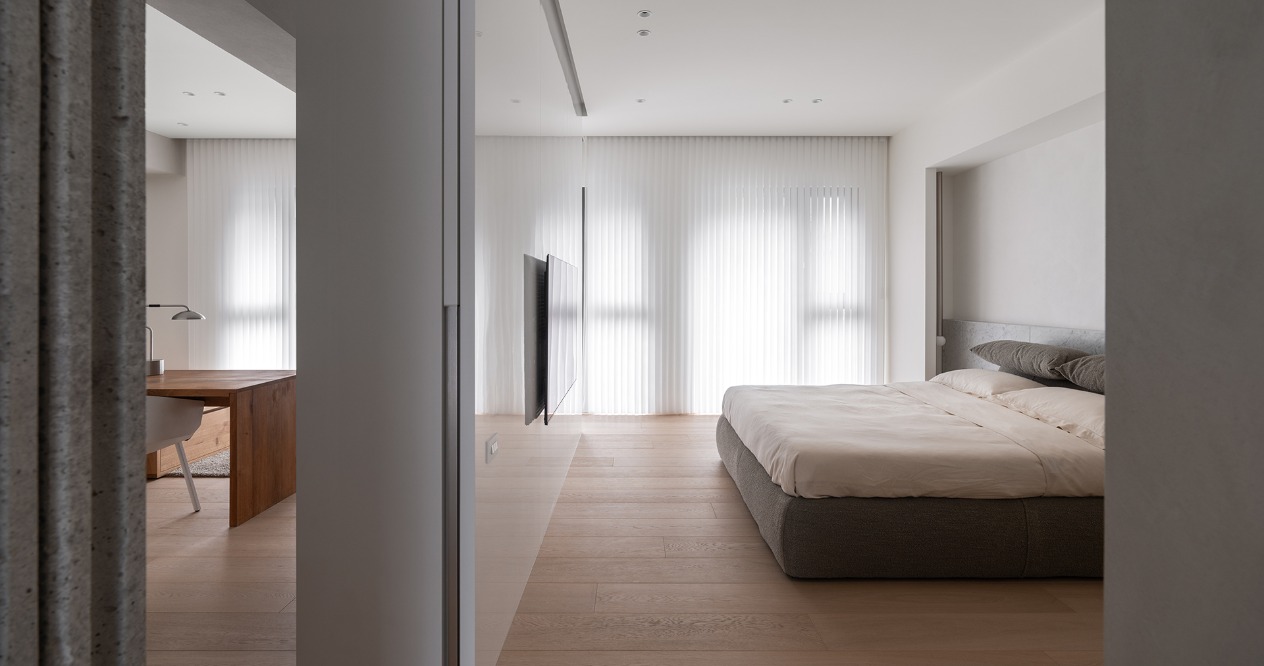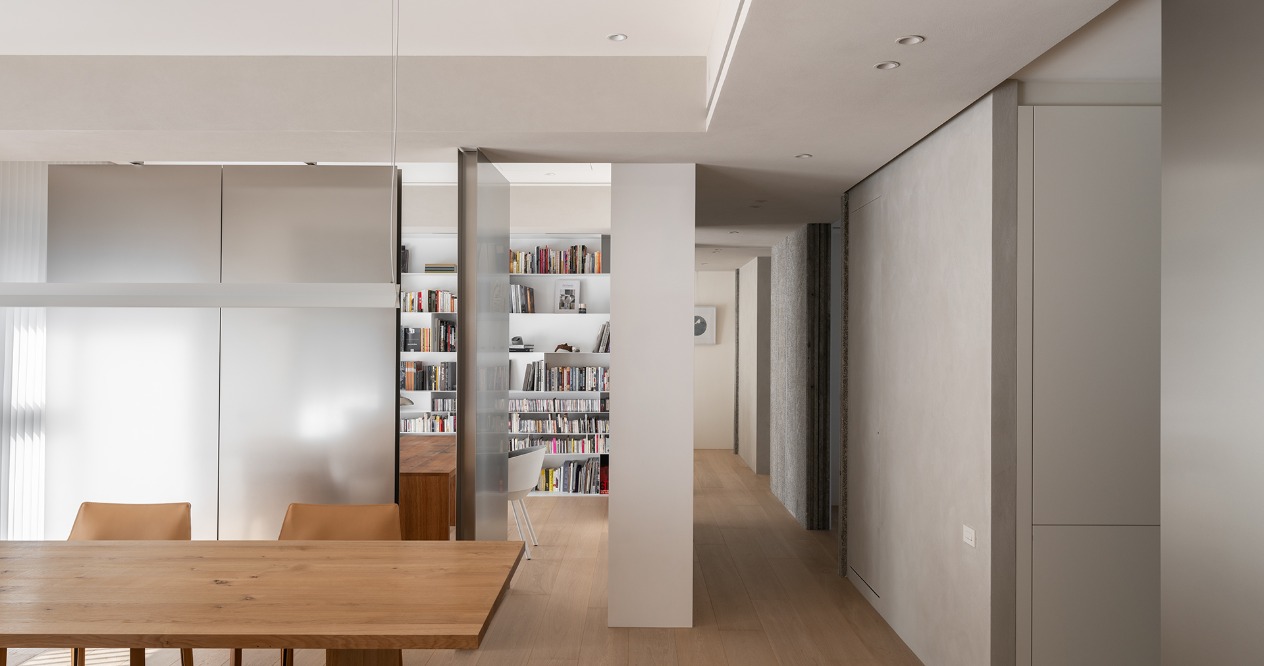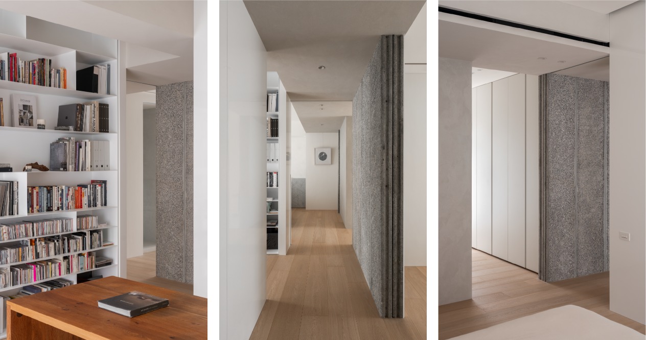 簡約的輪廓與量體中,透過材料的堆疊勾勒出空間軌跡。廊道以鋼琴烤漆從書房延伸至主臥的主牆,材質延續使軸線無形擴展,增強流動感。畫廊大面積留白襯托擺飾或藝術品,來定調空間的氛圍。