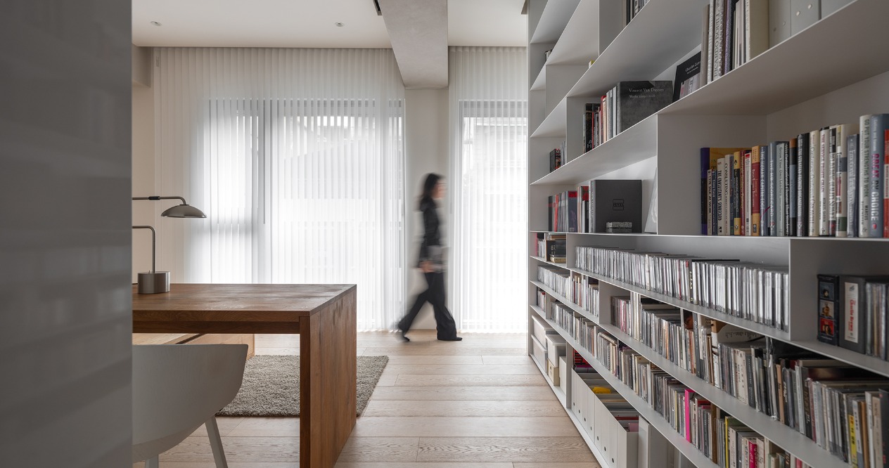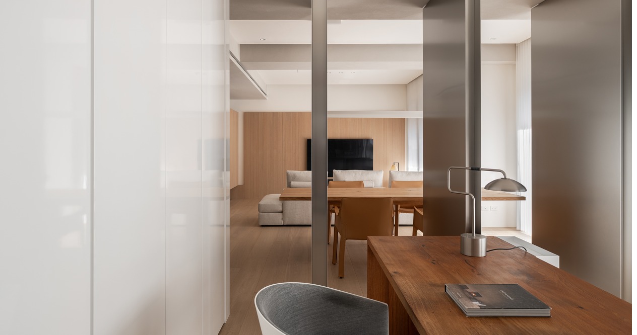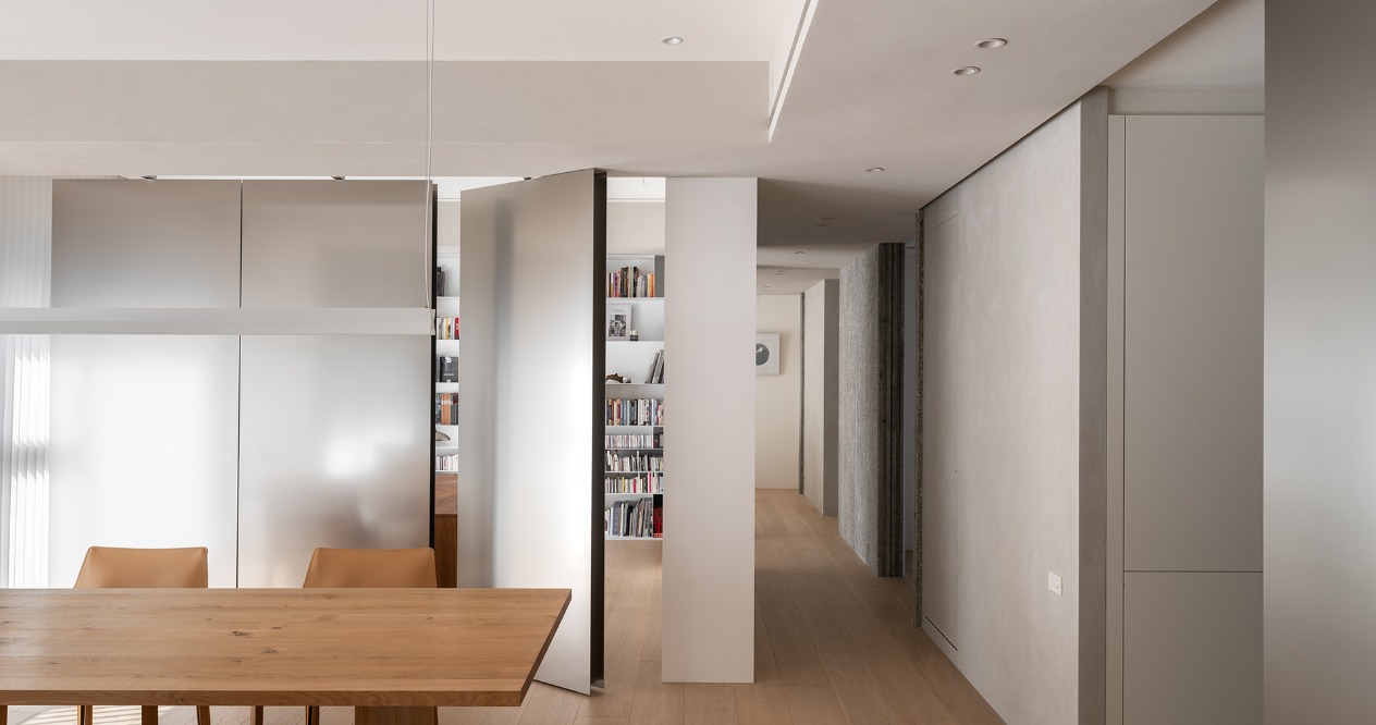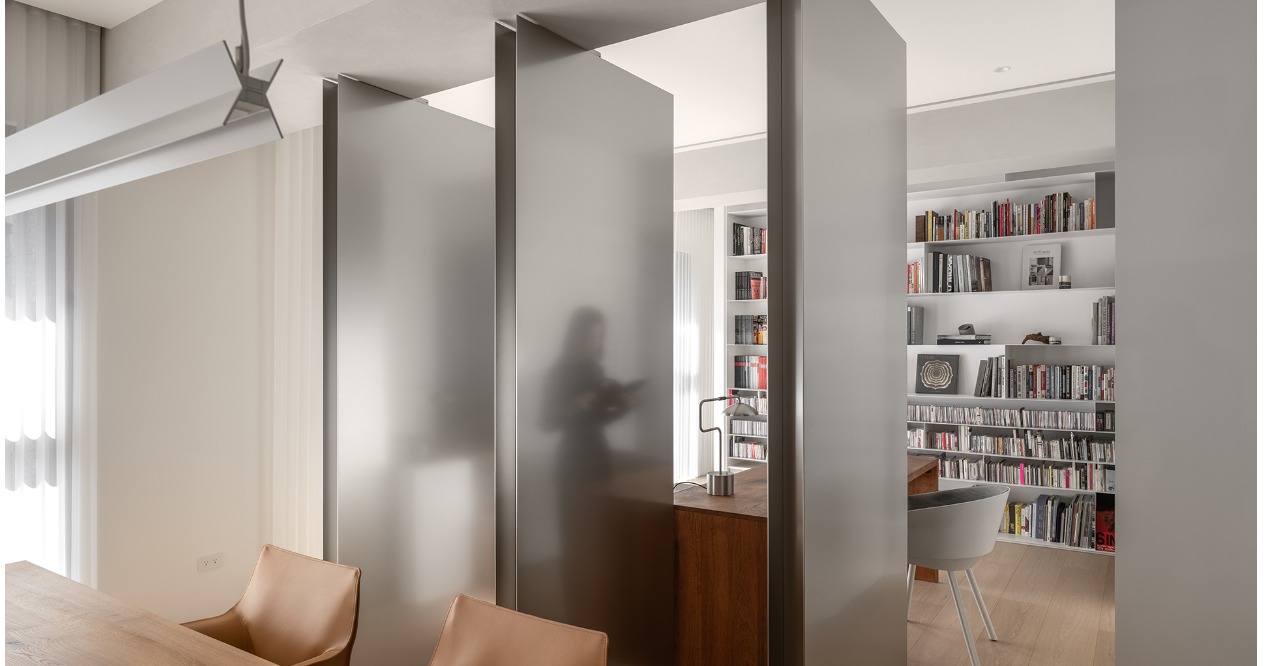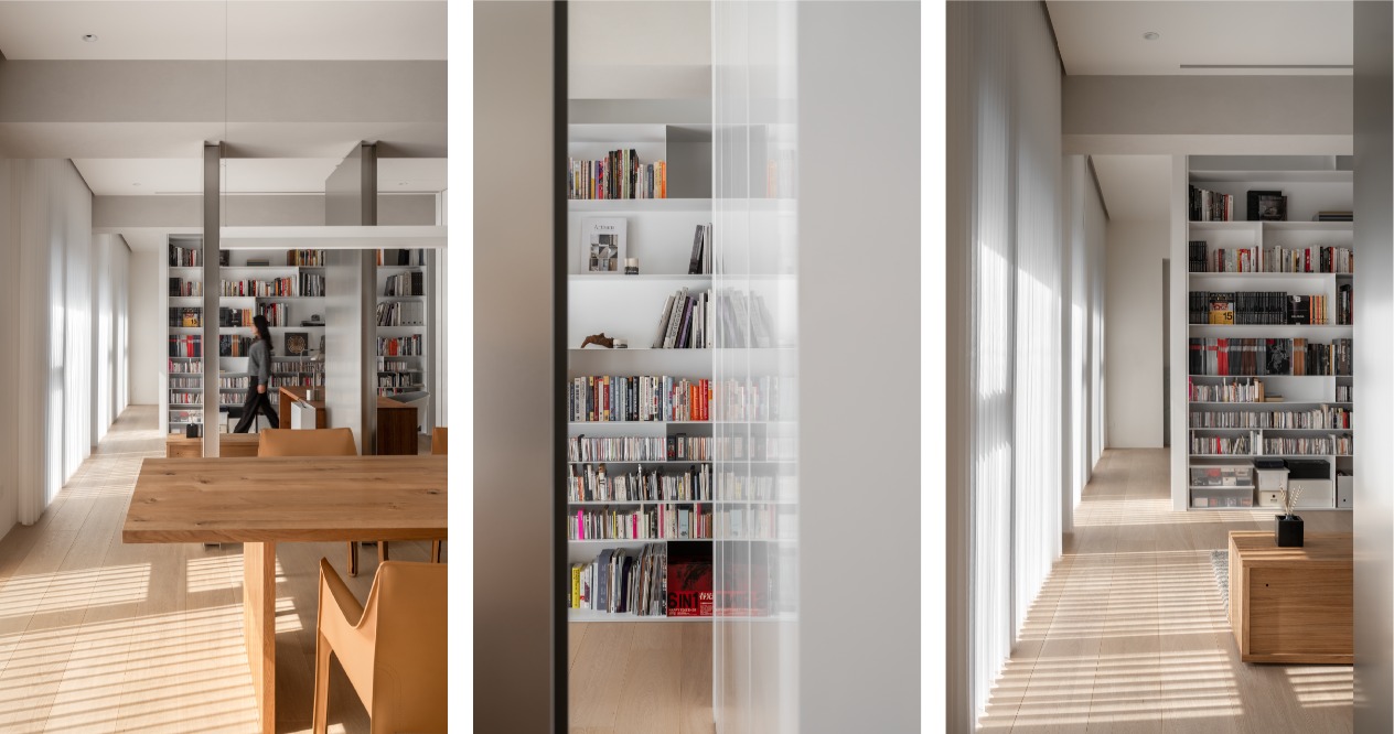 書房及公共空間利用活動式門片作為隔間,以開放流暢的空間格局,讓不同區域在獨立與開放之間自由切換,提升空間彈性。