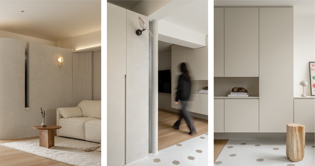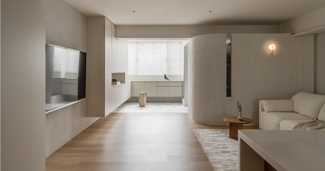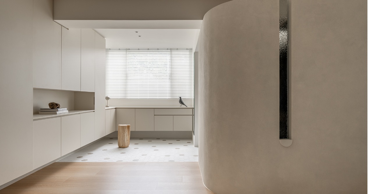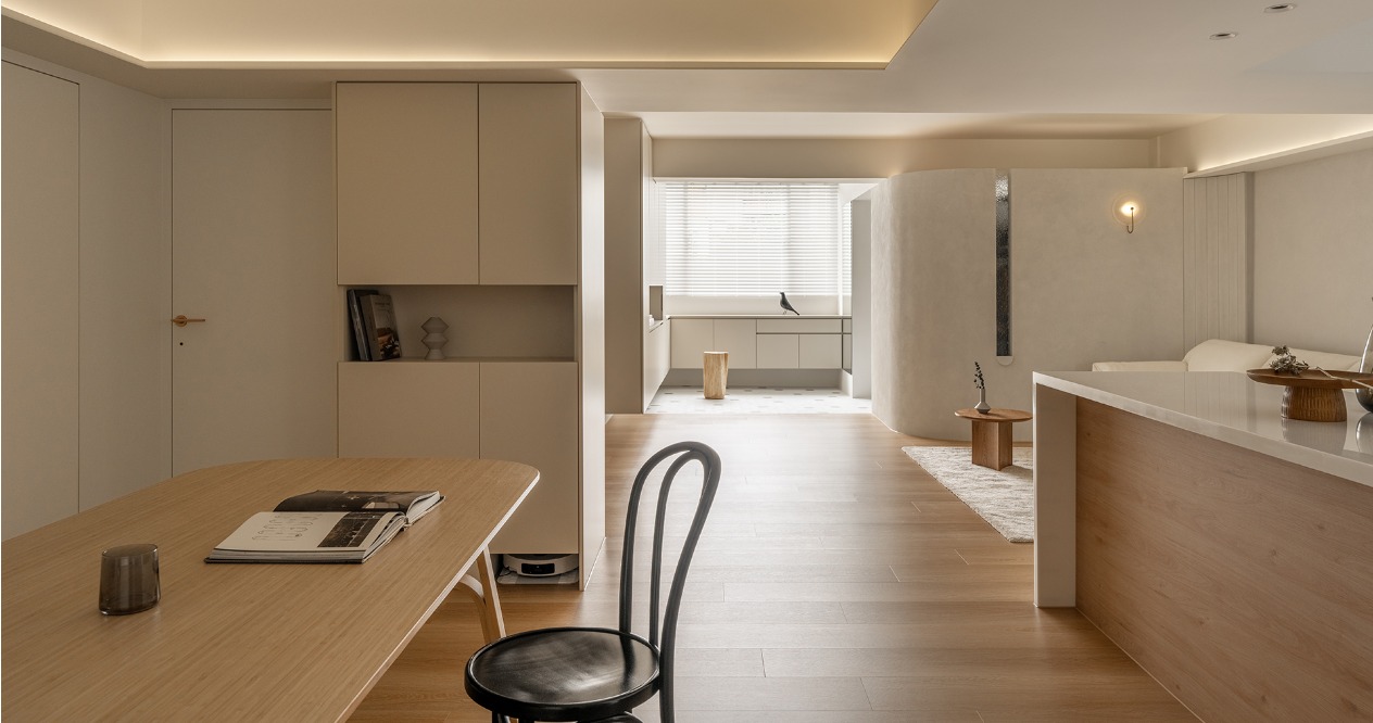 整體以柔和色調鋪陳,搭配弧形牆面,在視覺與動線上注入溫柔的包覆感,讓「回家」成為最放鬆的儀式。透過材質、色彩的運用,形塑出溫潤靜謐的氛圍,減少過多裝飾,讓空間回歸生活本質。