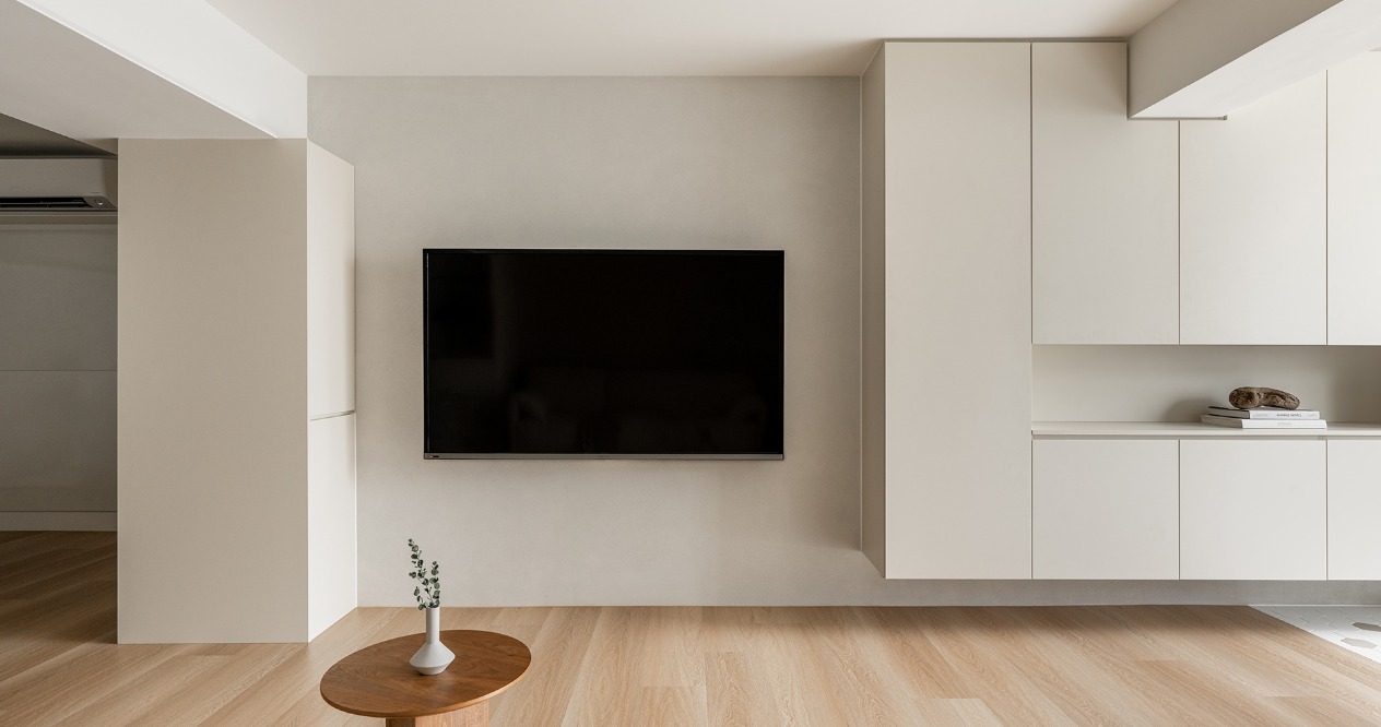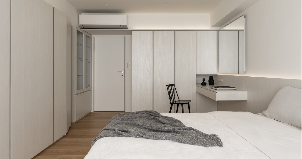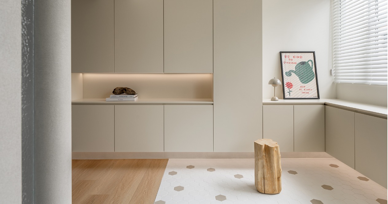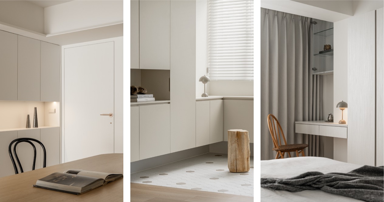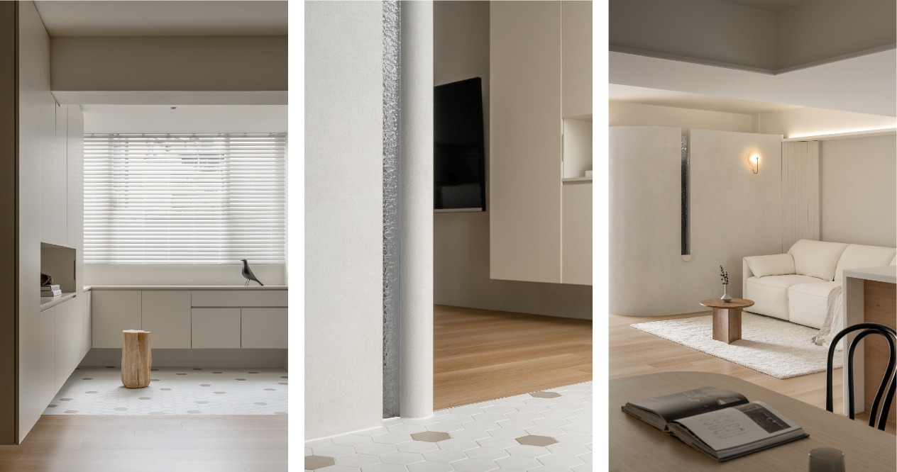 整體以柔和色調鋪陳,搭配弧形牆面,在視覺與動線上注入溫柔的包覆感,讓「回家」成為最放鬆的儀式。透過材質、色彩的運用,形塑出溫潤靜謐的氛圍,減少過多裝飾,讓空間回歸生活本質。