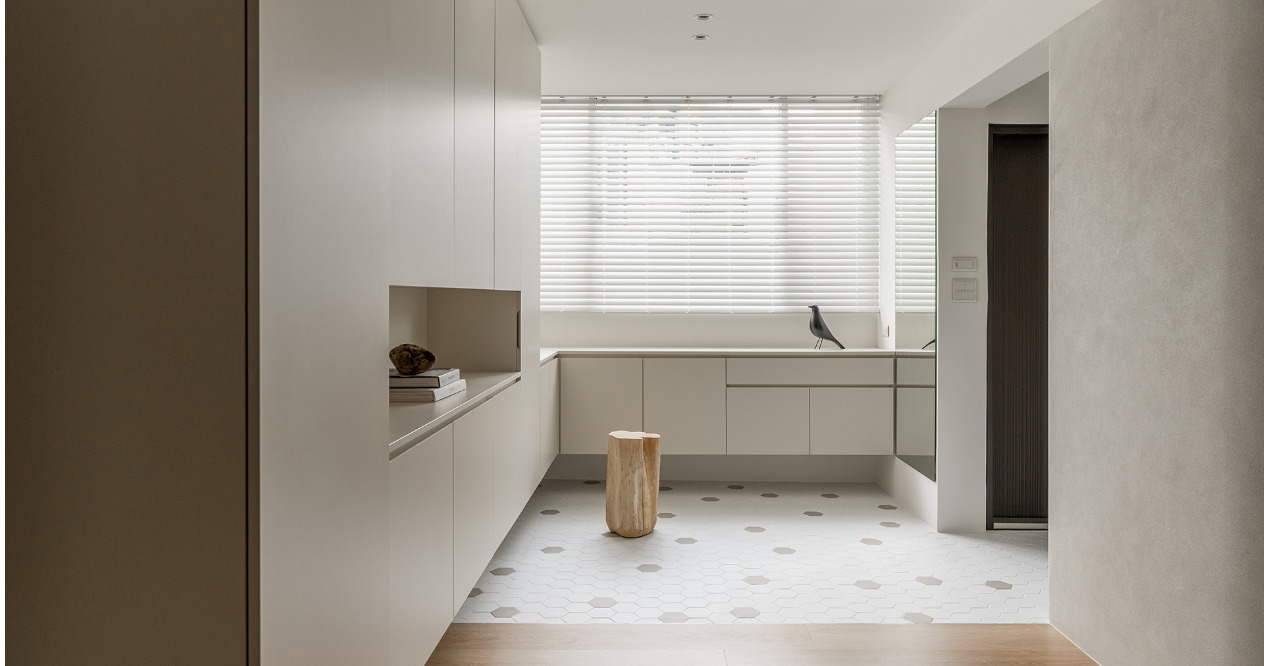 玄關規劃了可停放嬰兒推車的區域,並整合大量收納機能。推門而入,寬敞的落塵區提供了足夠的餘裕能迅速安頓孩子,脫鞋、收納物品的動線一氣呵成,使出門與返家的節奏井然有序。