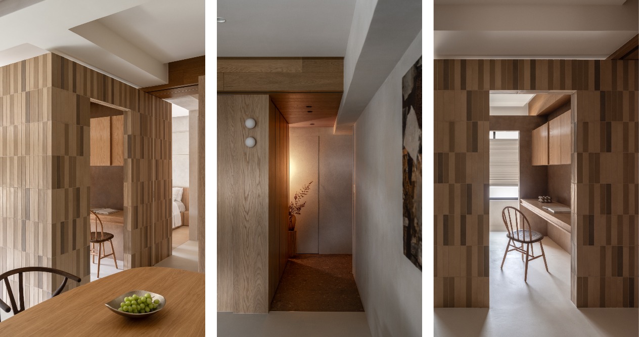動線規劃上,我們以「隅」作為概念。從客廳出發,繞過小盒子進入書房,再銜接至私領域,形成一條迴字形動線。每一次轉彎,都會看見不同的畫面:窗外的光景、牆面材質的變化,或是家中正在發生的生活場景。行走不只是從 A 點到 B 點,而是一段連續的空間體驗,使整體空間更開放、更自由。