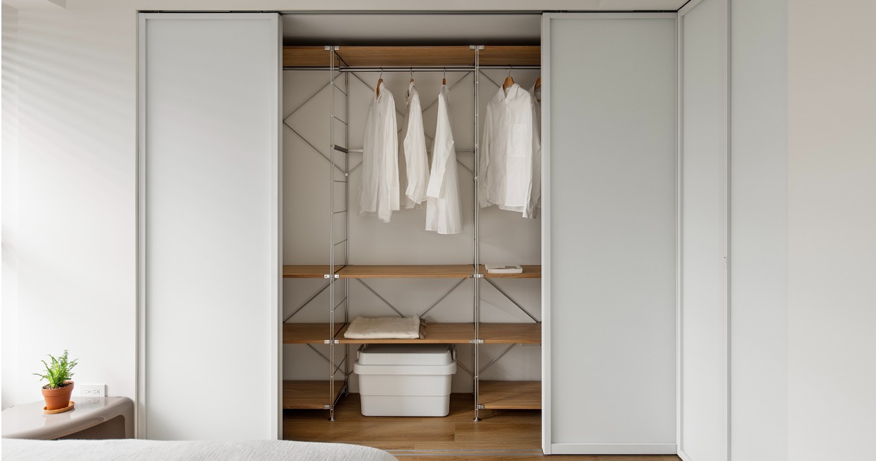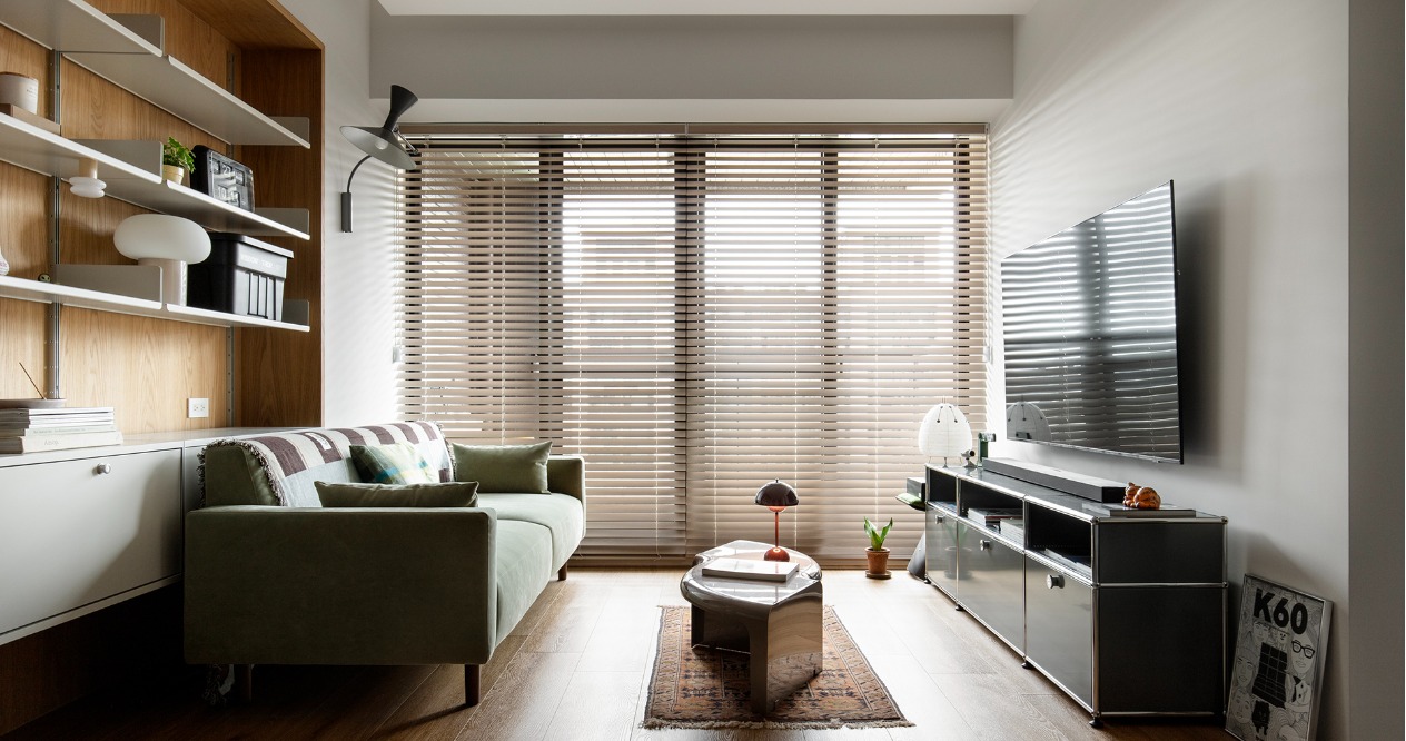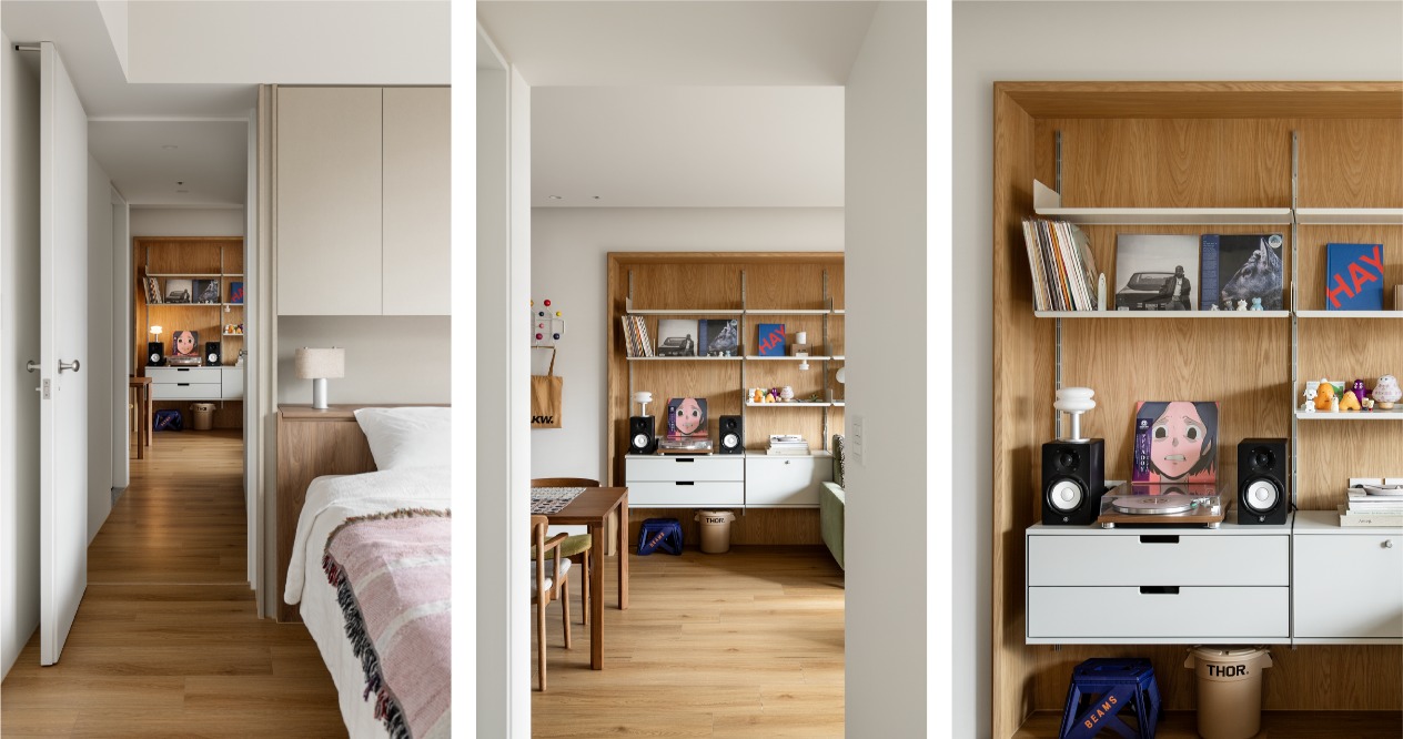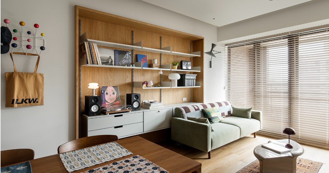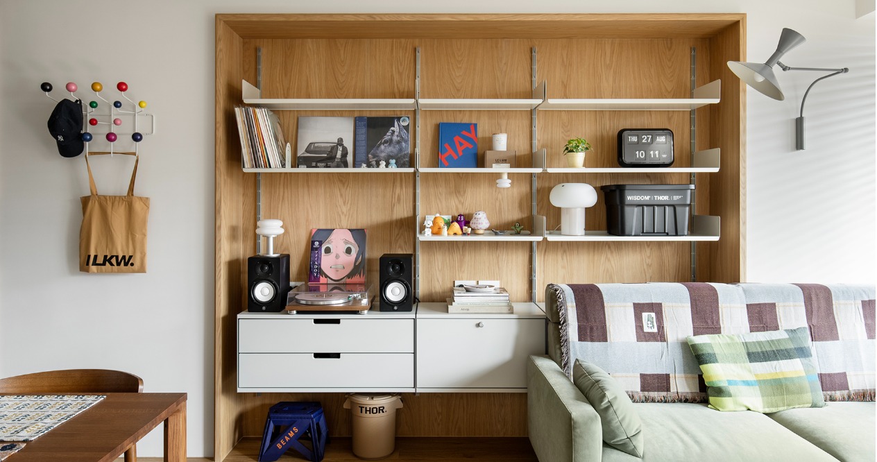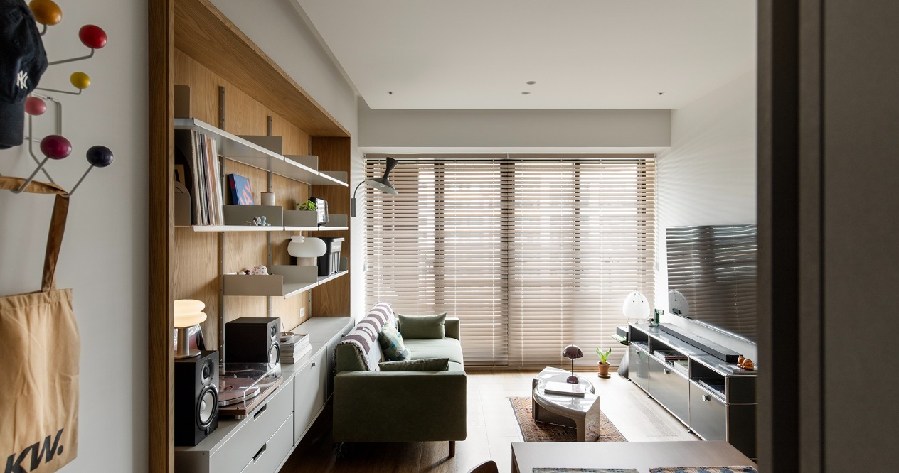 我們捨棄過多的木作硬裝,善用建商原有的畸零空間,將 Vitsoe 606 與 MUJI SUS的系統層架作為核心。這種模組化設計賦予屋主極高的自由度,讓他們能隨著收藏的黑膠唱片、書籍或旅遊紀念品的增加,隨時調整牆面的風景,真正的空間則交由屋主的生活物件去填滿。