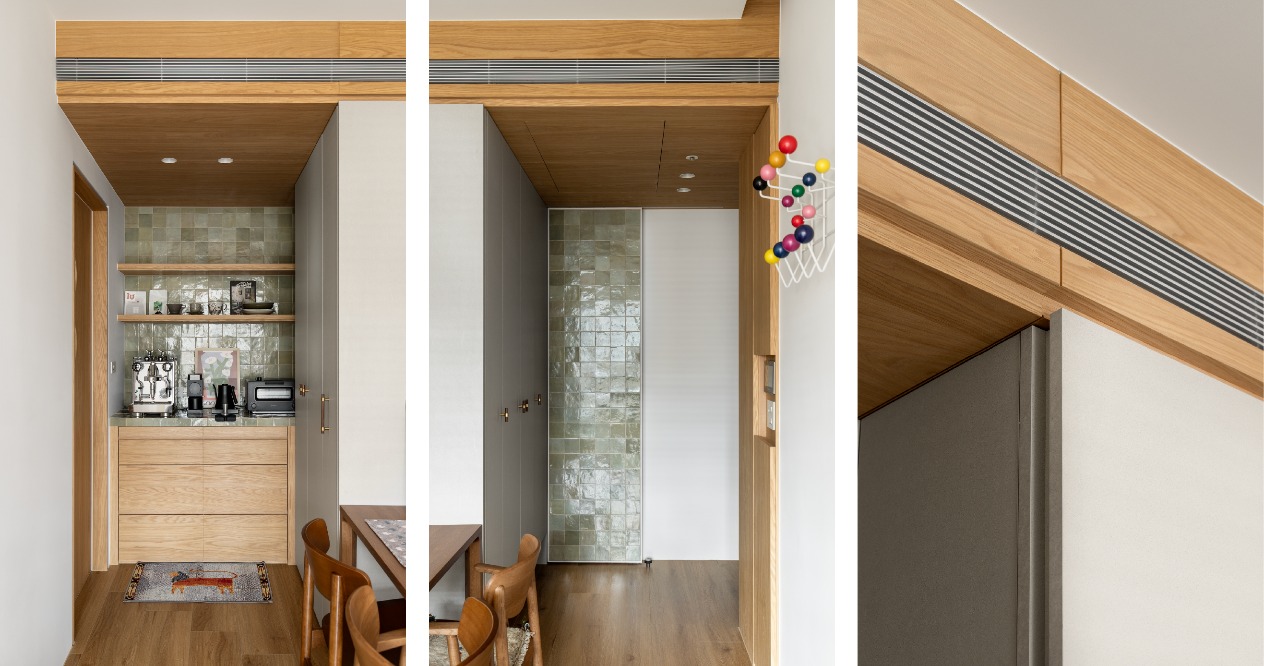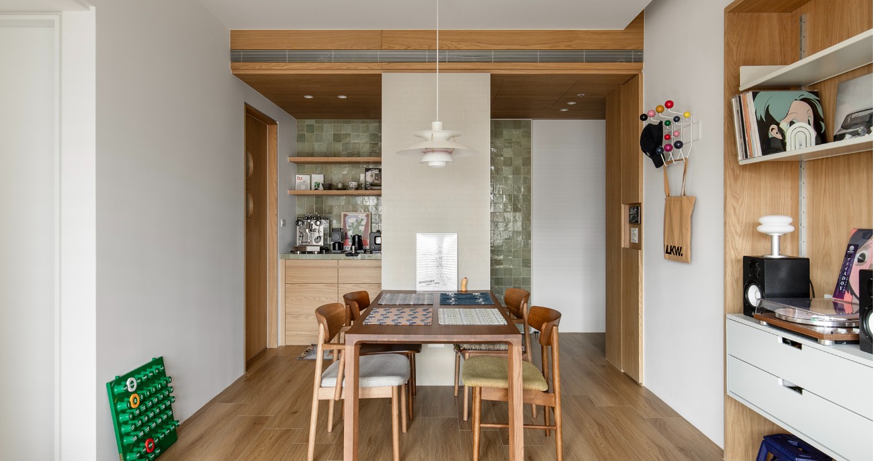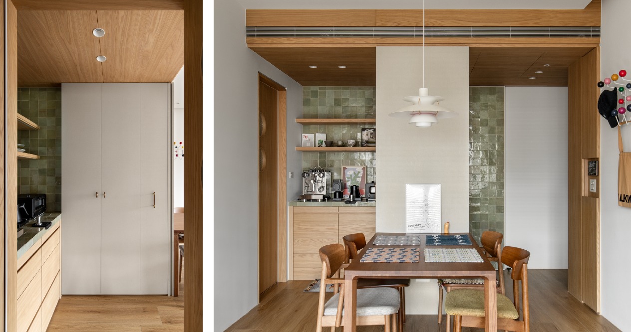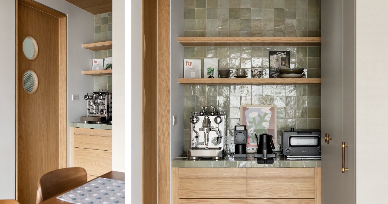 材質運用上,大面積鋪陳溫暖的木質紋理,滿足屋主偏好的溫潤質感;咖啡吧台選用帶有不規則釉面光澤的藻綠色手工磚,透過色彩與質地的對比,與沙發形成呼應,為空間增添層次與記憶點。