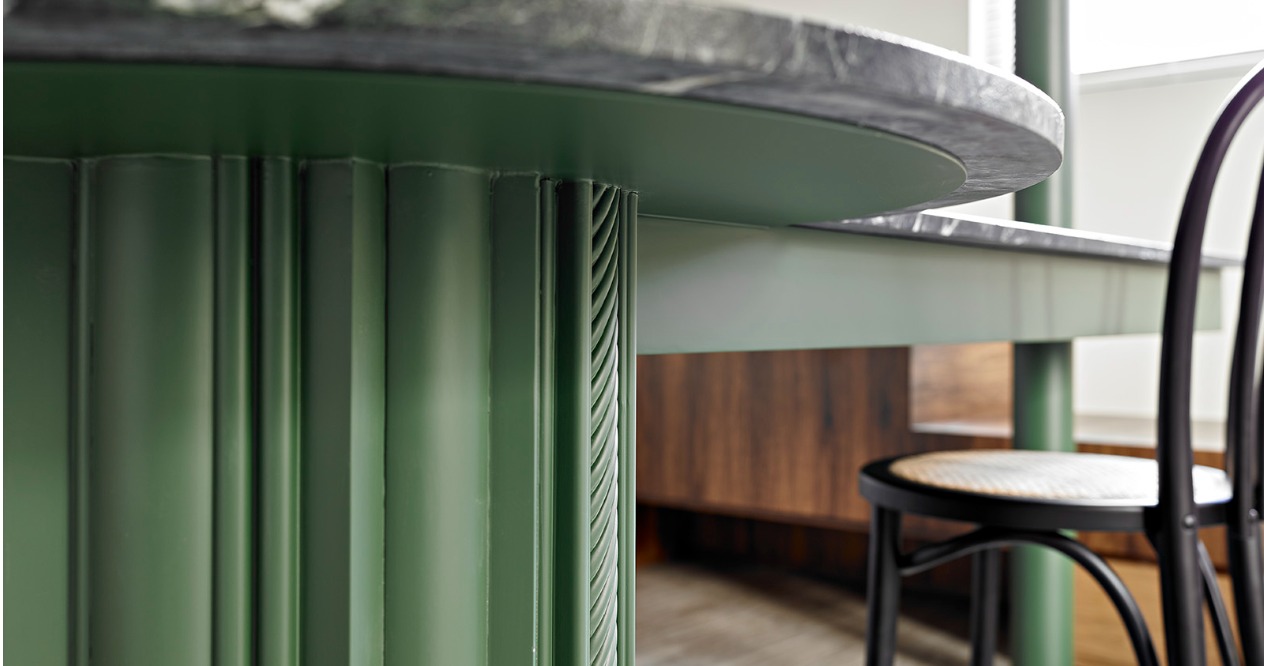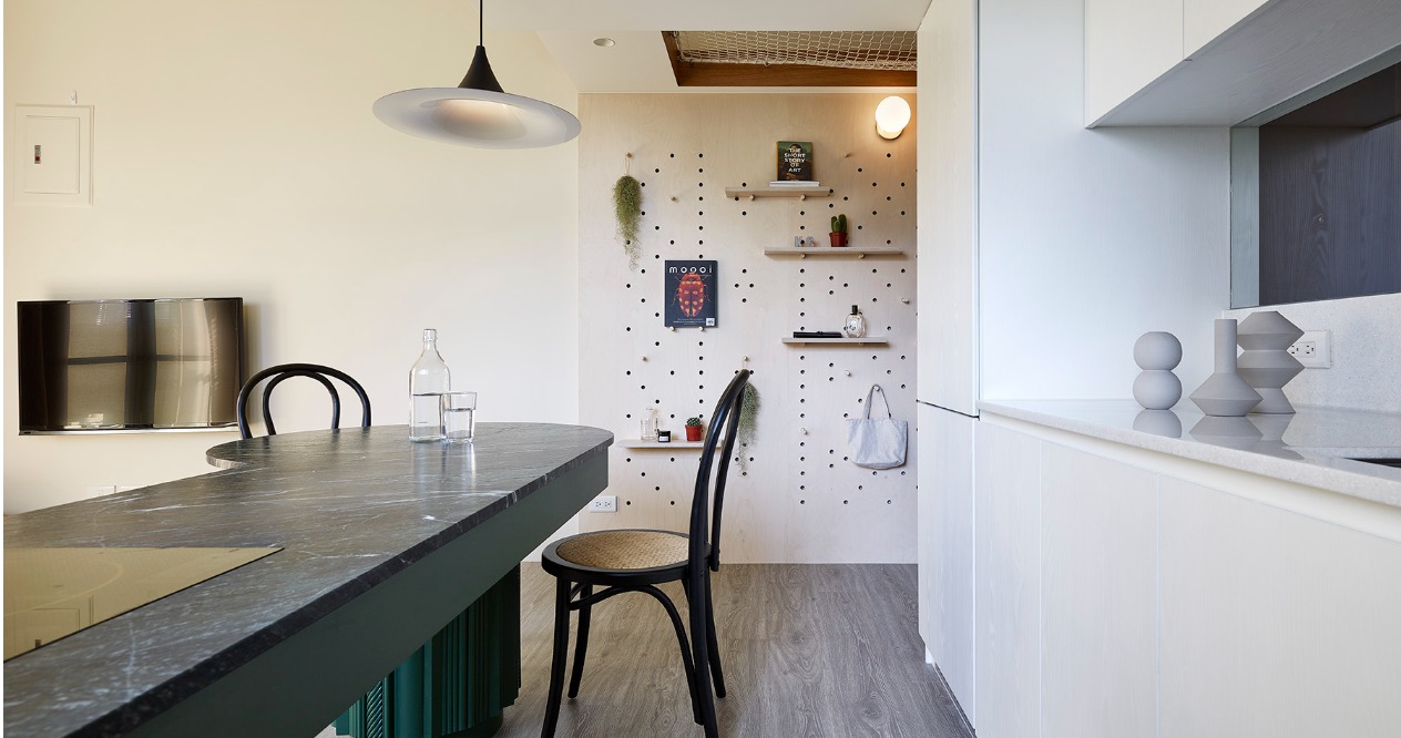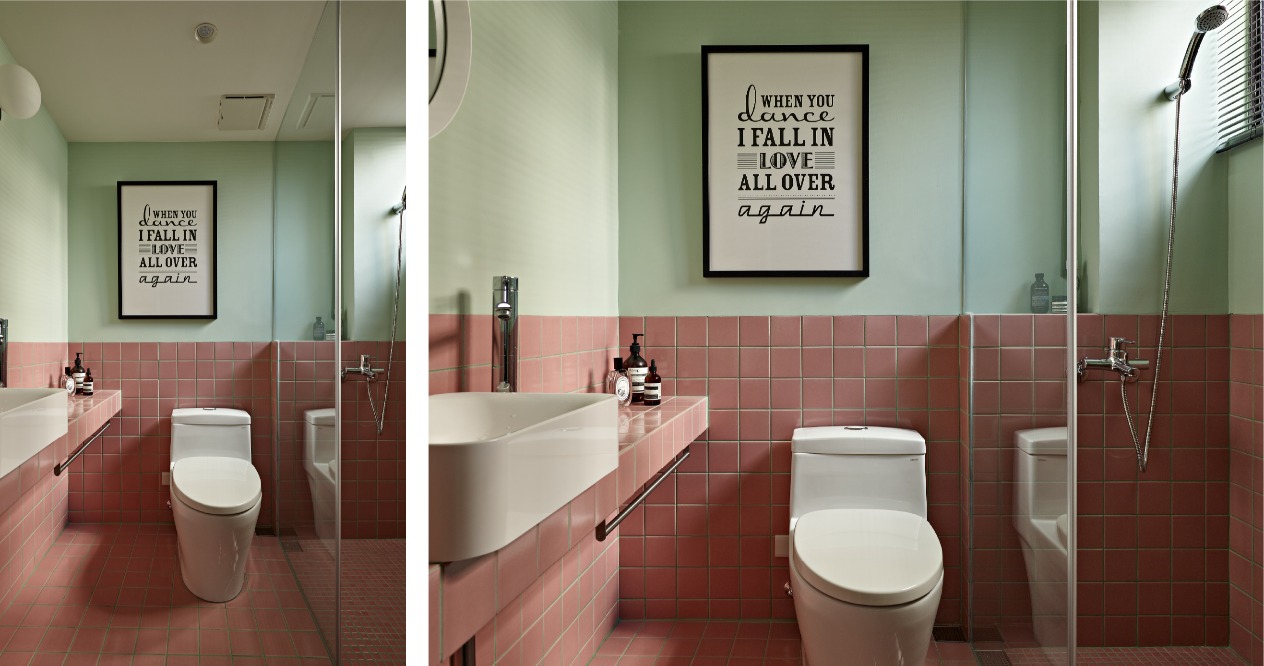 屋主偏好簡潔的設計,但我們更樂於知道他風格喜好及生活細節,因此在空間整體性上採樸實的分割及材料做為基礎,而在生活最中心的位置上,我們採不同的西式線板做為組合再搭配台灣蛇紋石,質感上呈現立體細緻的漆面和粗曠但不生硬的自然面。最後在衛浴空間中,以粉紅色的釉面磚搭配薄荷綠的牆面收尾,希望整體空間除了舒服舒適外,也能在角落處有著特別的感受。
