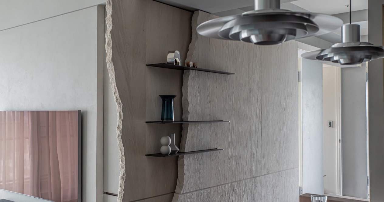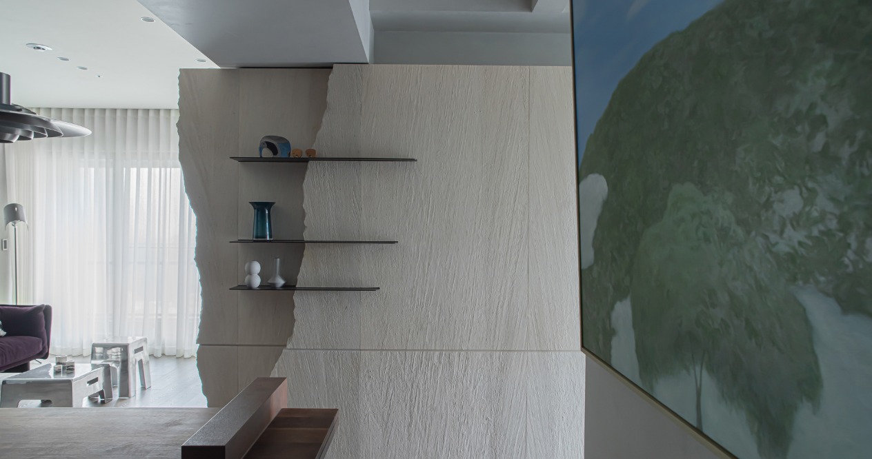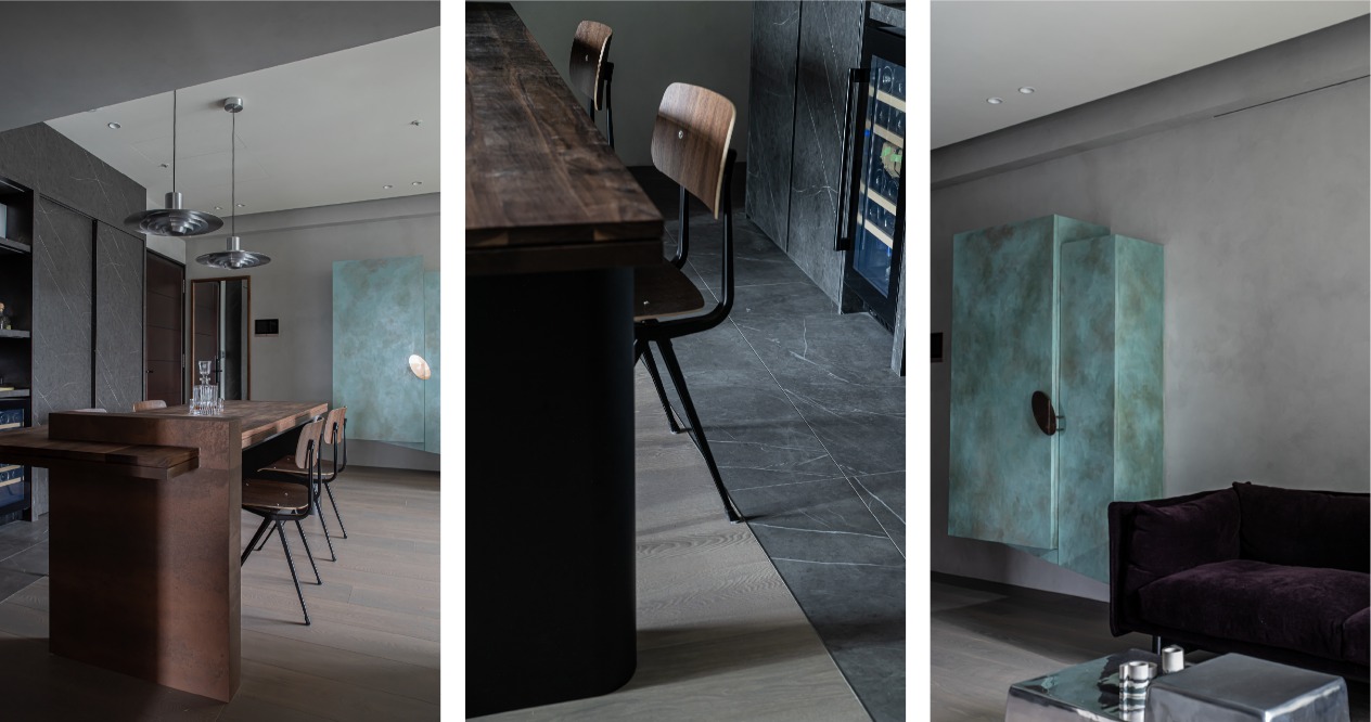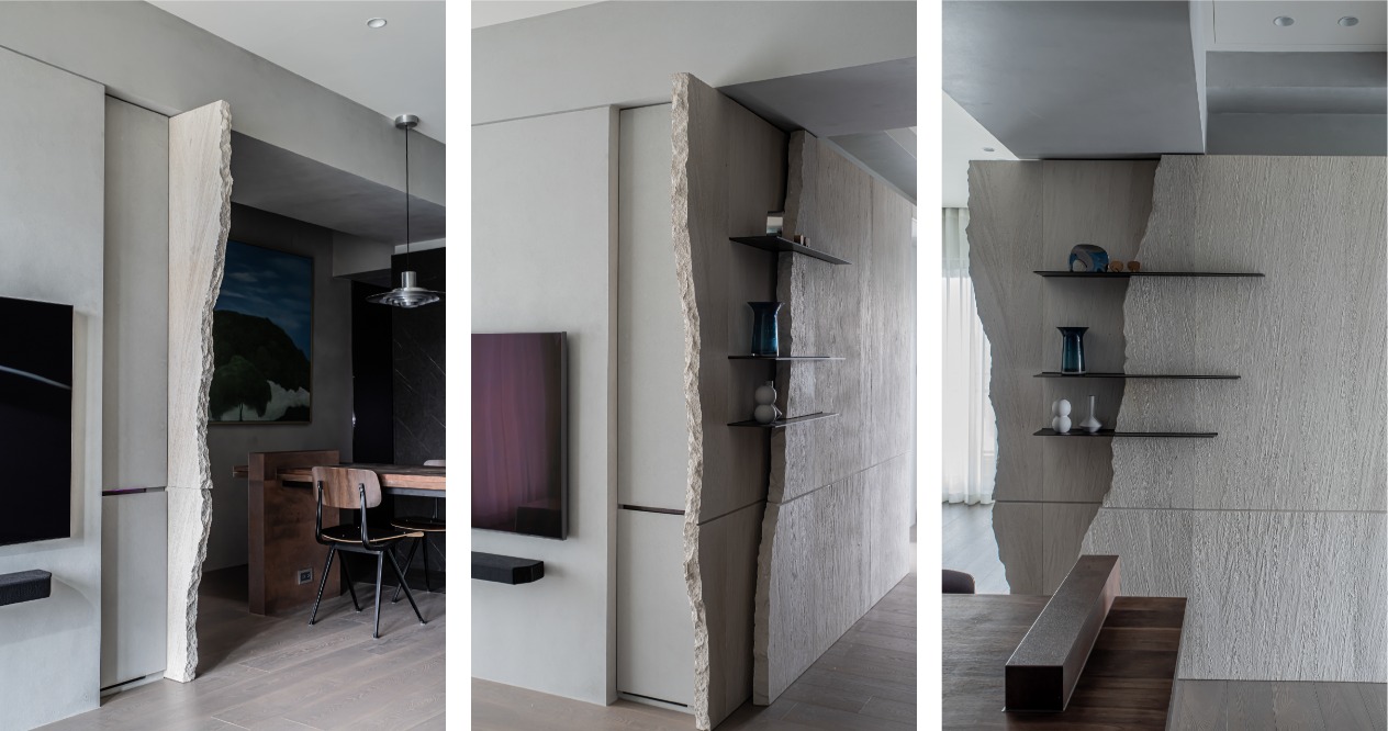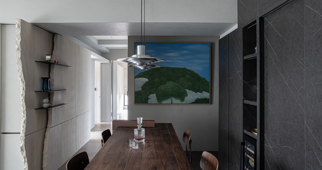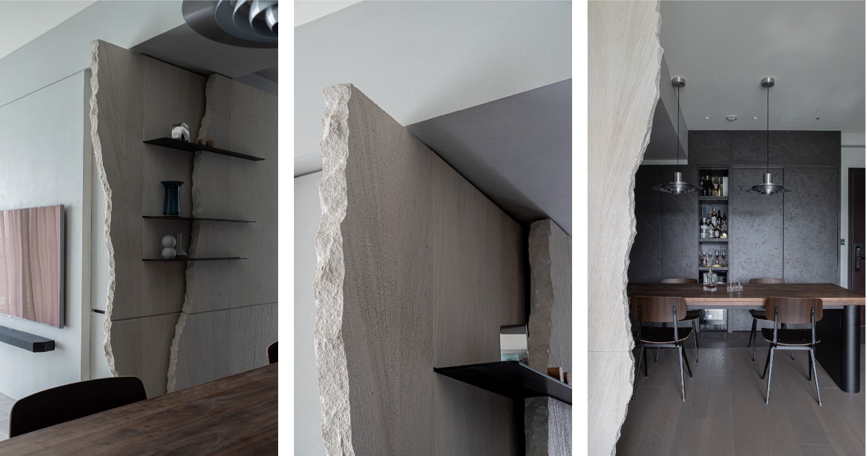 從客廳通往每個房間的動線較為冗長,因此我們以木化石的拼接作為連續表面,伴隨其豐富的紋理,沉穩延伸的牆面並非一成不變,並以上凸下凹的結構,在注重美學的同時,兼顧孩童跑跳的安全。在收邊的細節加入人工敲打的鑿面與張裂的手法,以自然的裂紋此詮釋木化石的天然性。餐廳採用黑色的石紋磚,搭配具備收納功能的黑色櫃體,選用胡桃木的實木桌,在色調上與石紋材料板及鋪面達成和諧,並以LED燈光襯托酒瓶杯具的質感,讓屋主閒暇之餘,在家就能享受小酒館的氛圍。