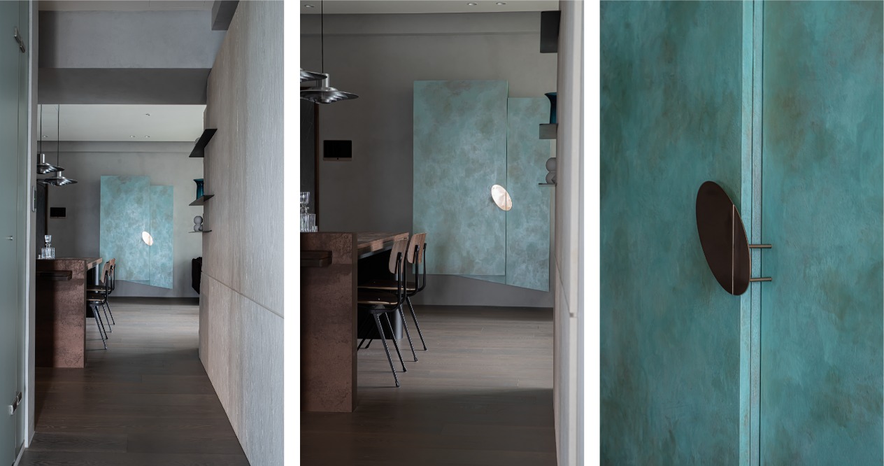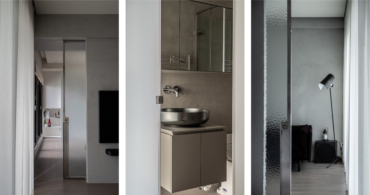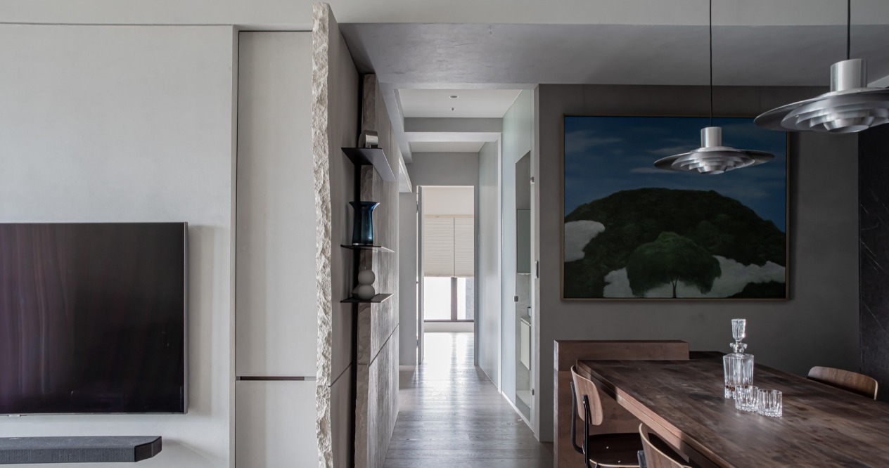 我們發現既有的樑與窗有著先天的韻律感,因此天花不採用全面包覆的構想,取而代之的是刻意將樑裸露,並配合樑的方向安排深度不一的隔間牆。讓狹長的走道空間能夠透過漸進式的L型序列,在視覺上產生節奏轉換的效果。整體空間以屋主喜愛的水泥質感定調,而女主人喜歡木質風格,因此我們加入了具備溫潤色澤的木化石作為材料,中和以冷調為基底的空間色溫。由於水泥、木化石以及木頭的彩度偏低,為了讓年幼的孩子能夠在空間中感受到顏色的變化,因此鞋櫃使用藍色帶金色的藝術漆;餐桌腳採用鏽鐵的粗獷配色;沙發則選用暗紫色的絨布材質,透過搭配這些高彩度的物件,達到畫龍點睛的效果。