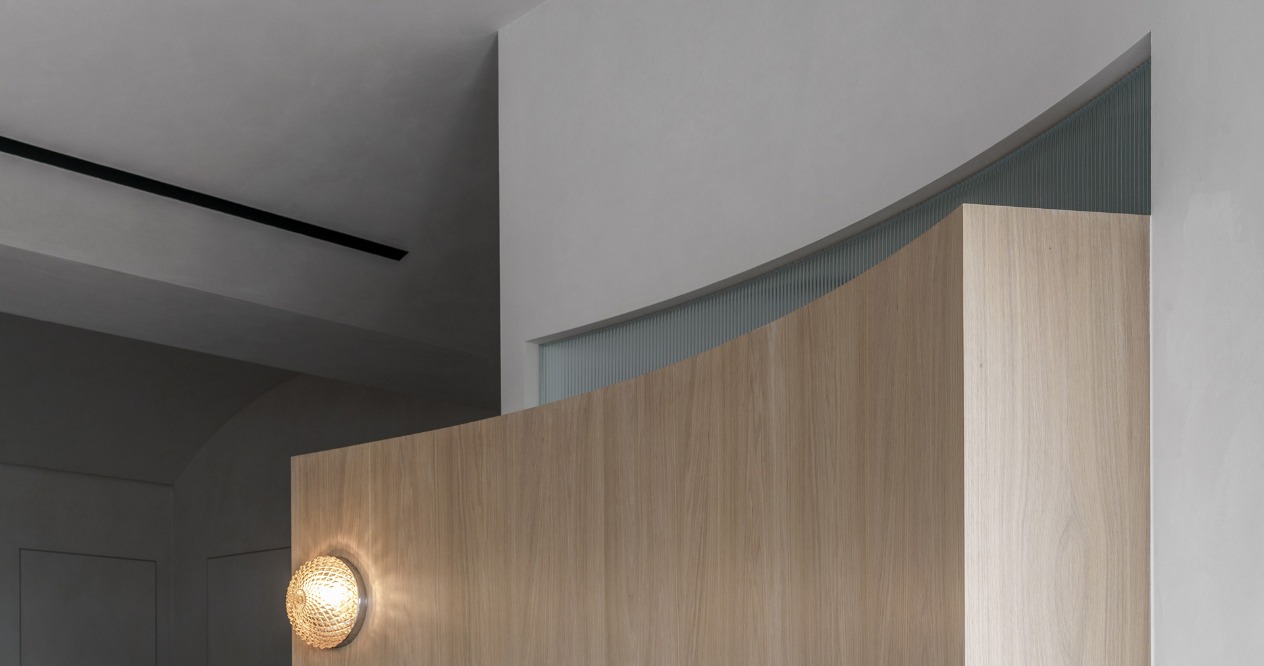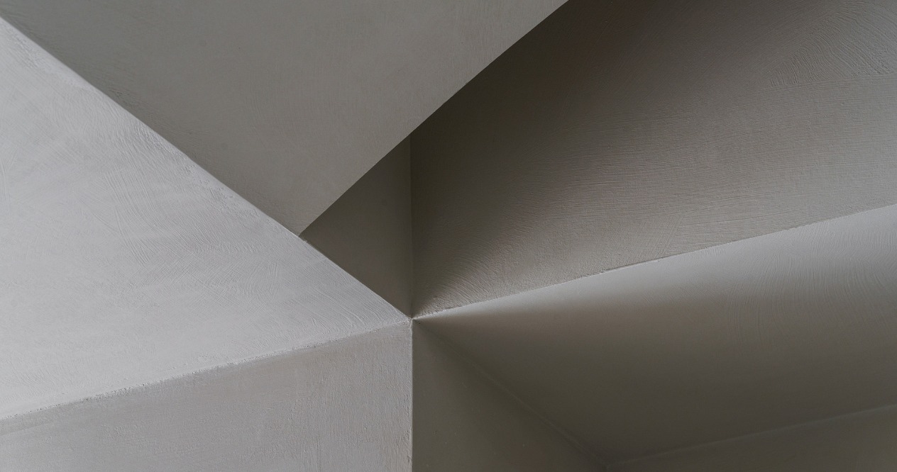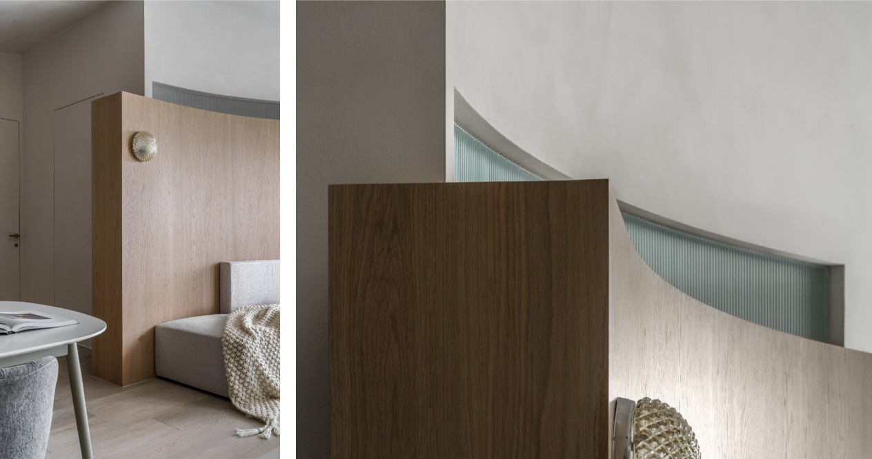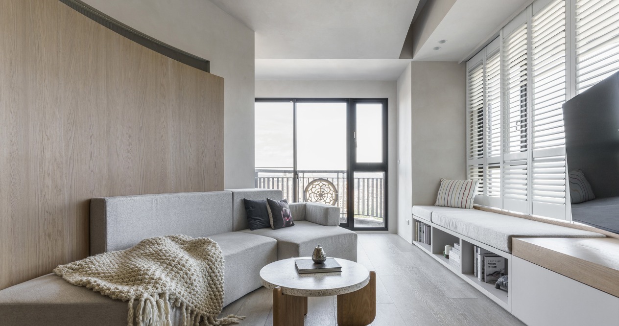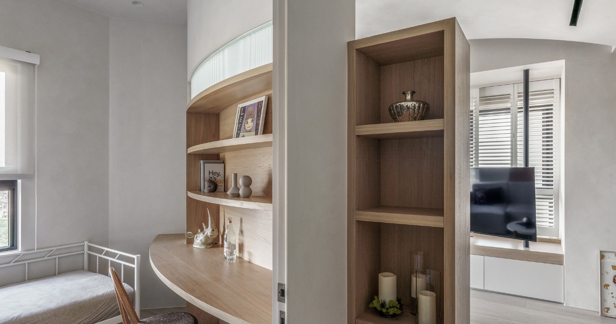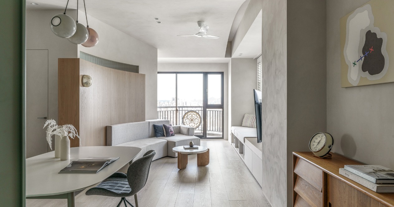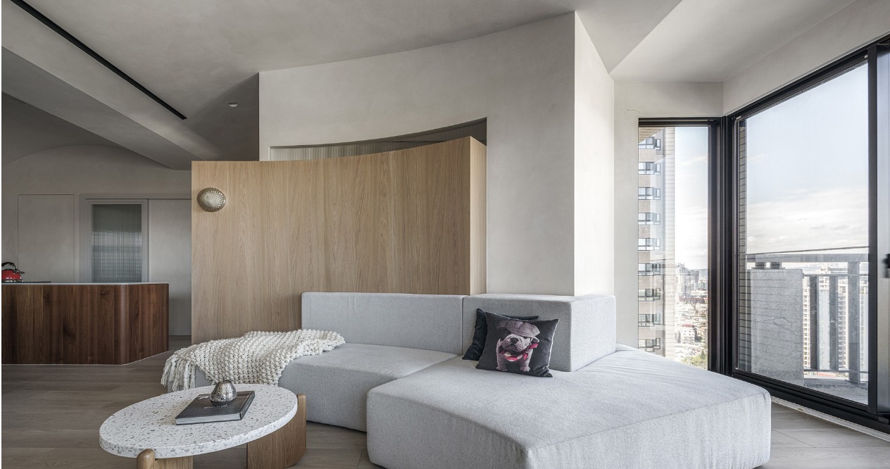 考量電視在多面採光的空間中會有反光問題,我們將客廳做斜向的安排並搭配旋轉電視架,可將戶外景色的延伸至室內,並避免不同時段的陽光反射。弧形牆面及天花交錯形成雕塑感的造型,讓原有大樑能隱藏其中,些許凹陷的沙發背牆提供客廳包被感受及順暢動線。