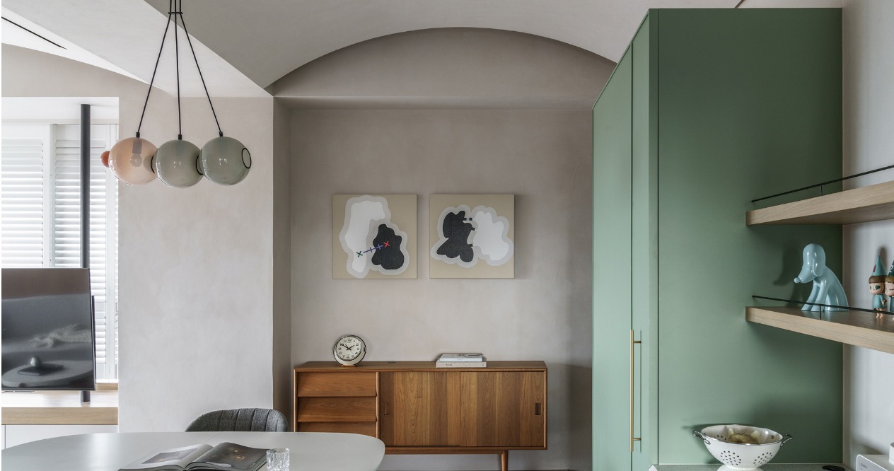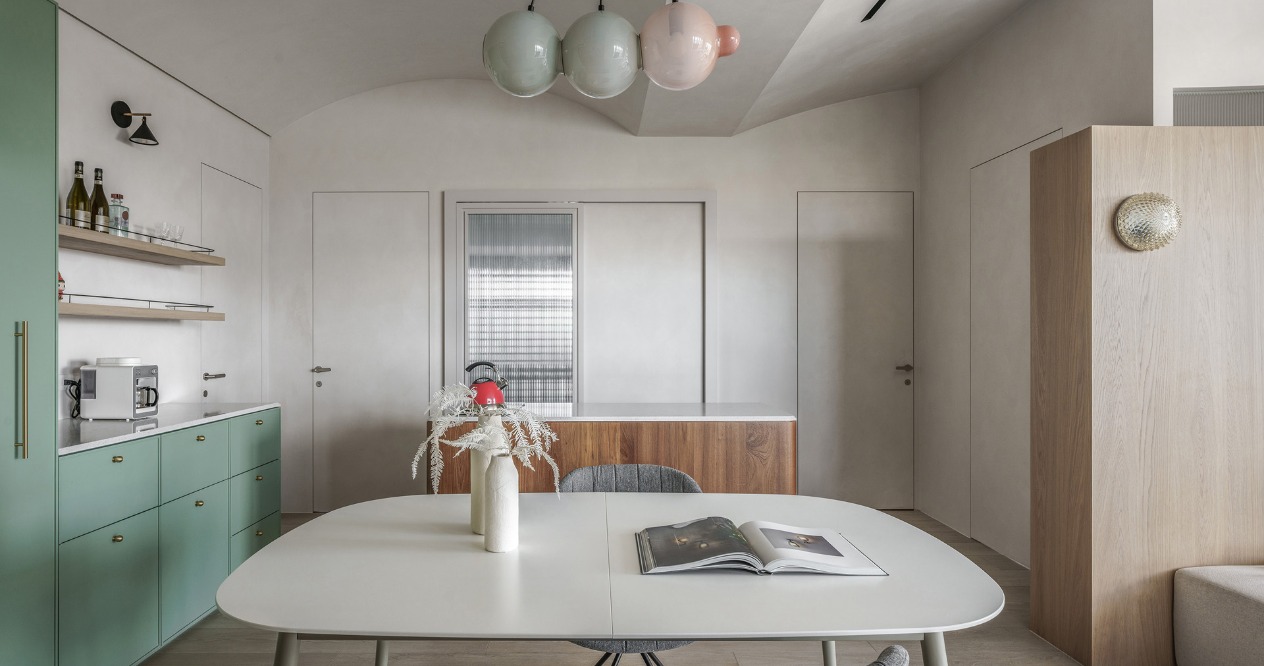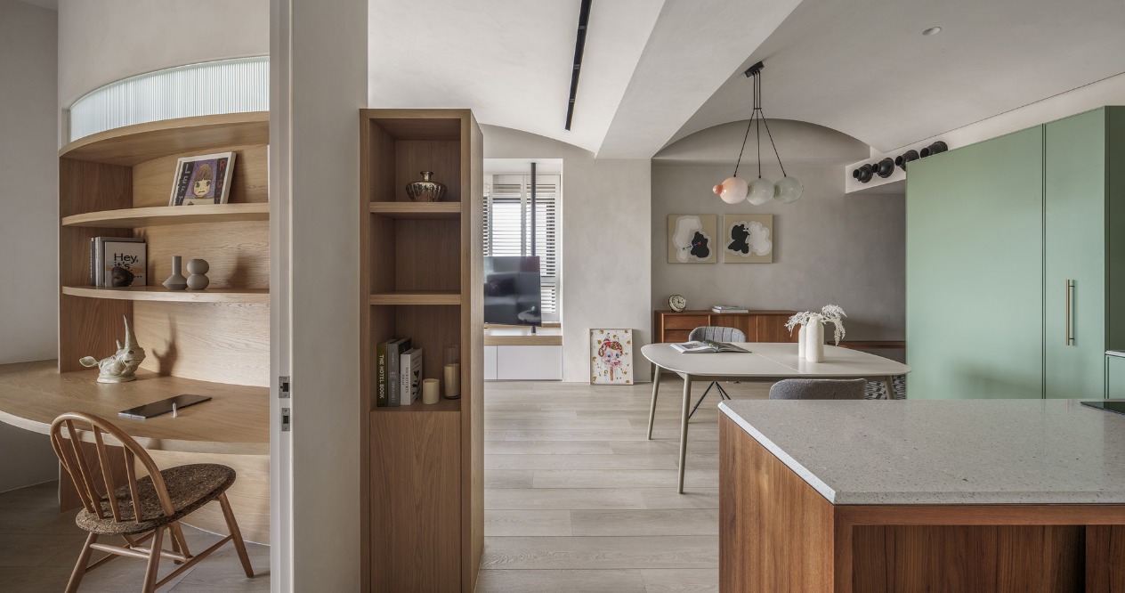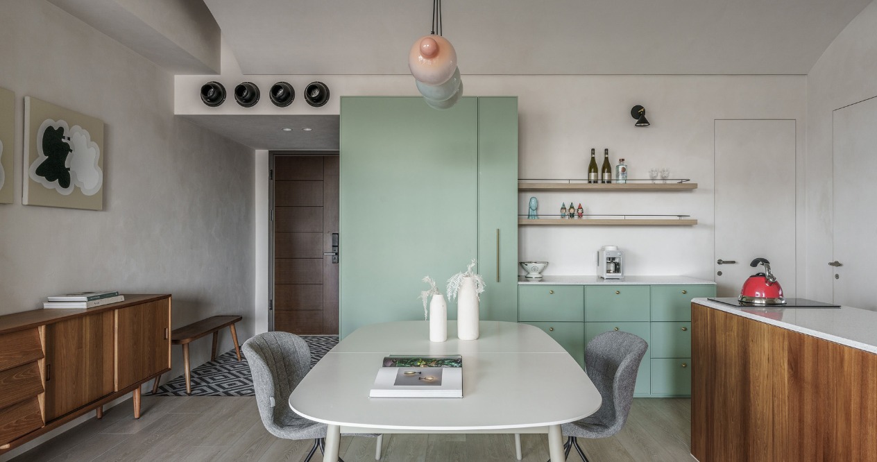 開放空間的天花與牆壁使用淺灰色的灰泥,帶有些許粗曠的質地使得光影在有機造型上表情更為豐富,再搭配淺色木地板及局部柚木材質增添溫潤自然感,最後以灰綠色及花磚作為空間亮點。