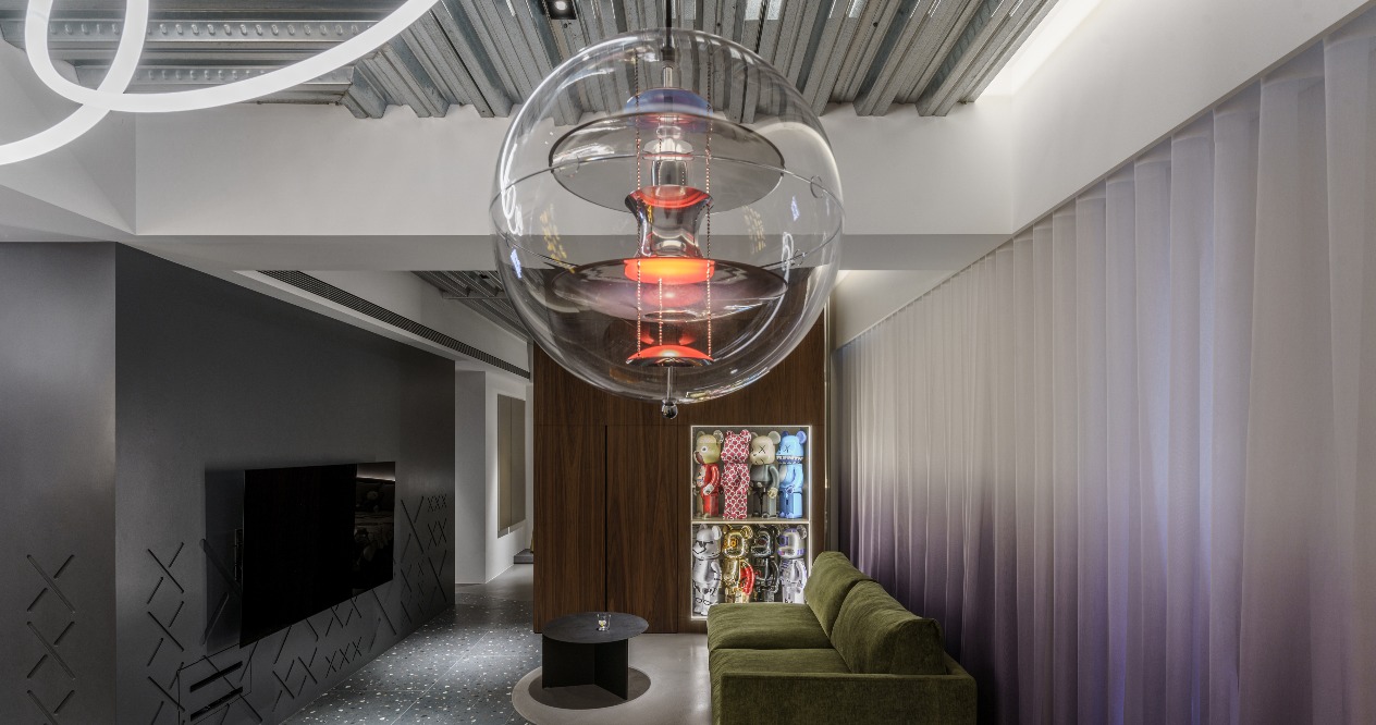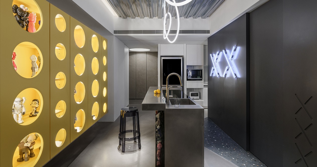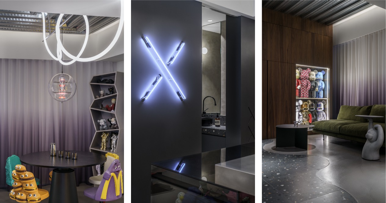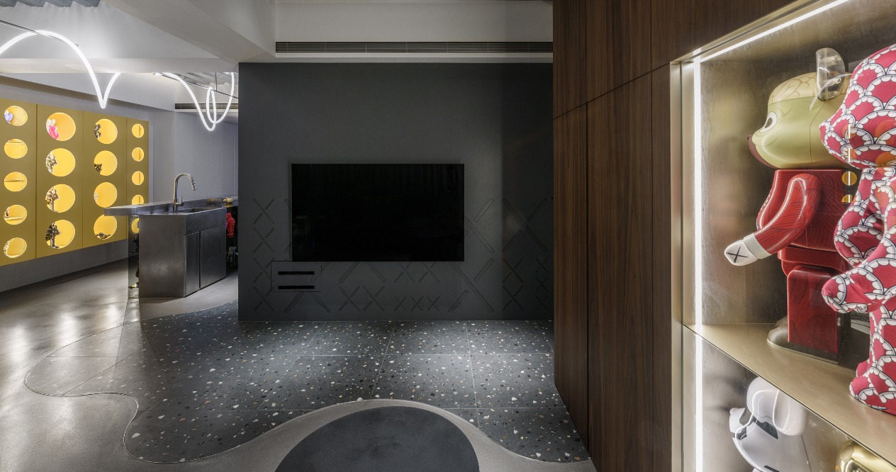 The neutral grayscale colors are adopted for the overall space to highlight the figurines as the important roles in the home. The XX design on the wall refers to the eyes of KAWS to achieve the style consistency between the large area structure and small details. The DECK boards of the simple industrial style are used on the ceiling accompanied by neon tubes to add some cyberpunk illusion between reality and virtuality. The floor lines with both penetration and fluidity highlight the owner’s avant-garde style and unrestrained personality.