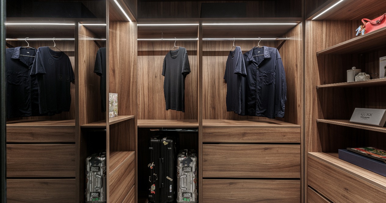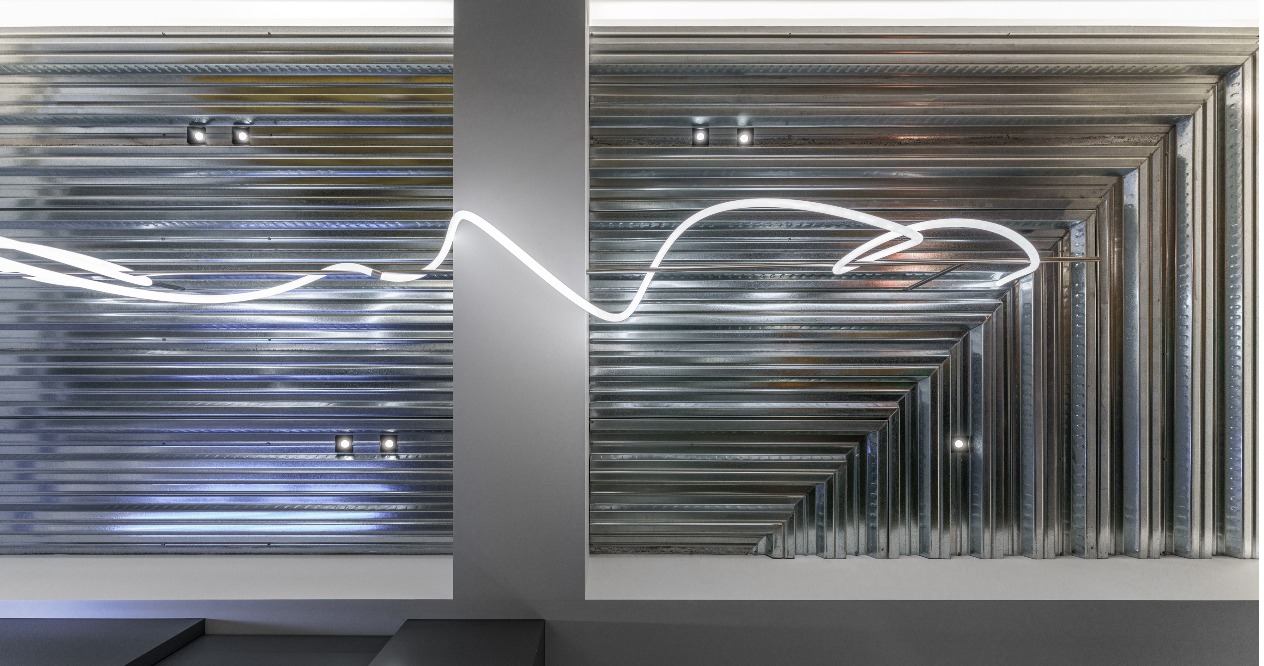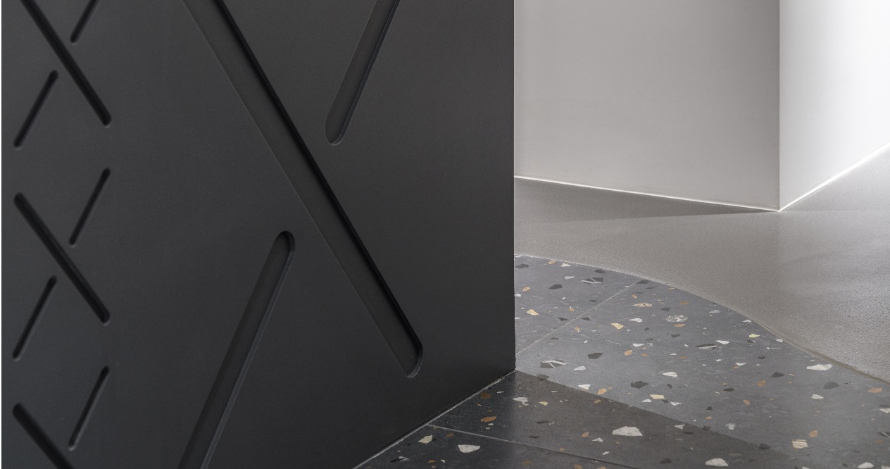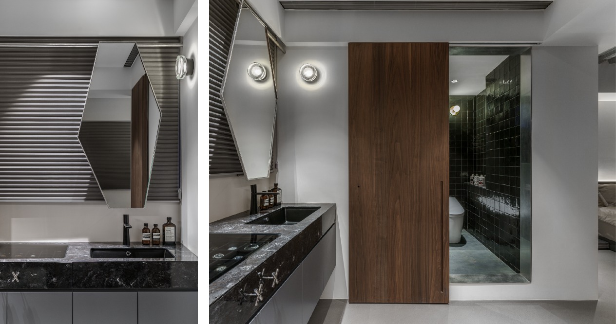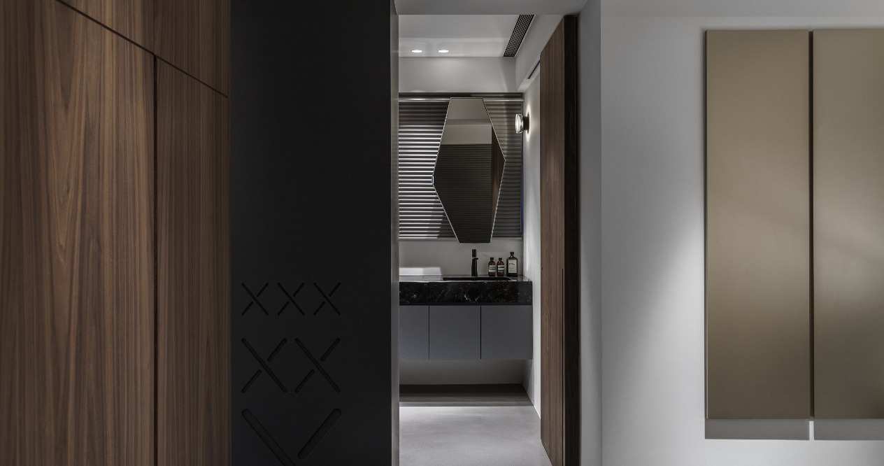 The neutral grayscale colors are adopted for the overall space to highlight the figurines as the important roles in the home. The XX design on the wall refers to the eyes of KAWS to achieve the style consistency between the large area structure and small details. The DECK boards of the simple industrial style are used on the ceiling accompanied by neon tubes to add some cyberpunk illusion between reality and virtuality. The floor lines with both penetration and fluidity highlight the owner’s avant-garde style and unrestrained personality.