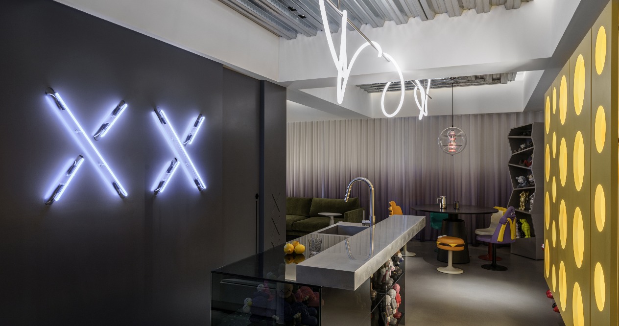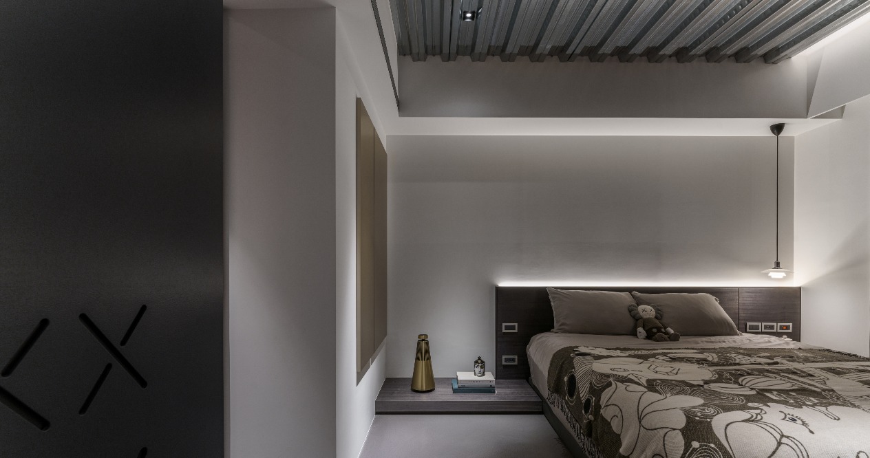 整體空間主要採用中性的灰階色調,凸顯公仔才是家中要角,而牆面XX的設計,便是參考KAWS的眼睛,讓大面積結構與小細節風格達到一致的調性。天花選用簡潔工業風的DECK板,搭配霓虹燈管增添些許cyberpunk般虛實交錯的迷幻,並以滲透與流動感兼具的地面線條,彰顯屋主前衛的風範與不羈的個性。