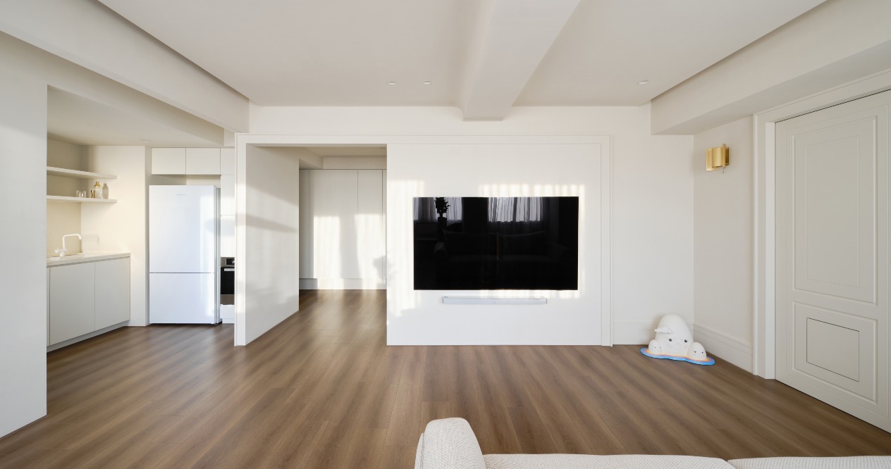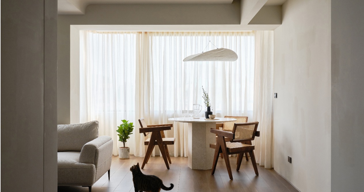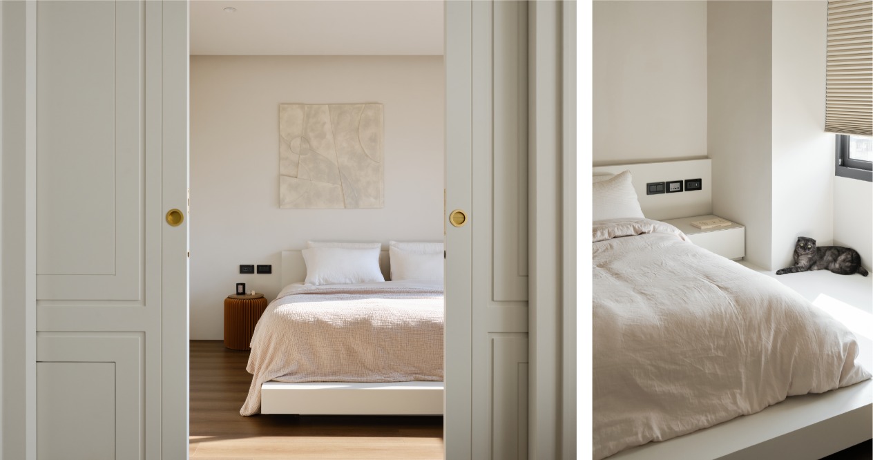 入口玄關的整面鞋櫃提供充沛的收納量能,轉彎後進入客、餐廳相連的開放式空間,透過大面玻璃創造蔓延至室外的寬闊視野。一人二貓的生活無須追求絕對的隱私,採用雙開拉門的設計,讓主臥更流暢地連動其他場域,開門後提升的流動性與層次感,讓整體空間更為寬敞,並用線板造型隱藏貓咪自由進出的活頁門。臥室內以延伸至窗邊的架高平台取代既有床架,讓人貓共享慵懶的午後陽光。更衣室落地鏡的滑動設計,能彈性選擇遮蔽的區塊,兼具放大空間的效果。