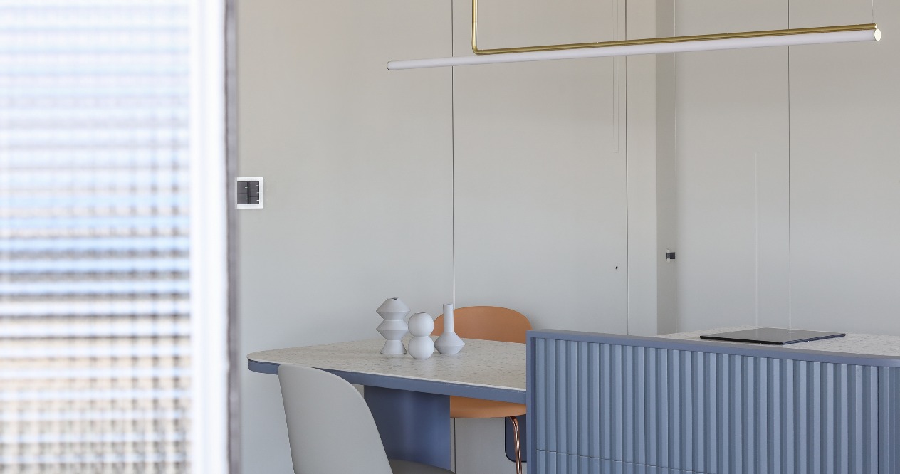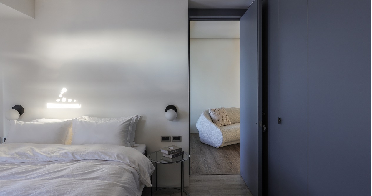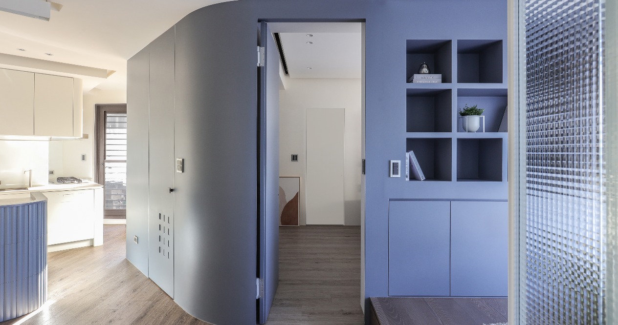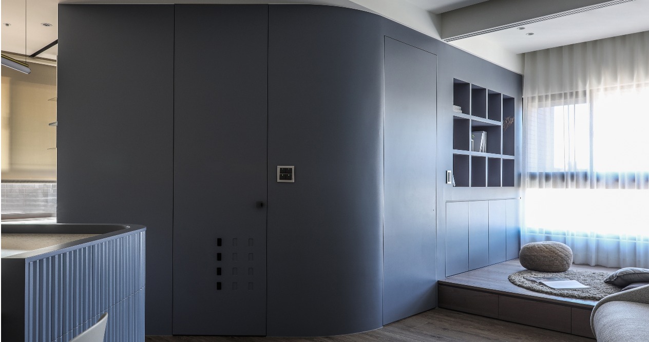 整體調性以藍色作為空間的重點色調,選擇明亮的色彩,不僅能放大整體視覺的效果,還能進一步強調圓弧的櫃體結構,為空間注入清新活潑的氣息。