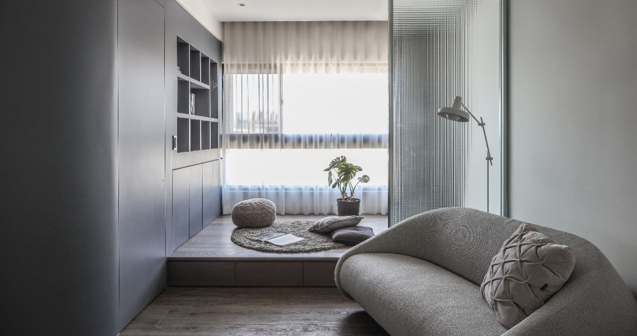 原本的田字型格局雖擁有三房兩廳,但因空間的限制,讓每個空間都不算寬敞。雖然各有其功能,但整體感覺卻顯得有些擁擠。為了改善這一點,決定取消原先的配置,改採用主軸線(格局)拉斜,目的是為了拉寬各個空間的寬度,並透過開放式的配置,讓空間感更為開闊,引入更多自然採光。