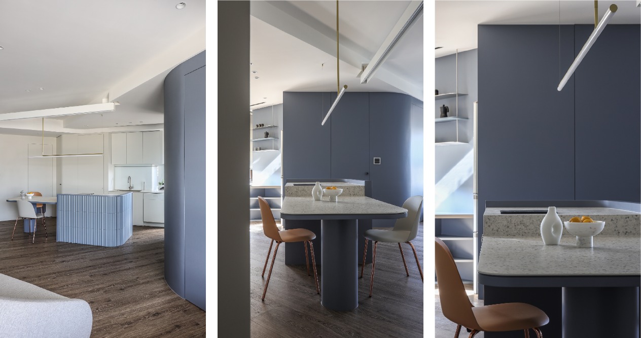 家中的配置以廚房中島為中心,我們將屋主最常活動的場域濃縮,把電視牆與廚房中島結合,讓生活圍繞著這個中心展開。除此之外,空間的輪廓以弧形導角收邊,主要是考慮到小孩與毛小孩在開放空間中自由穿梭的需求,創造更多親子之間的互動與聯繫,共同享受生活中的每個時刻。